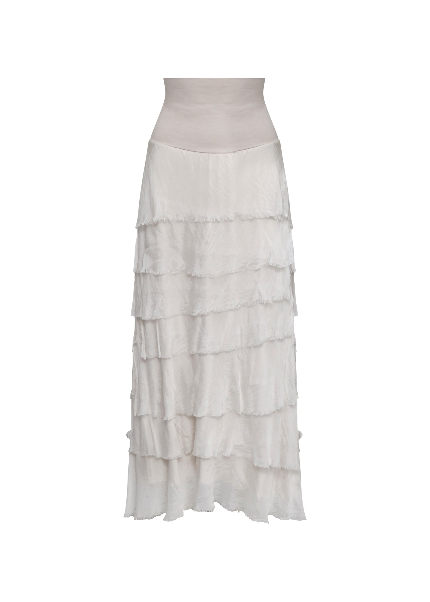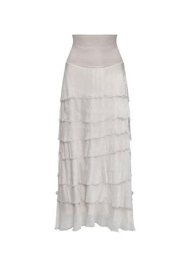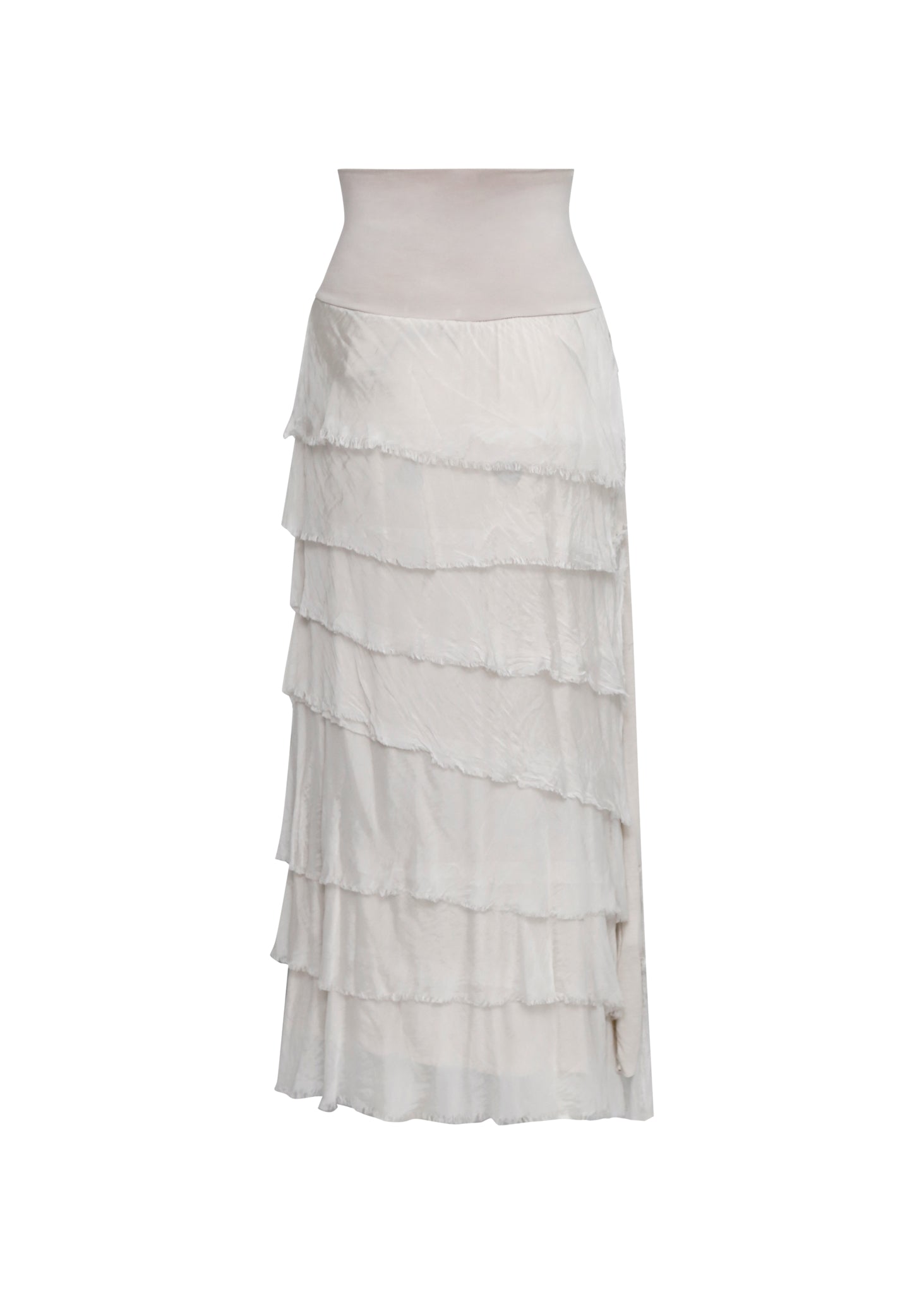 Esta falda es una pieza que personifica el romanticismo contemporáneo a través de una rica textura y una silueta fluida de gran elegancia. Confeccionada en un tejido satinado de color gris perla con un sutil acabado arrugado, la prenda destaca por su diseño de volantes escalonados que recorren toda la longitud, cada uno de ellos rematado con un delicado borde deshilachado que aporta un aire artesanal y bohemio. La estructura se define por una cinturilla ancha y elástica de talle alto, diseñada para suavizar la línea de la cadera y garantizar un ajuste cómodo que realza la figura. Gracias a la ligereza de sus capas, la falda genera un movimiento vaporoso y sofisticado, convirtiéndola en la elección ideal para eventos especiales o para elevar un estilismo de día con un toque de lujo relajado.