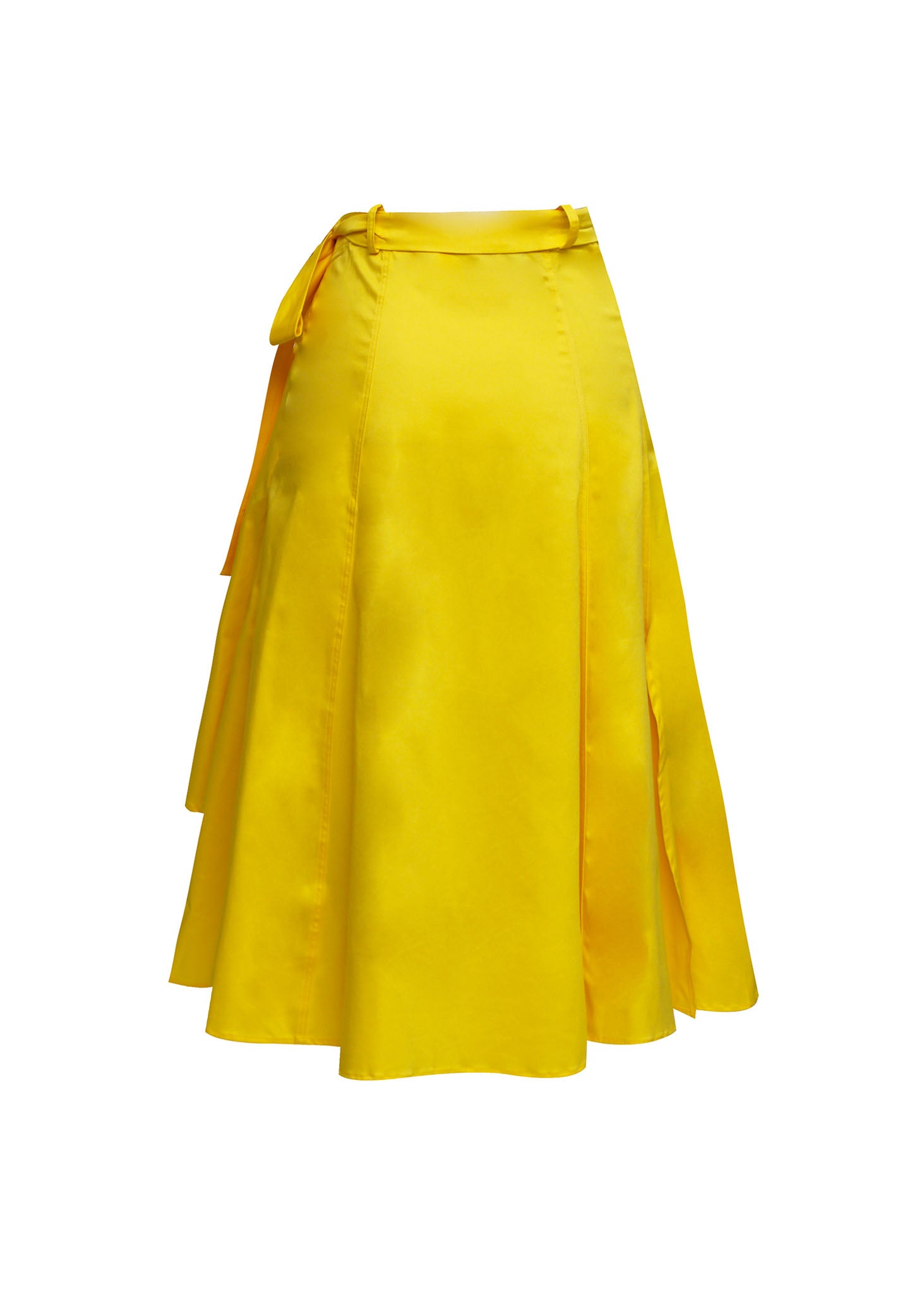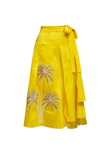 Esta falda es una pieza vibrante que captura la esencia del lujo vacacional mediante un diseño artesanal y un color amarillo solar de gran impacto. La prenda destaca por su estilo cruzado (wrap), que se ajusta elegantemente a la cintura con un lazo lateral, creando una silueta fluida y femenina que se adapta perfectamente a la figura.