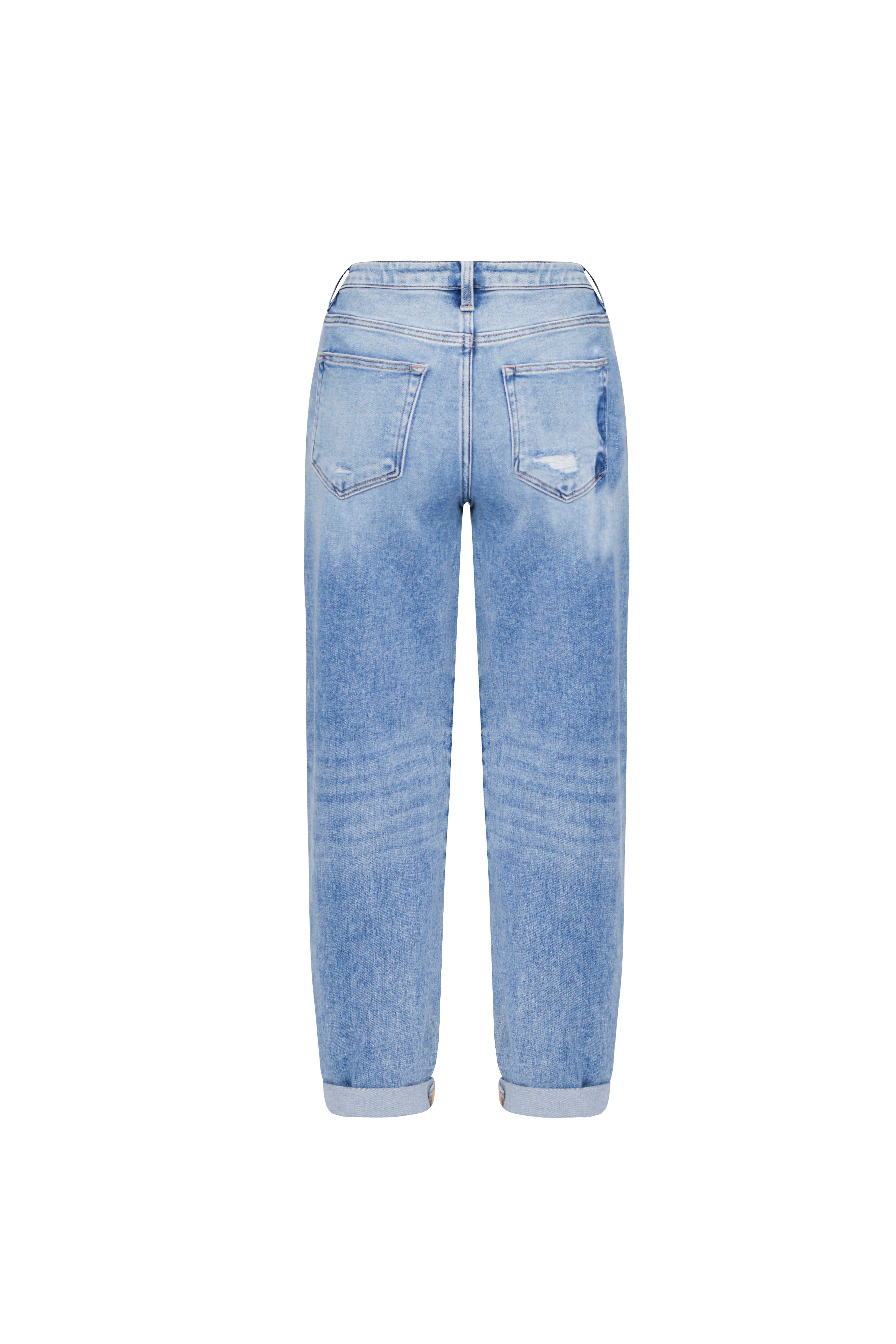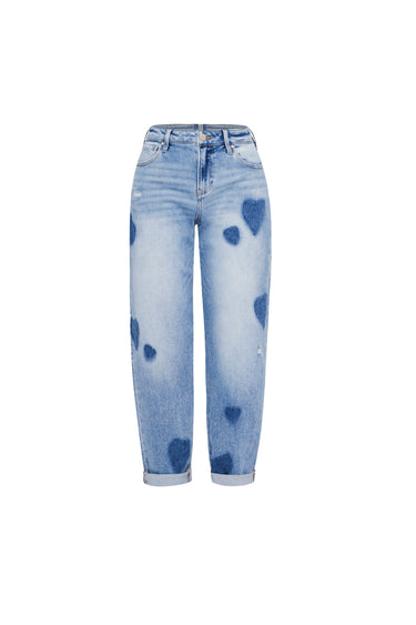 Estos pantalones vaqueros de silueta mom fit en denim claro son una pieza de carácter lúdico y romántico que reinterpreta el estilo urbano mediante texturas creativas. La prenda destaca por un patrón de corazones en denim de lavado oscuro aplicados mediante una técnica de patchwork integrado o estampación láser, que crea un contraste visual dinámico y juvenil sobre la base desgastada. Presentan un diseño de tiro alto con cinco bolsillos clásicos y un bajo con dobladillo marcado que acentúa su estética retro, convirtiéndolos en una prenda de declaración ideal para estilismos casuales con una fuerte personalidad editorial.