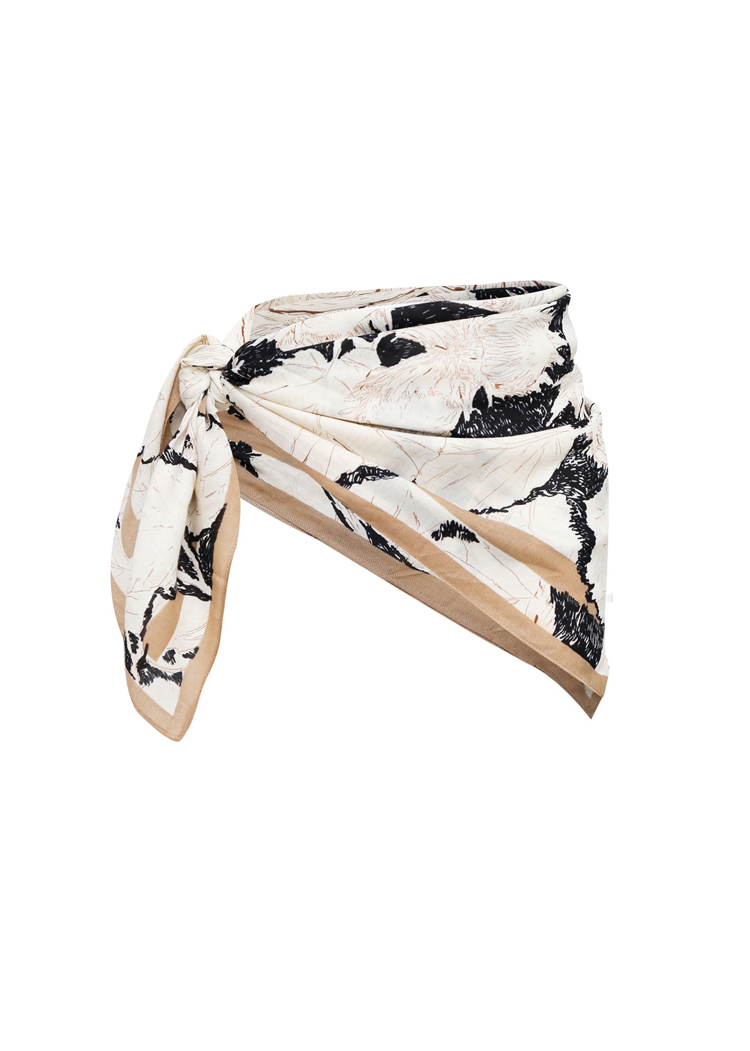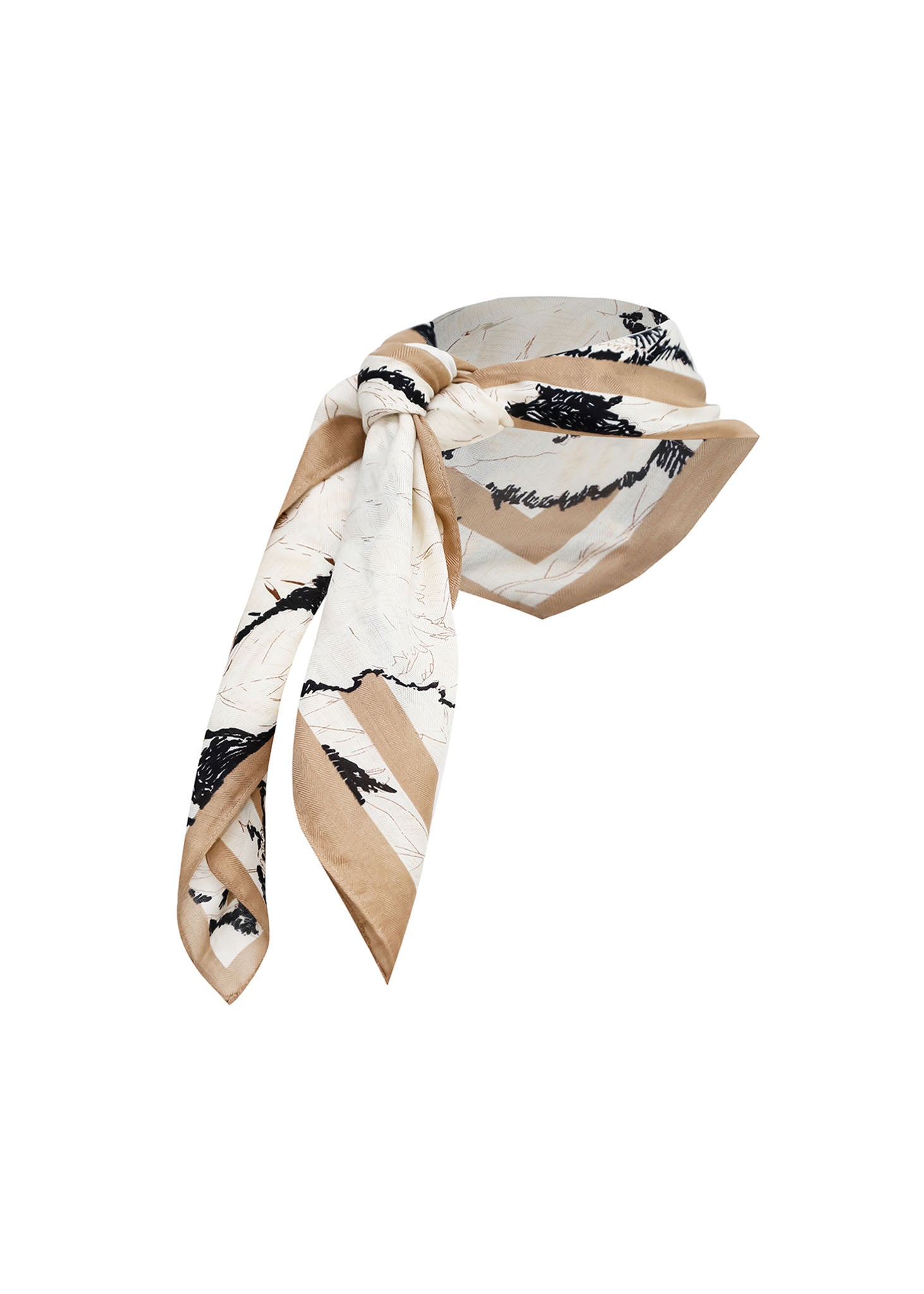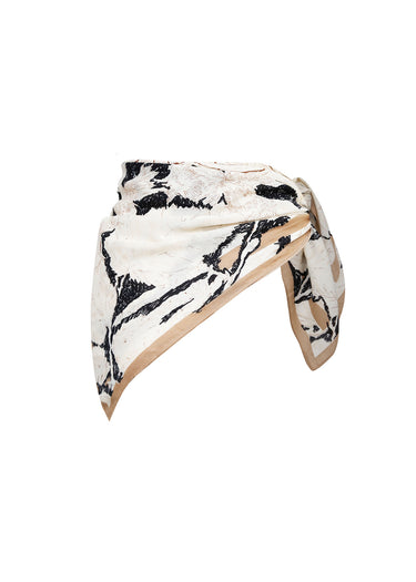 Este pañuelo presenta un elegante estampado abstracto de pinceladas en negro y blanco cremoso, con un sofisticado borde beige cámel. Su tejido suave y diseño versátil lo hacen el accesorio perfecto para llevar al cuello, en el cabello o como un detalle chic en tu bolso, añadiendo un toque moderno y artístico a cualquier conjunto