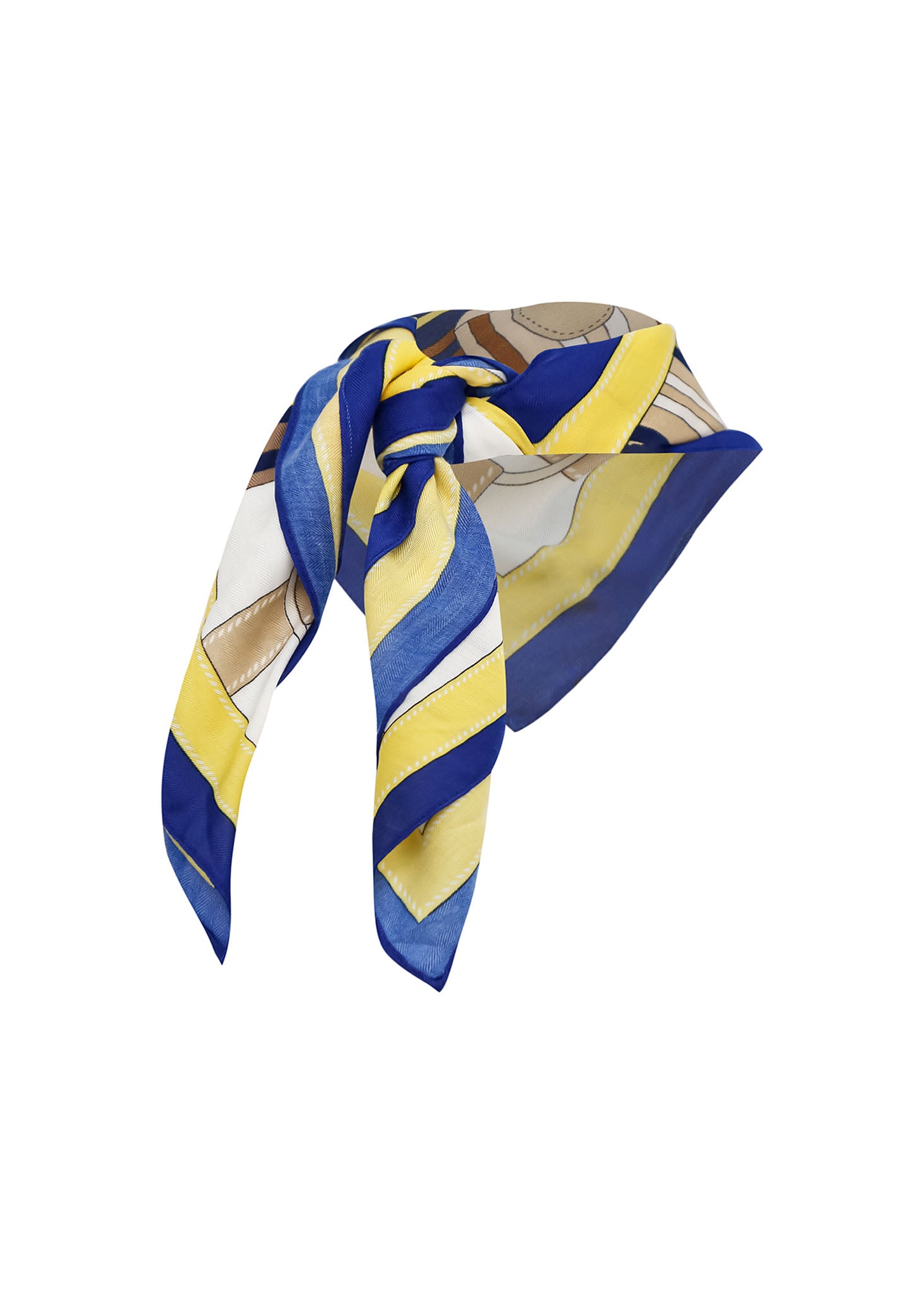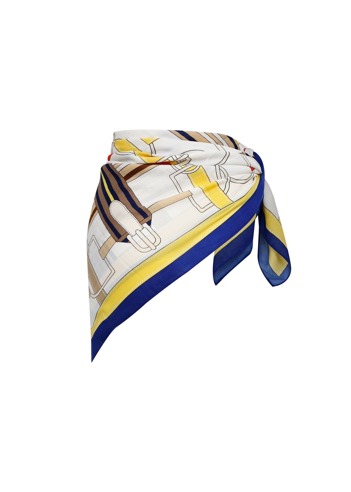 Eleva tu estilo con nuestra Pañoleta cuadrada en un vibrante estampado Ecuestre, que combina herrajes y correas en tonos de blanco cremoso, azul marino, amarillo y marrón. Este accesorio lujoso y versátil es perfecto para añadir un toque de elegancia vintage a tu cuello, cabello, bolso o incluso como un top chic.