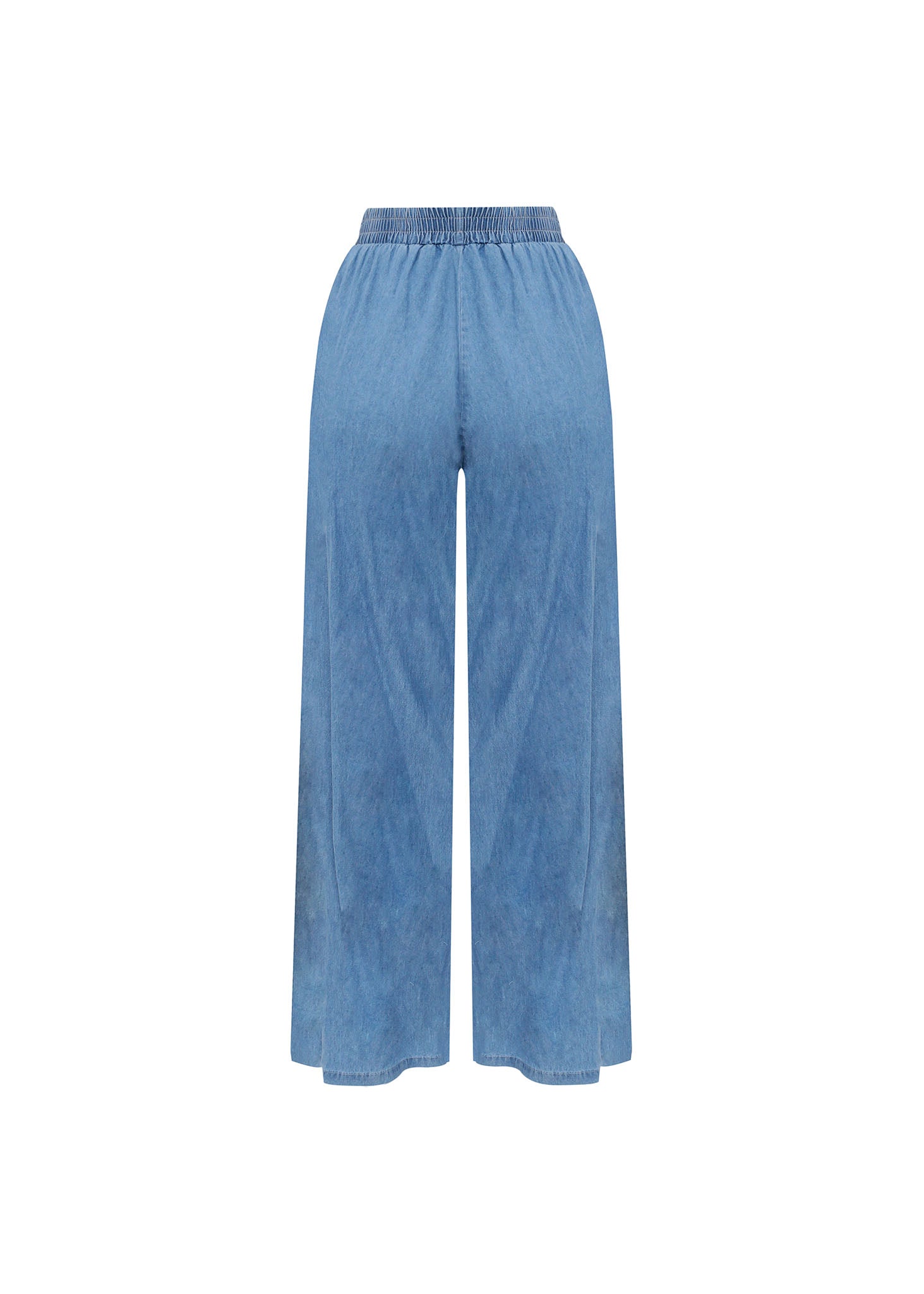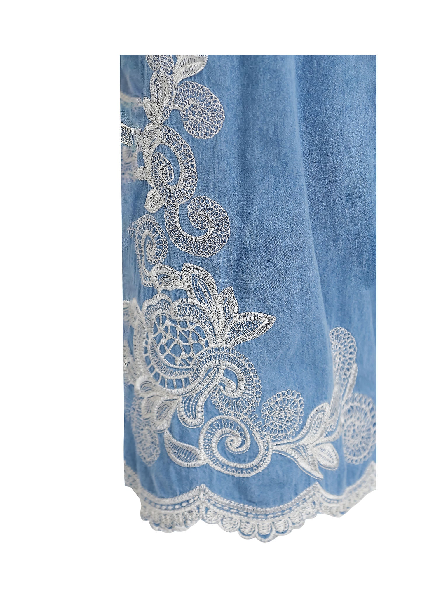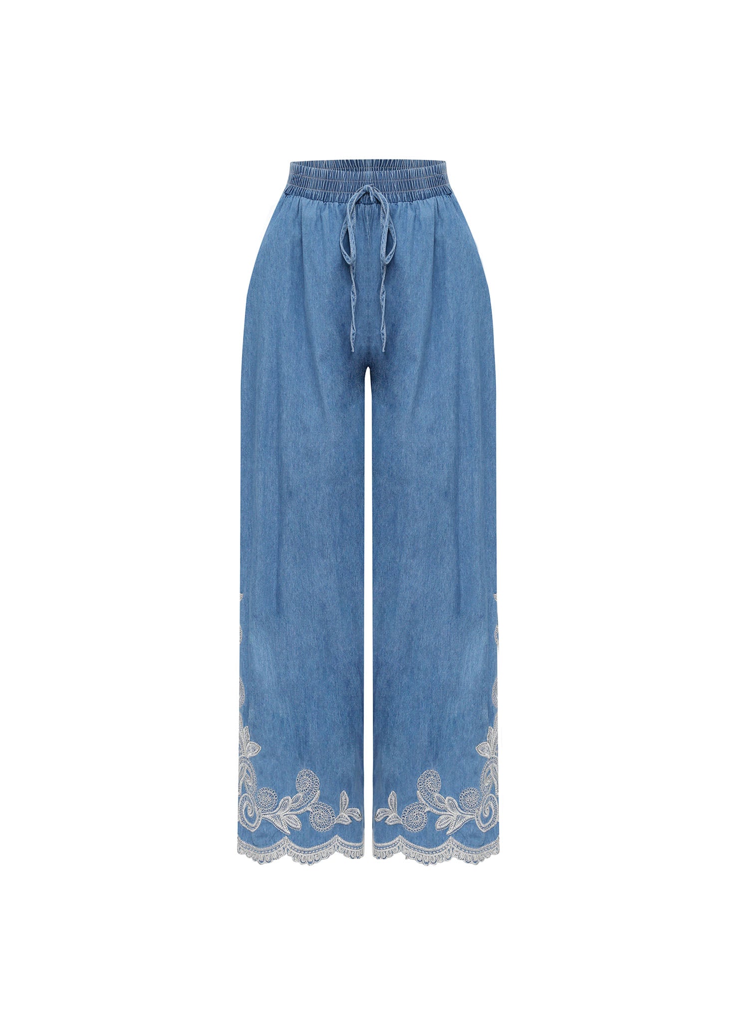 Este pantalón palazzo fusiona la versatilidad del denim con la delicadeza de los detalles románticos, creando una pieza de estética bohemia y sofisticada. La prenda está confeccionada en un denim liviano de lavado medio que ofrece una caída fluida y ligera, ideal para un movimiento orgánico.