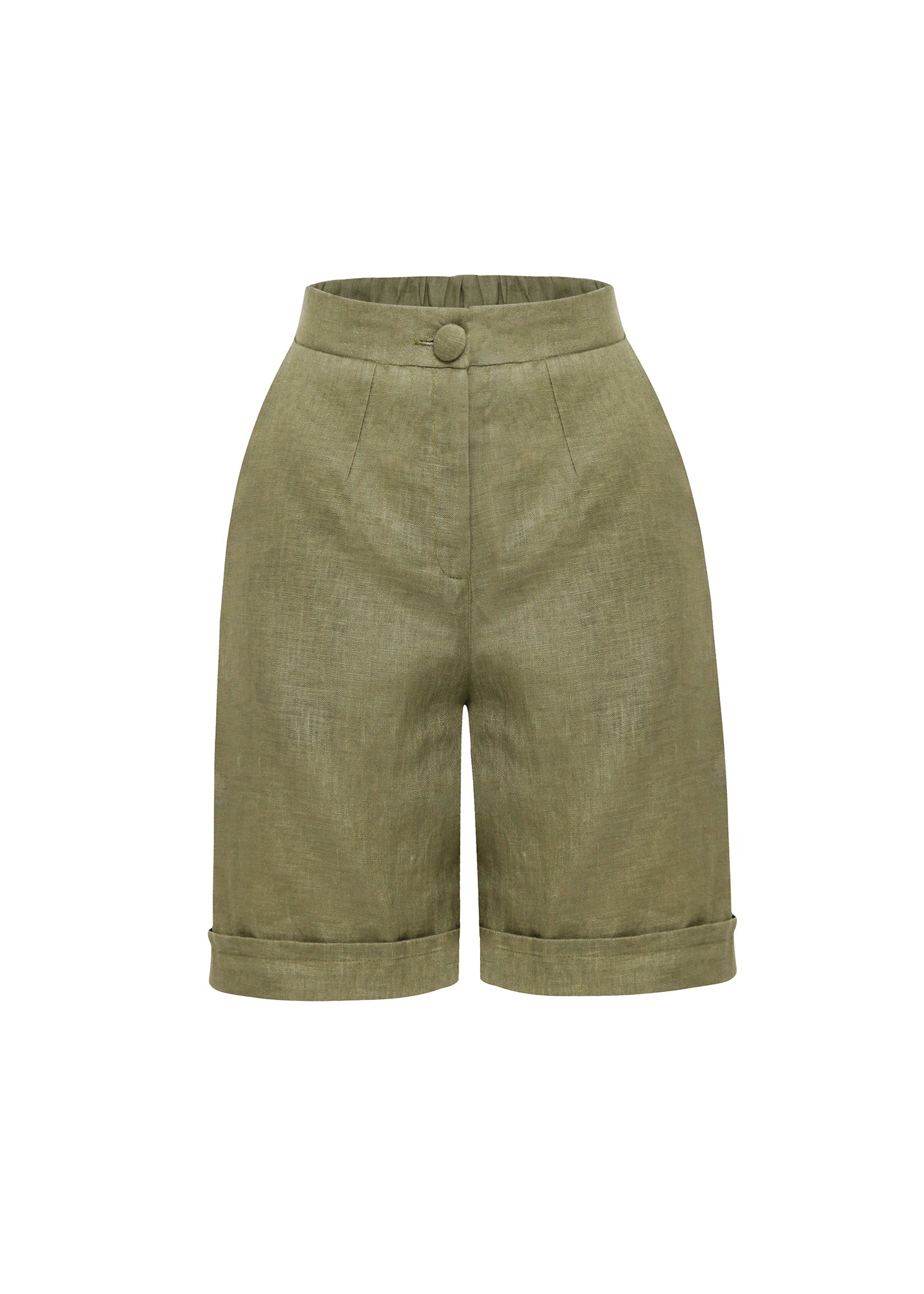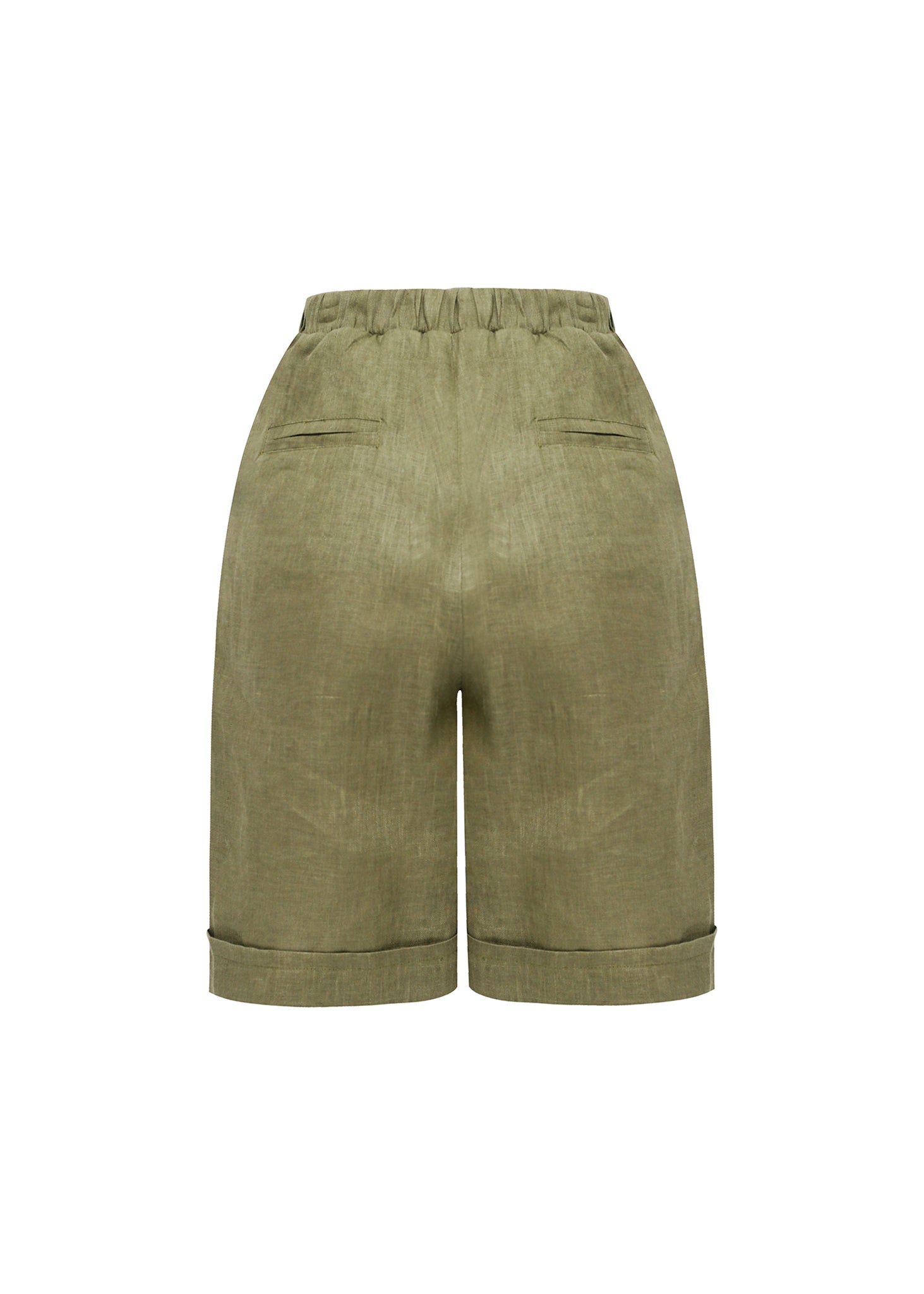 Este es un pantalón corto de estilo sastre. El color es un verde oliva con una textura de lino que le da un aspecto fresco y natural. El diseño es de tiro alto y la cinturilla es ancha, creando una silueta favorecedora. La parte frontal cuenta con pliegues que le aportan estructura y un toque sofisticado. El cierre es invisible, oculto en el centro del pantalón, y se cierra con un botón de color marrón.