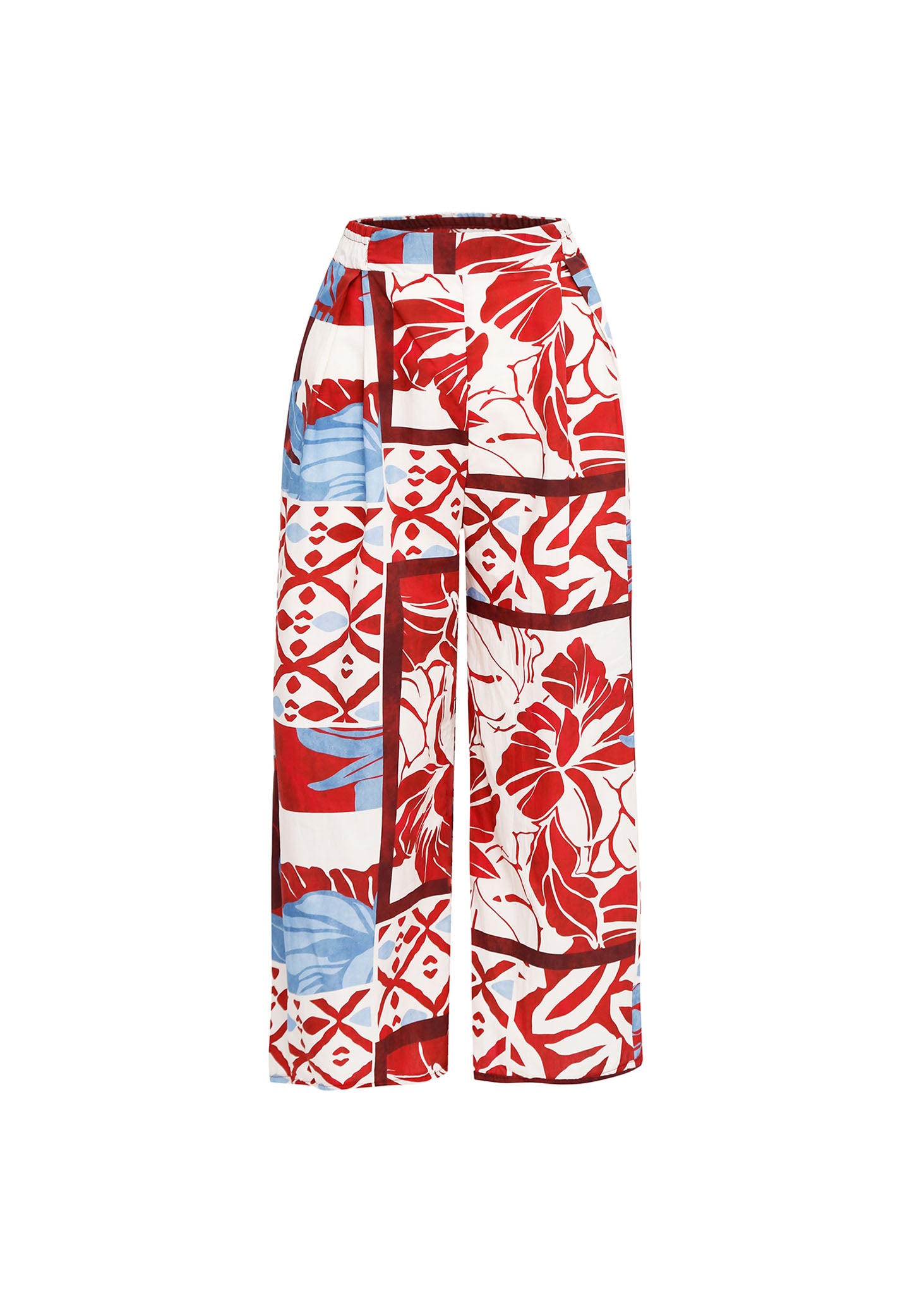 Este pantalón de silueta fluida es una declaración de estilo vibrante que fusiona el arte gráfico con la frescura estival. La prenda destaca por un complejo estampado de estilo patchwork que combina grandes motivos de hibiscos y follaje tropical en rojo carmín y azul cielo sobre un fondo blanco óptico, enmarcados por bandas geométricas de inspiración étnica. Diseñado con un tiro alto que favorece la figura, cuenta con pinzas frontales profundas que estructuran la caída de su pierna ancha tipo palazzo, aportando ligereza y un movimiento elegante al caminar. La cintura elástica en la parte posterior asegura un ajuste cómodo y versátil sin perder la sofisticación de su frente liso. Es la pieza ideal para elevar conjuntos de vacaciones o eventos de día con un enfoque audaz, artístico y contemporáneo.