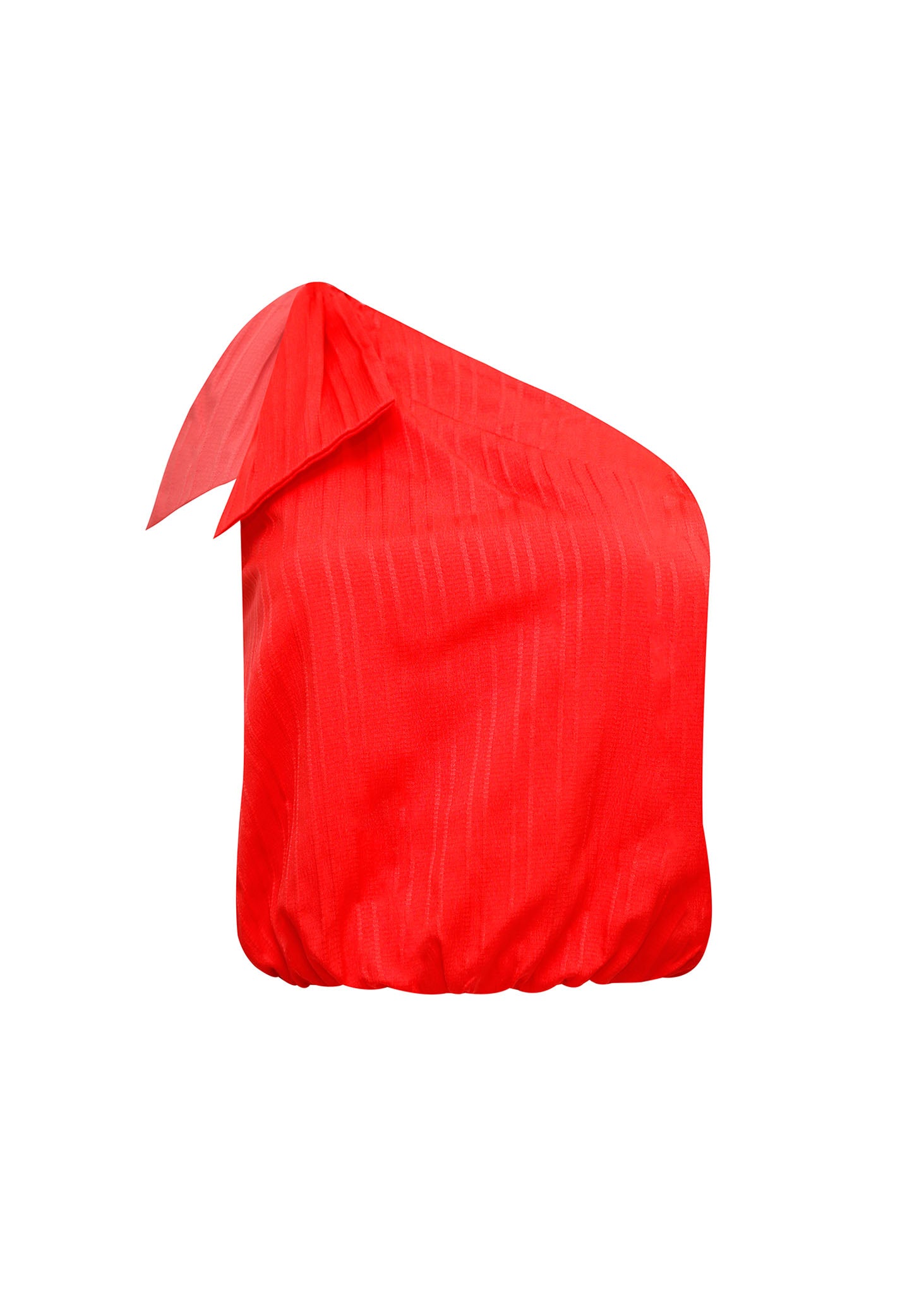 Un top de hombro único vibrante, ideal para salir de noche. Este diseño en rojo intenso presenta un cuello asimétrico estructurado y un bajo fruncido que te da volumen justo donde lo quieres. El tejido tiene una sutil textura de rayas verticales. Combínalo con prendas de cintura alta para un estilo moderno y elegante.