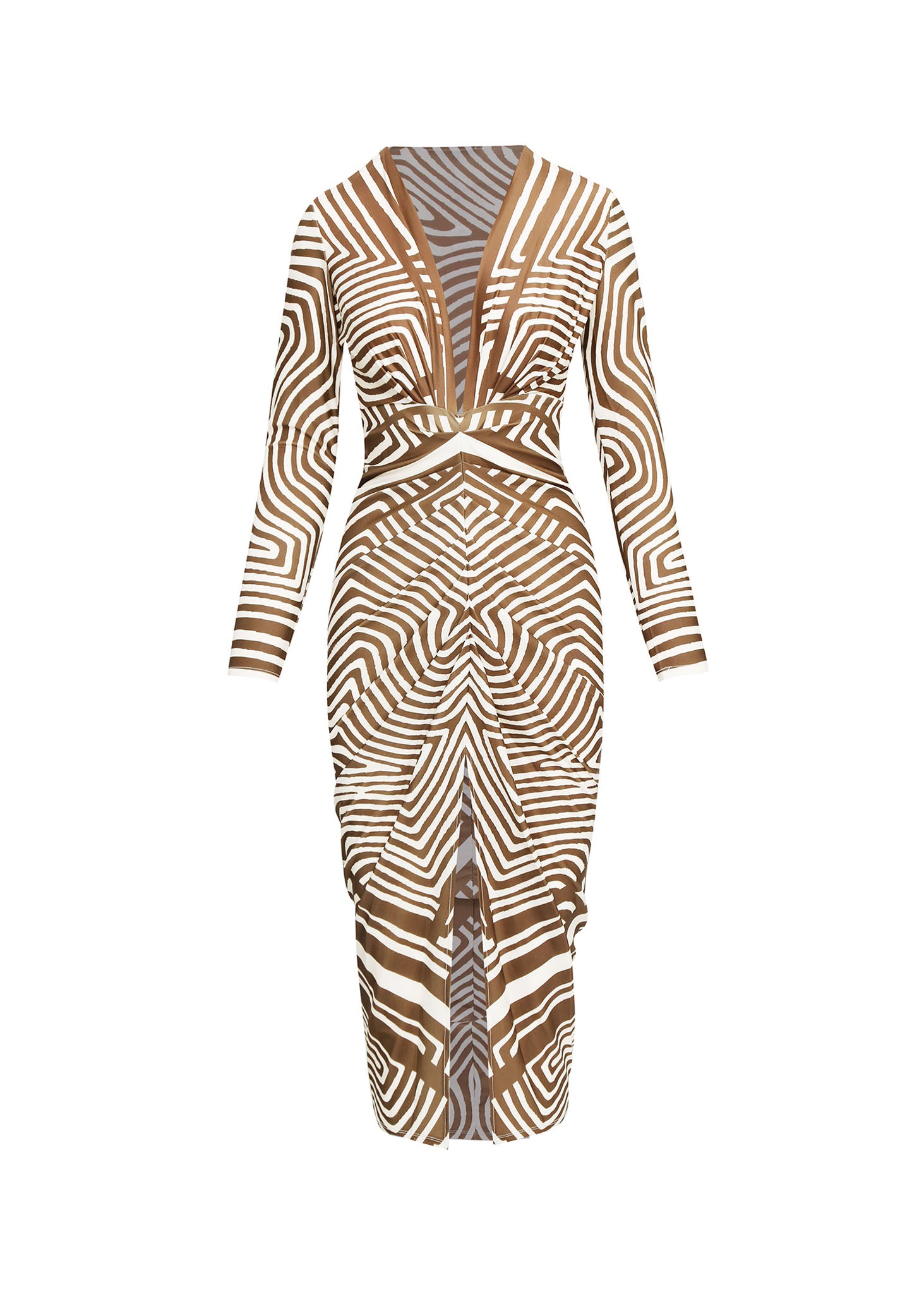 Captura la atención de inmediato con el Vestido en licra, una obra de arte moderna que equilibra la audacia floral con la sofisticación del diseño. Este vestido midi presenta un dramático estampado de grandes flores en tonos coral y crema sobre un fondo negro intenso. La clave de su impacto es el fruncido estratégico que recorre el centro, creando una textura rica y esculpiendo una silueta increíblemente favorecedora