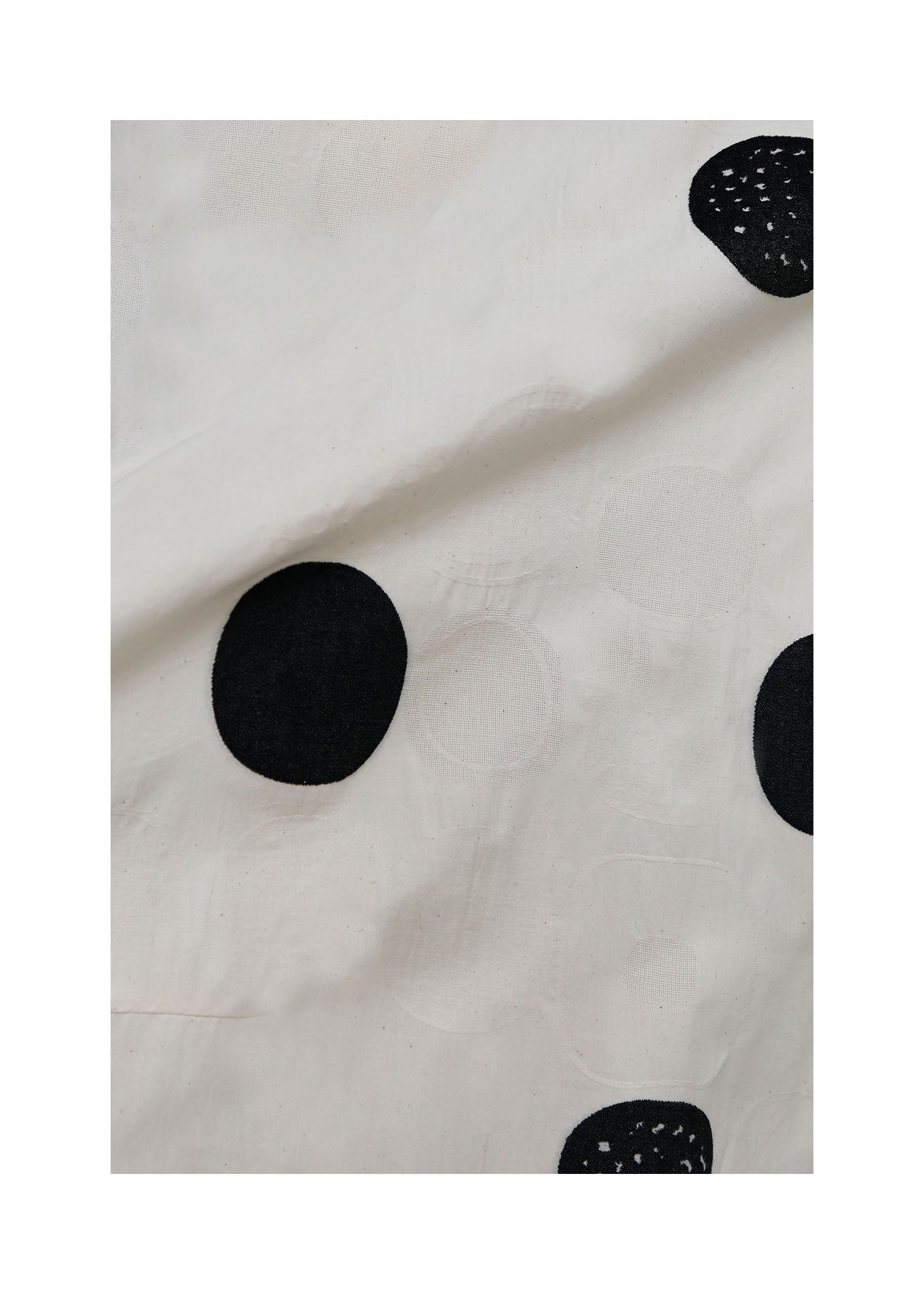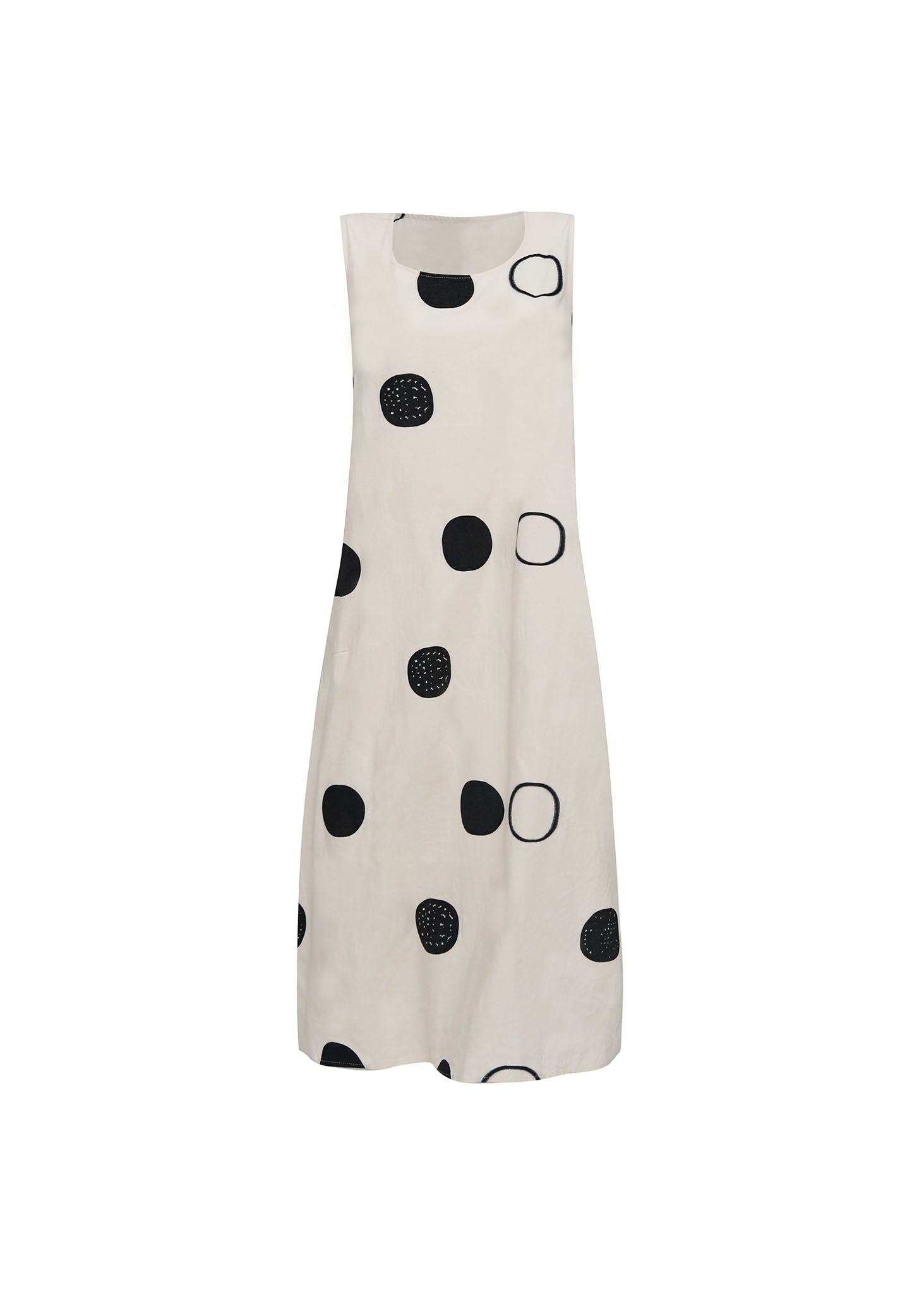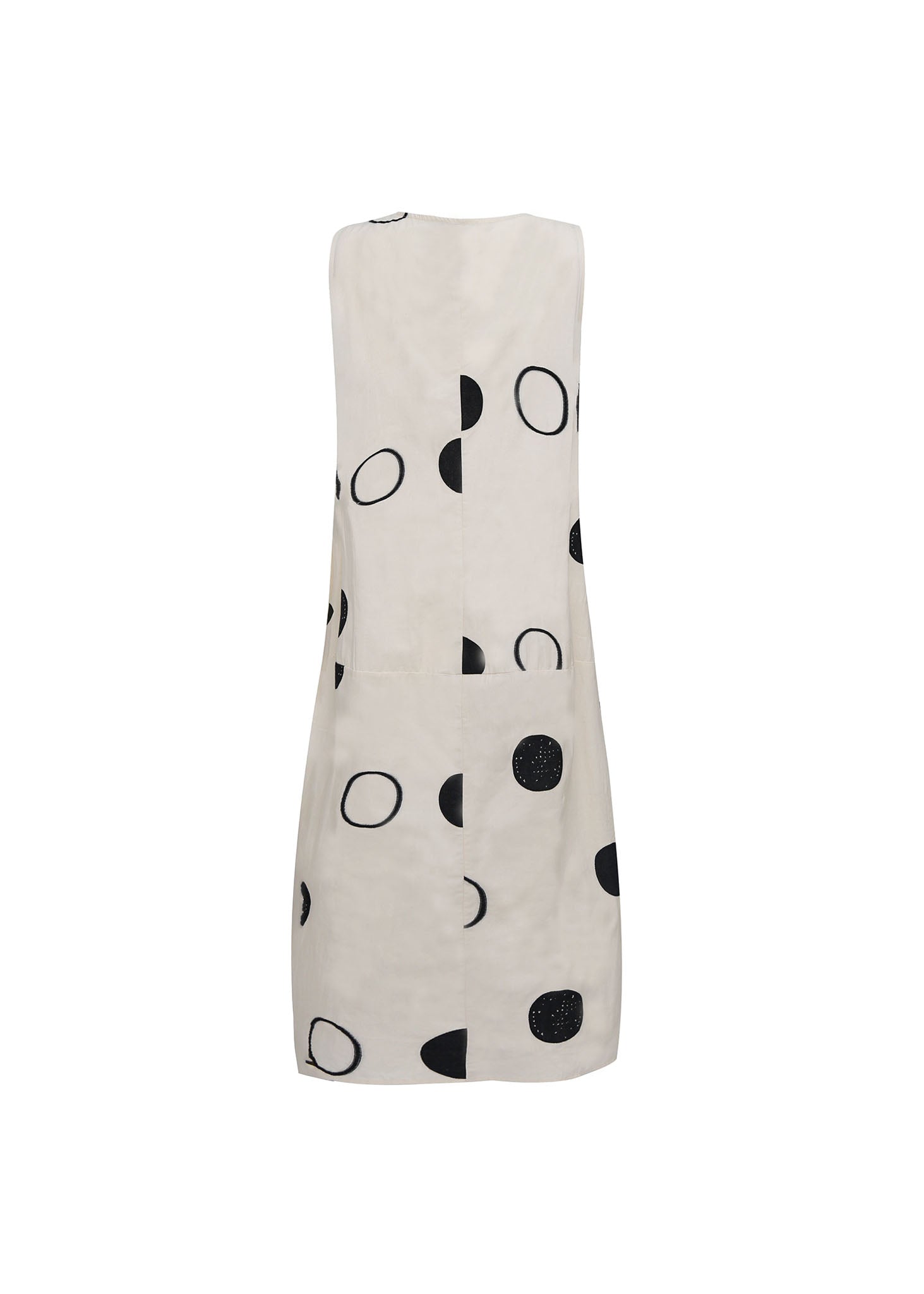 Este es un vestido sin mangas de corte columna o recto, confeccionado en un tejido ligero con una caída fluida. El color base es un beige neutro que irradia sobriedad. La pieza se eleva con un estampado gráfico de círculos en negro que recorre toda la prenda, creando un motivo statement y vanguardista. La composición geométrica inyecta una dosis de diseño de autor y minimalismo chic.