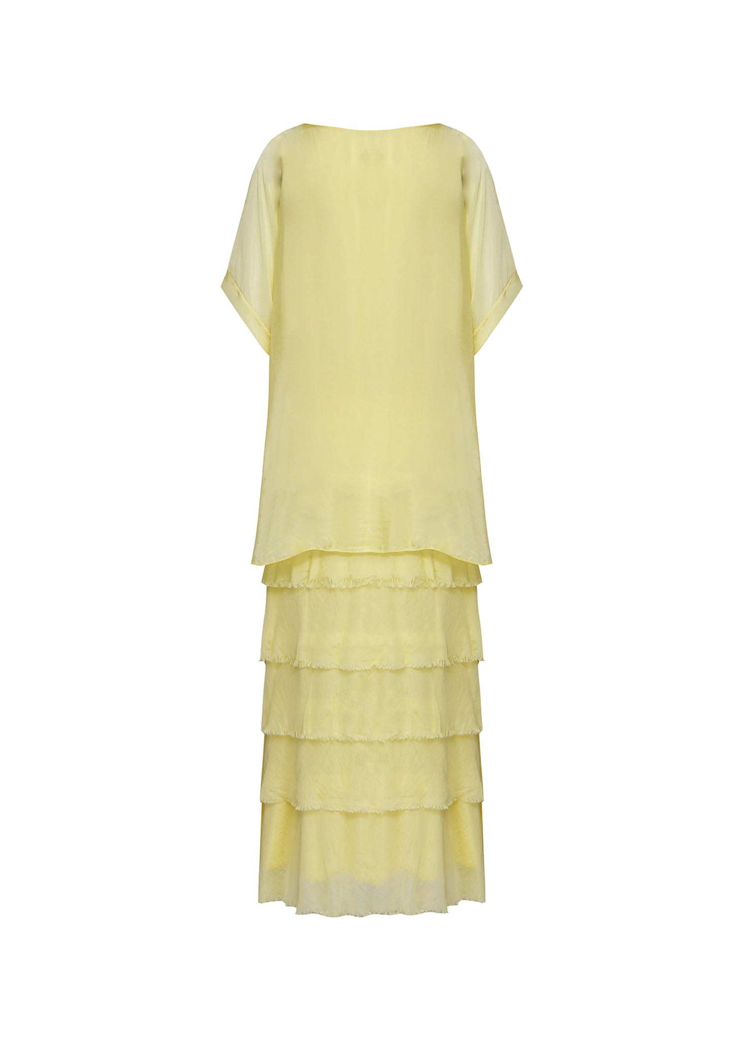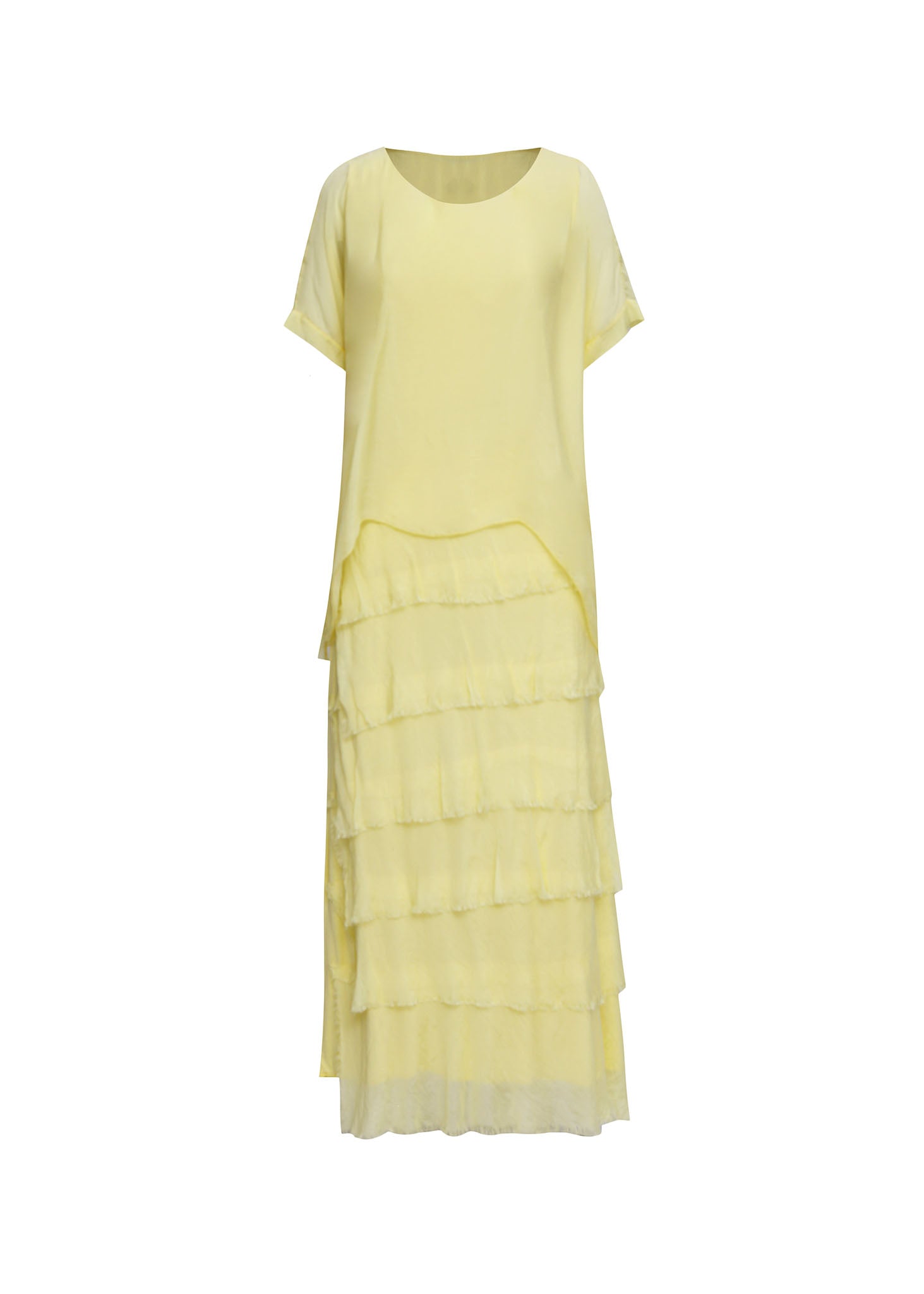 Este es un vestido de mangas cortas de silueta recta o ligeramente fluida, confeccionado en un tejido que luce un amarillo vibrante y optimista. El diseño se centra en el detalle de flecos que adornan la prenda (posiblemente en el bajo o en las mangas), inyectando movimiento y textura statement. Esta pieza fusiona la energía del color con la tendencia bohemian-chic.
