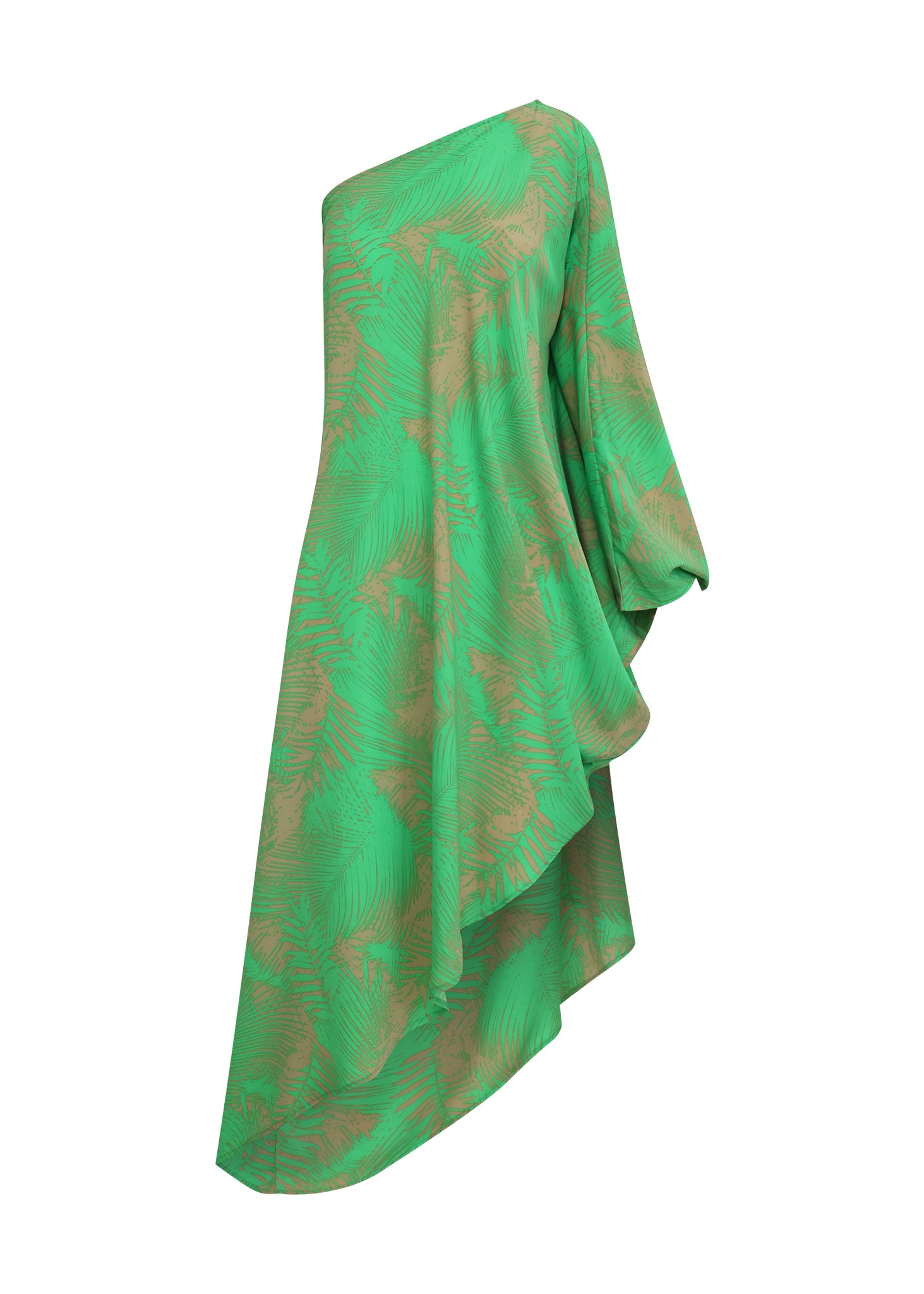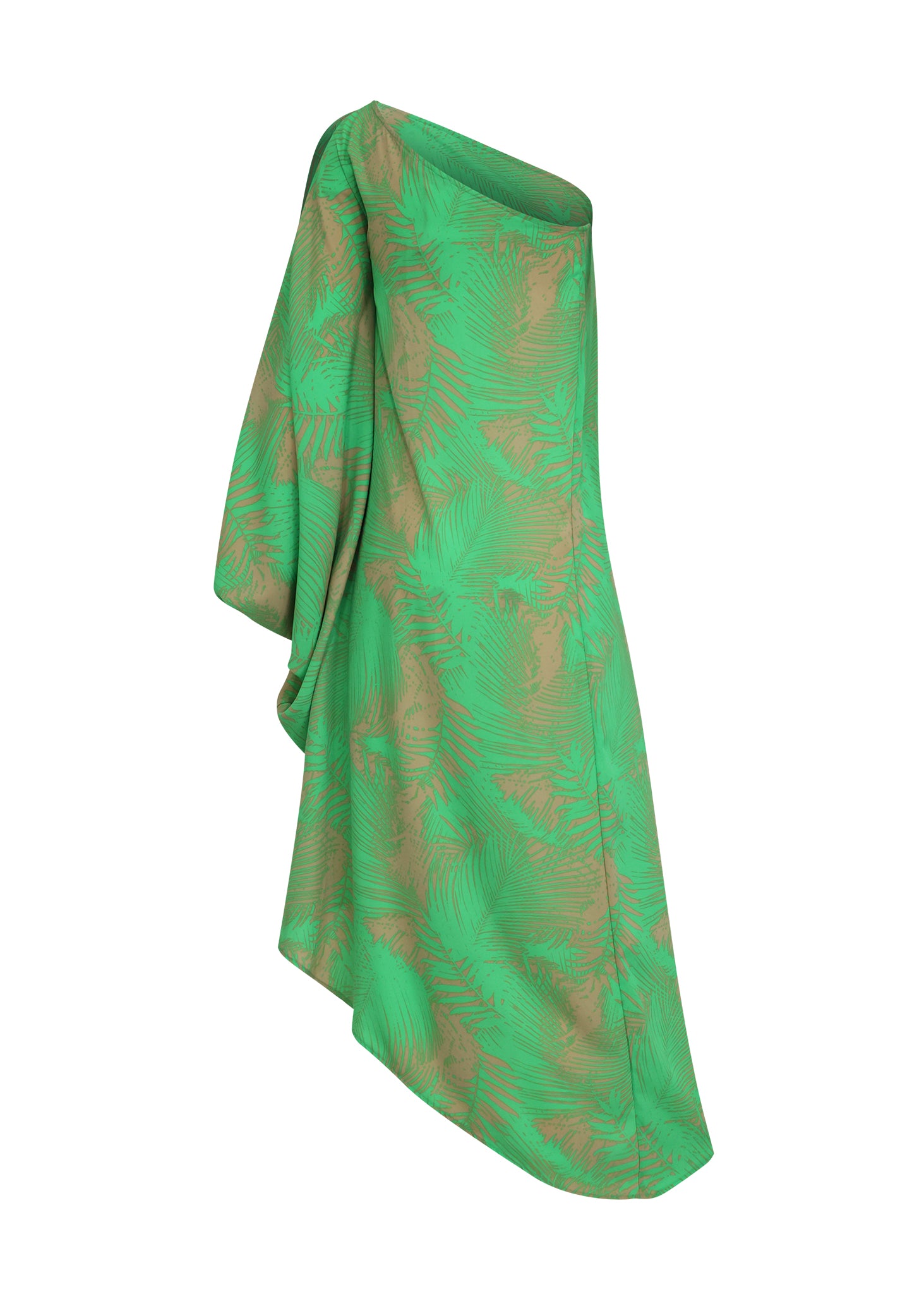 Este vestido es una pieza de declaración, perfecta para looks de resort o salidas de verano. Confeccionado en un tejido ligero, presenta un audaz estampado de hojas de palma. El diseño asimétrico de un solo hombro con una manga ancha y fluida añade un toque dramático. El bajo con corte irregular y más largo en un lado crea un movimiento elegante y una silueta vanguardista.