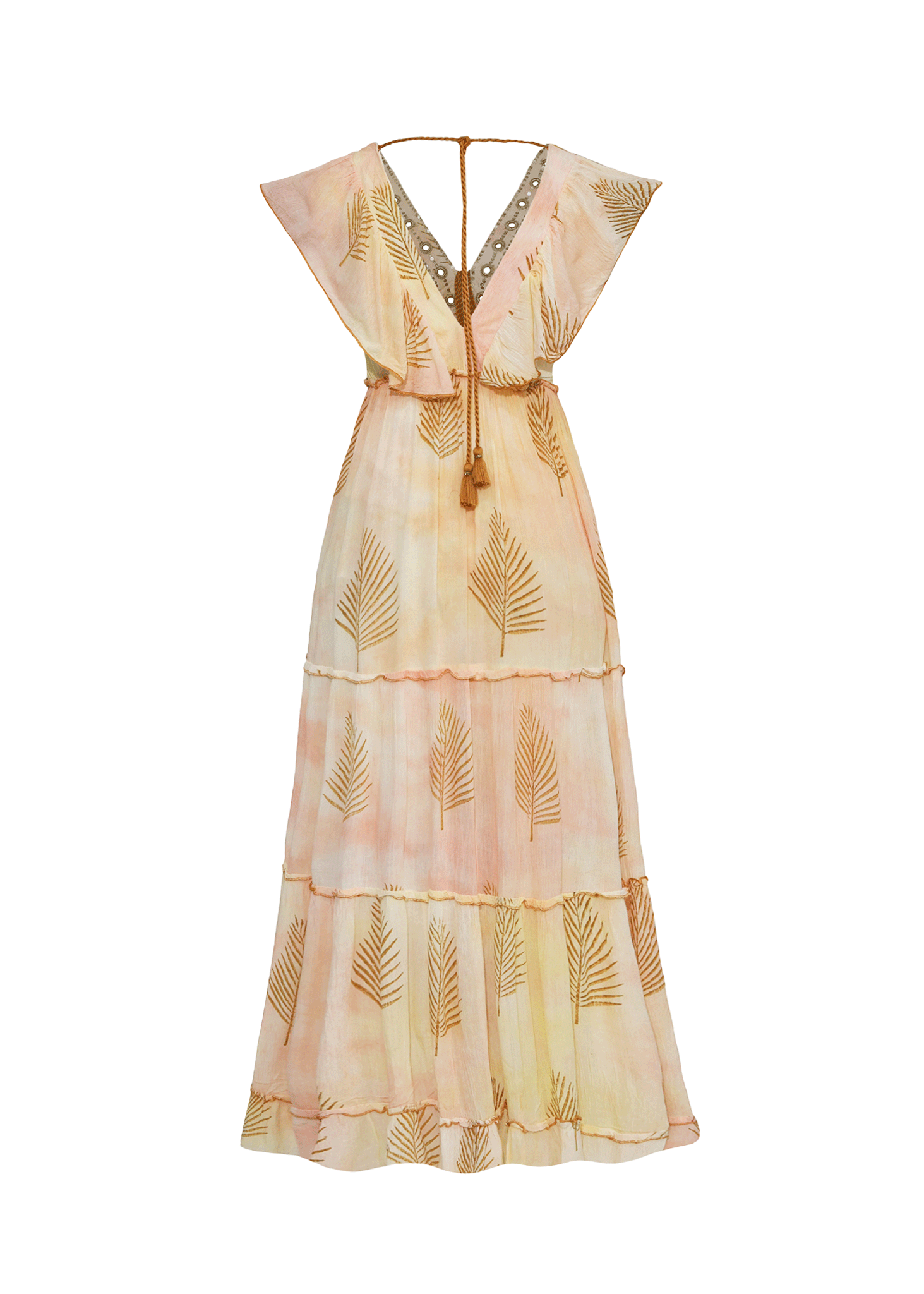 Confeccionado en un tejido vaporoso con un suave efecto degradado (tie-dye) en tonos melocotón, crema y arena, la prenda presenta un diseño de falda escalonada por paneles que aporta volumen y un movimiento grácil al caminar. El cuerpo destaca por un profundo escote en "V" enmarcado por volantes de corte mariposa y un minucioso bordado de lentejuelas y pedrería dorada que recorre los bordes. El elemento protagonista es el estampado de espigas o plumas doradas distribuidas rítmicamente por toda la pieza, complementado por un cierre de espalda abierta con lazada terminada en pompones artesanales. Es una pieza que captura una elegancia relajada pero opulenta, perfecta para una gala de verano o un evento de playa sofisticado.
