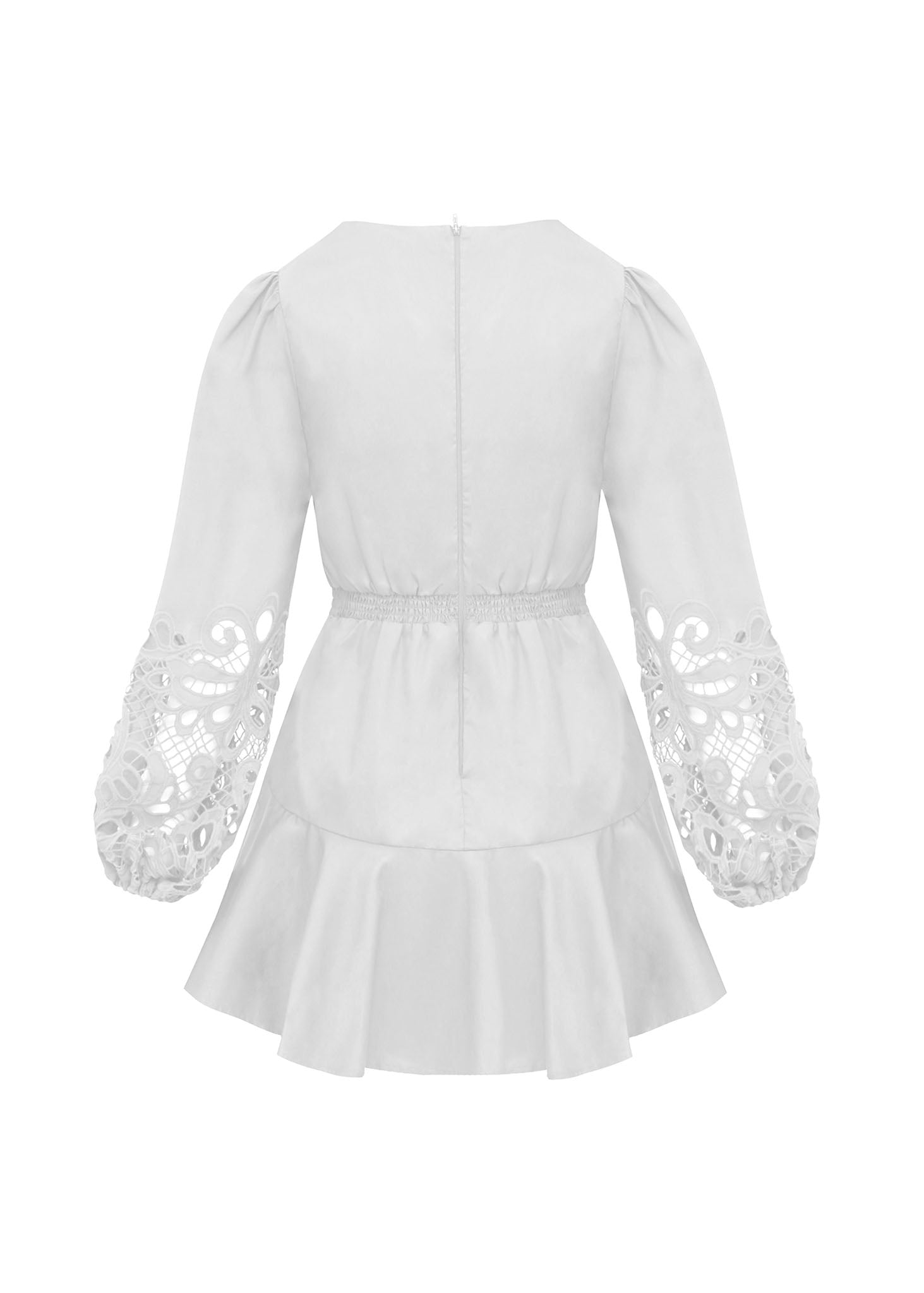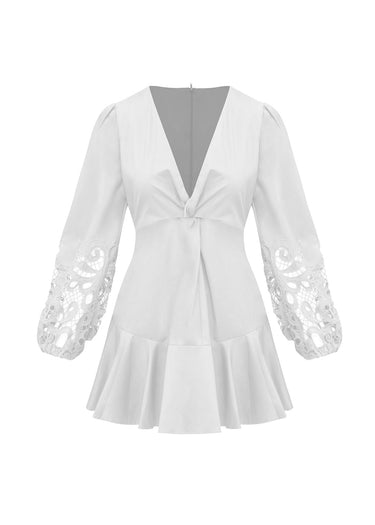 Vestido corto verde de mangas largas con un escote profundo en V que aporta un toque sensual y sofisticado. Las mangas cuentan con detalles en encaje, añadiendo un estilo único y natural al diseño. Perfecto para ocasiones donde se busque una mezcla de elegancia y originalidad.
