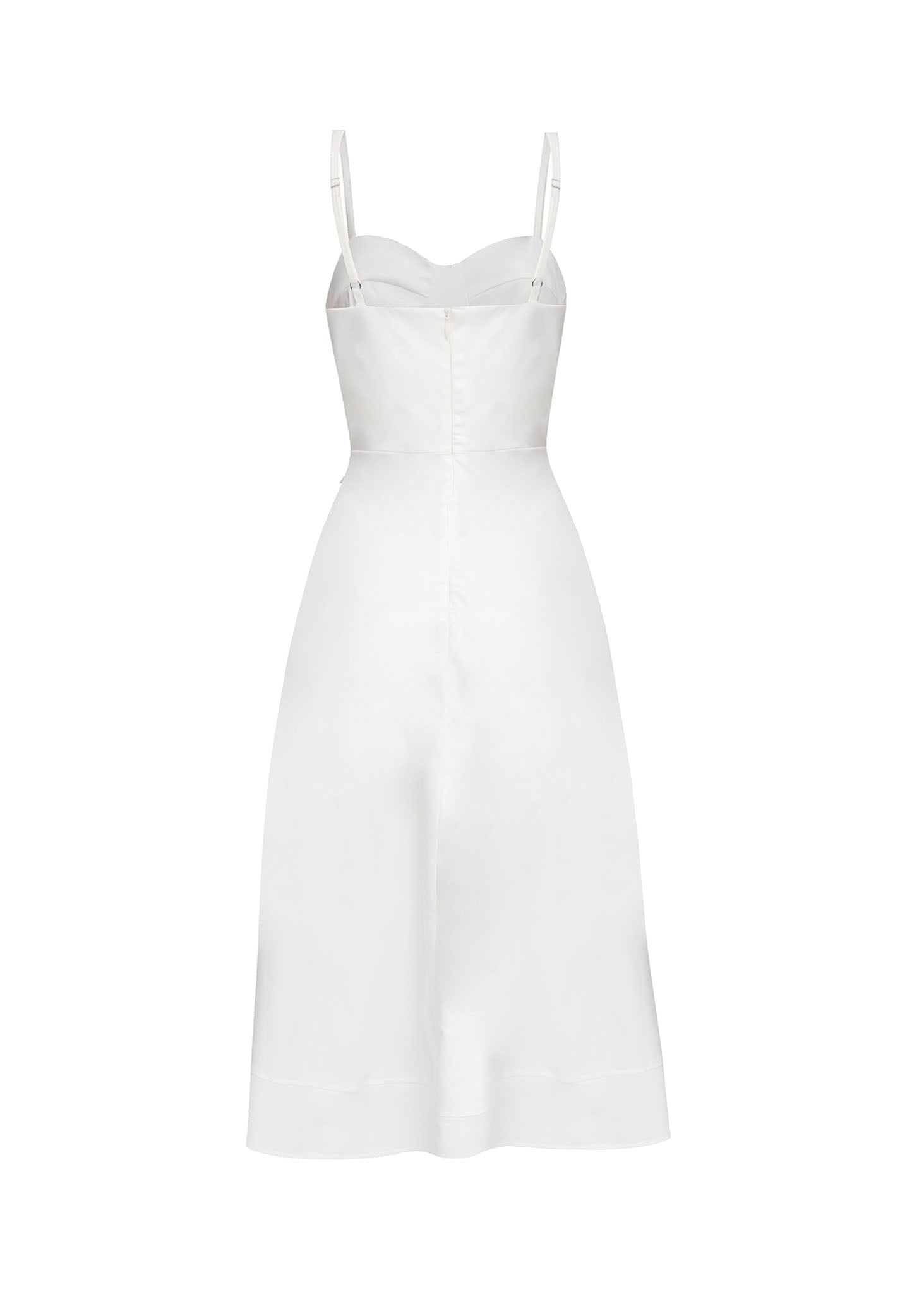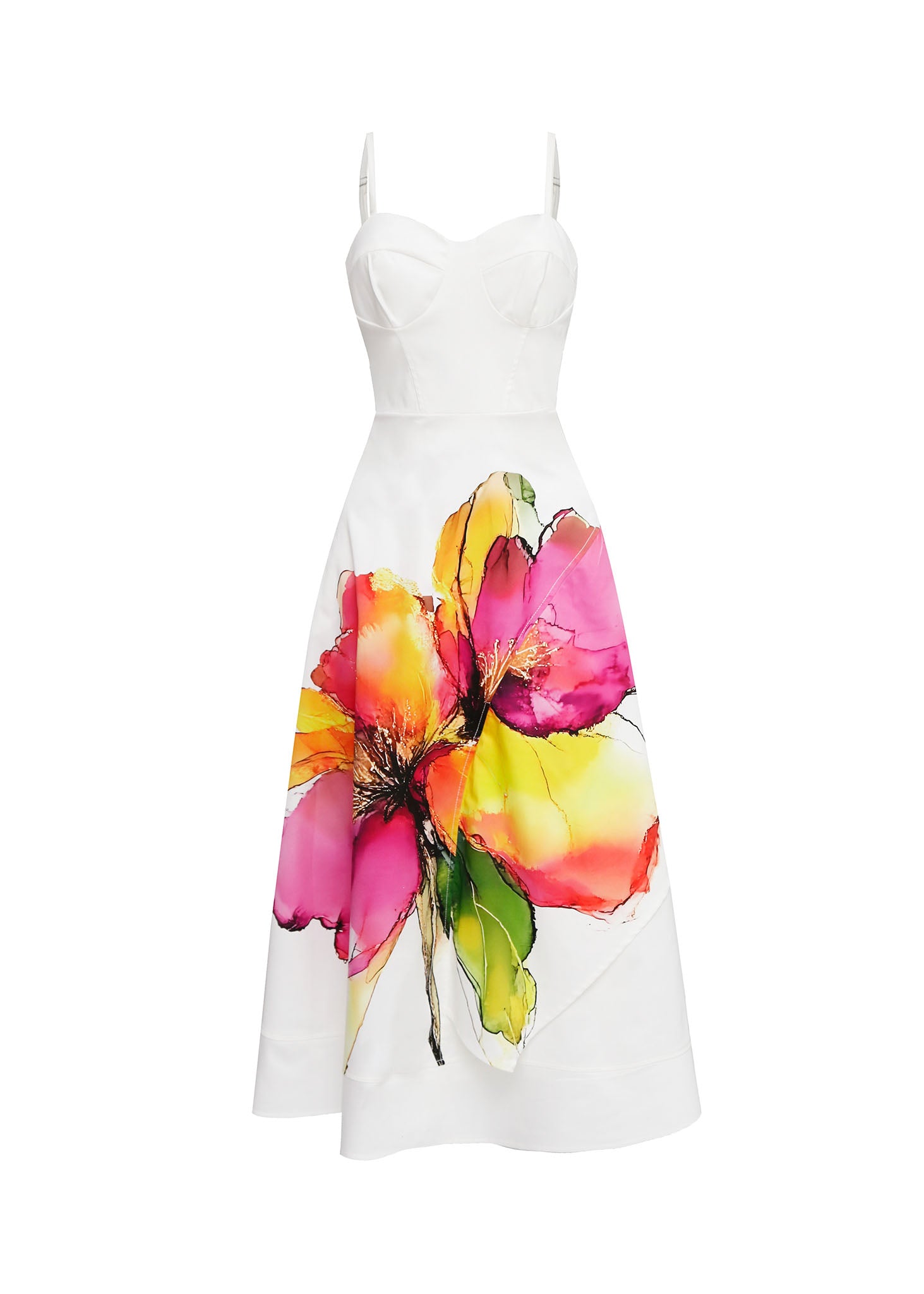 Este vestido es una pieza de diseño que fusiona la estructura clásica de la corsetería con la fluidez del arte contemporáneo, destacando por un corpiño tipo bustier con escote corazón y copas preformadas que definen magistralmente el torso. Su silueta evoluciona hacia una falda de línea A con un volumen controlado y elegante, sirviendo de lienzo para un estampado floral de gran escala en técnica de acuarela que aporta dinamismo y una explosión cromática sofisticada. Confeccionado con tirantes finos ajustables para un soporte personalizado, este vestido personifica una feminidad moderna y artística, ideal para eventos de etiqueta de día o celebraciones estivales donde se busque una presencia impactante y refinada.