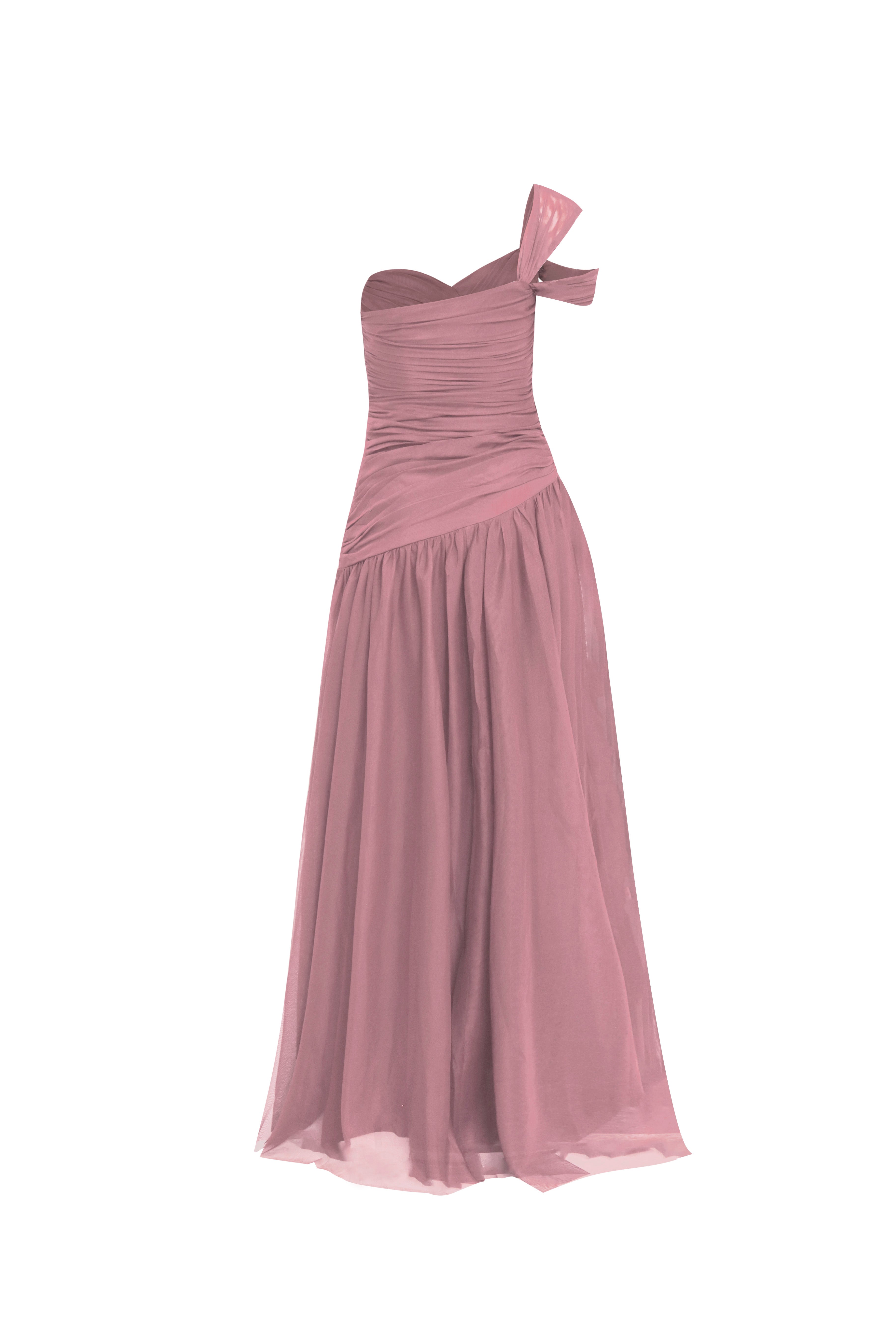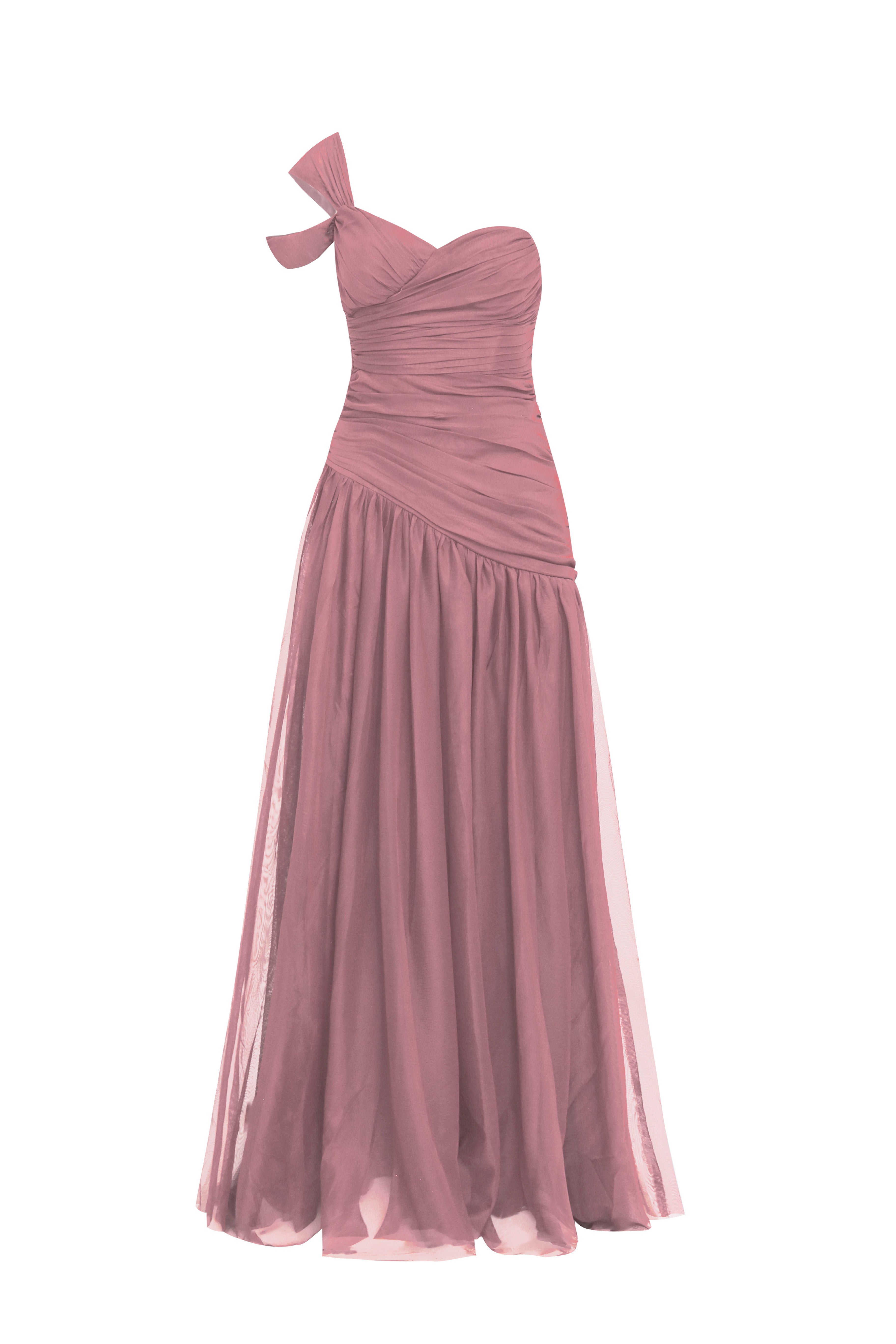 Este espectacular vestido de gala asimétrico es una oda al romanticismo moderno y la sofisticación técnica. Presenta un escote de un solo hombro coronado por un lazo arquitectónico que aporta un toque de alta costura. El torso está meticulosamente diseñado con un drapeado artesanal multidireccional que esculpe la silueta de manera impecable hasta la cadera. Desde un corte diagonal, se desprende una falda de tul vaporosa de gran volumen, que crea un movimiento etéreo y majestuoso al caminar.
