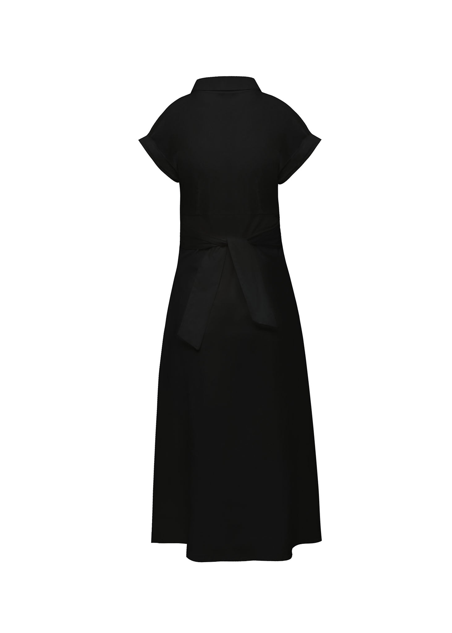 Este elegante Vestido Midi Negro es la definición de sofisticación atemporal, ideal para la oficina o para un look formal casual. Presenta un clásico cuello camisero con escote en V, mangas cortas con puños sutiles y un favorecedor diseño anudado en la cintura que realza la figura. Confeccionado en un tejido estructurado, la falda midi de corte A brinda un movimiento elegante, convirtiendo a este vestido en un básico versátil que se adapta a cualquier ocasión.