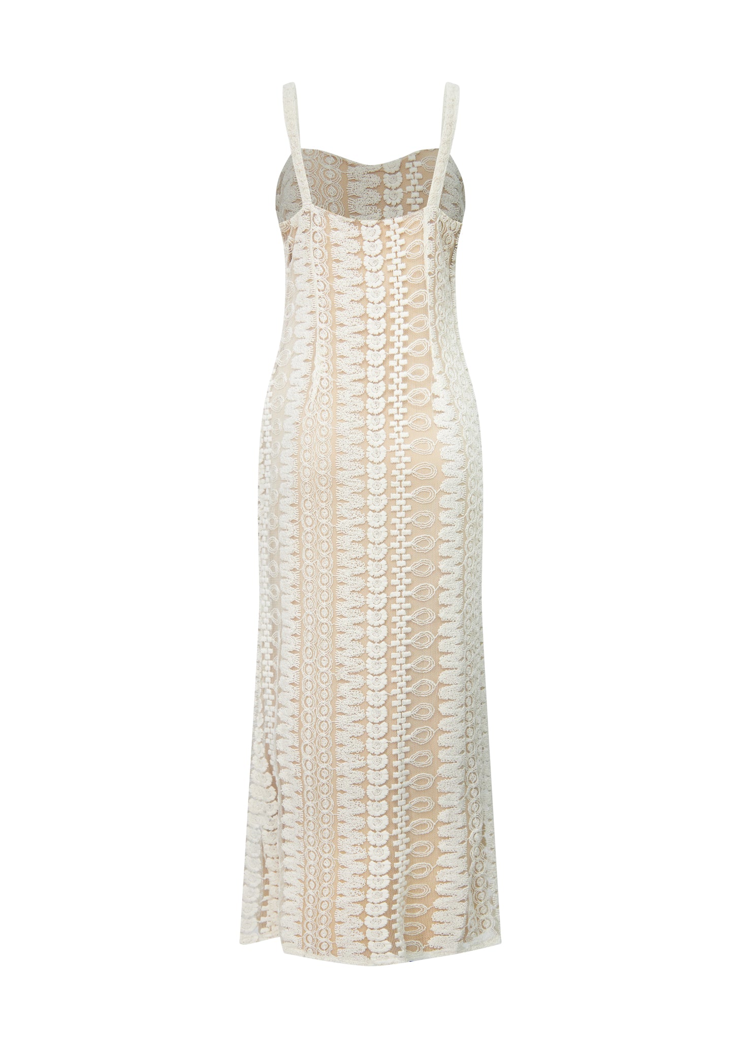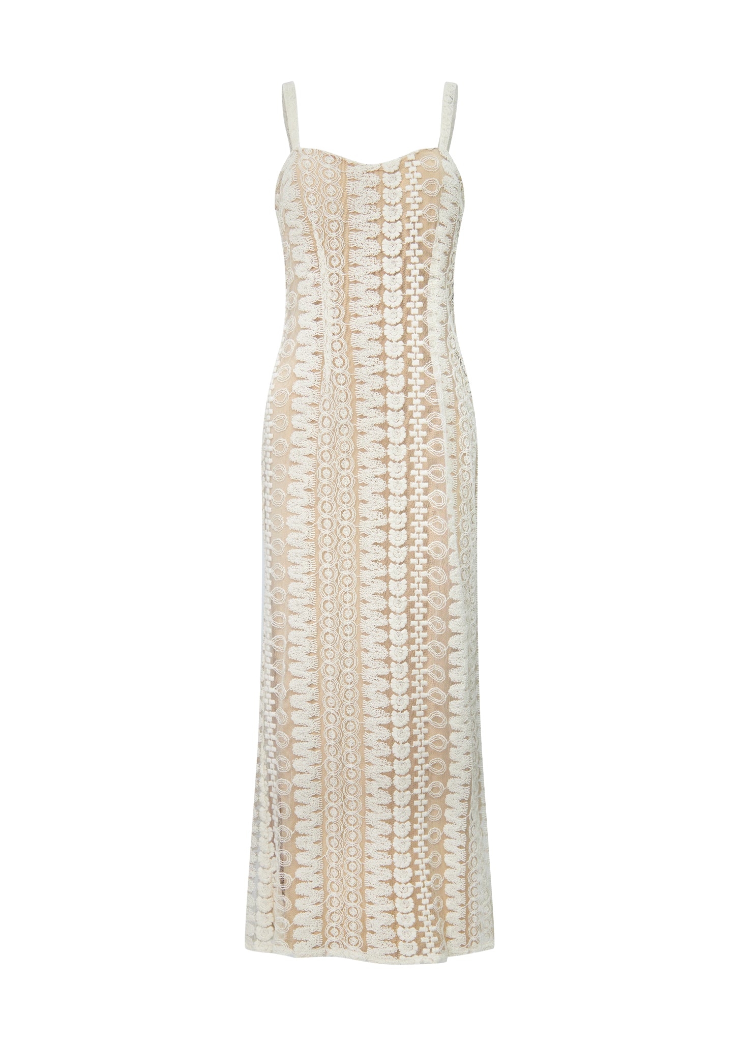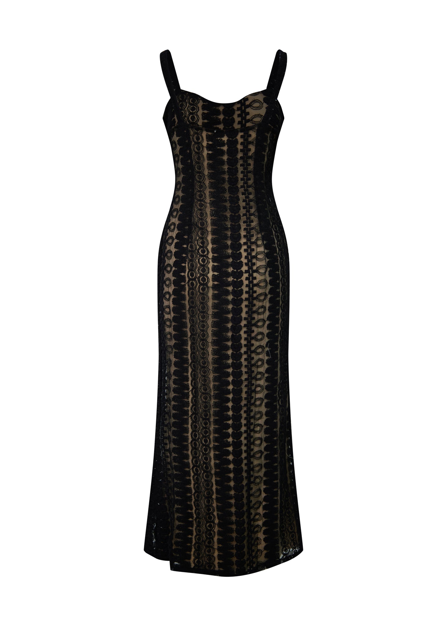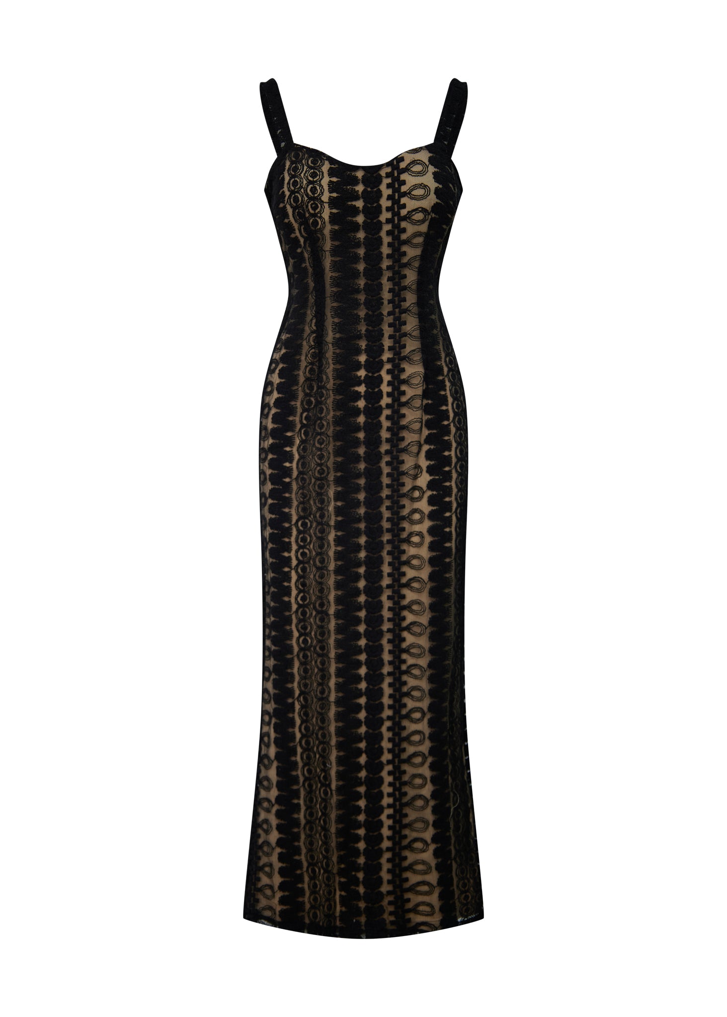 La prenda está confeccionada en un exquisito encaje de guipur con un intrincado patrón geométrico y lineal que recorre toda la silueta de forma vertical. Presenta un cuerpo entallado con escote corazón sutil y tirantes anchos texturizados que enmarcan los hombros con elegancia. El diseño se superpone a un forro en tono nude o champán, lo que permite que el complejo calado del encaje resalte con nitidez, creando un efecto visual de profundidad. La falda cae de forma fluida hasta el suelo, manteniendo una línea depurada que alarga la figura, convirtiéndolo en la elección perfecta para eventos de etiqueta o celebraciones nocturnas de alto nivel.