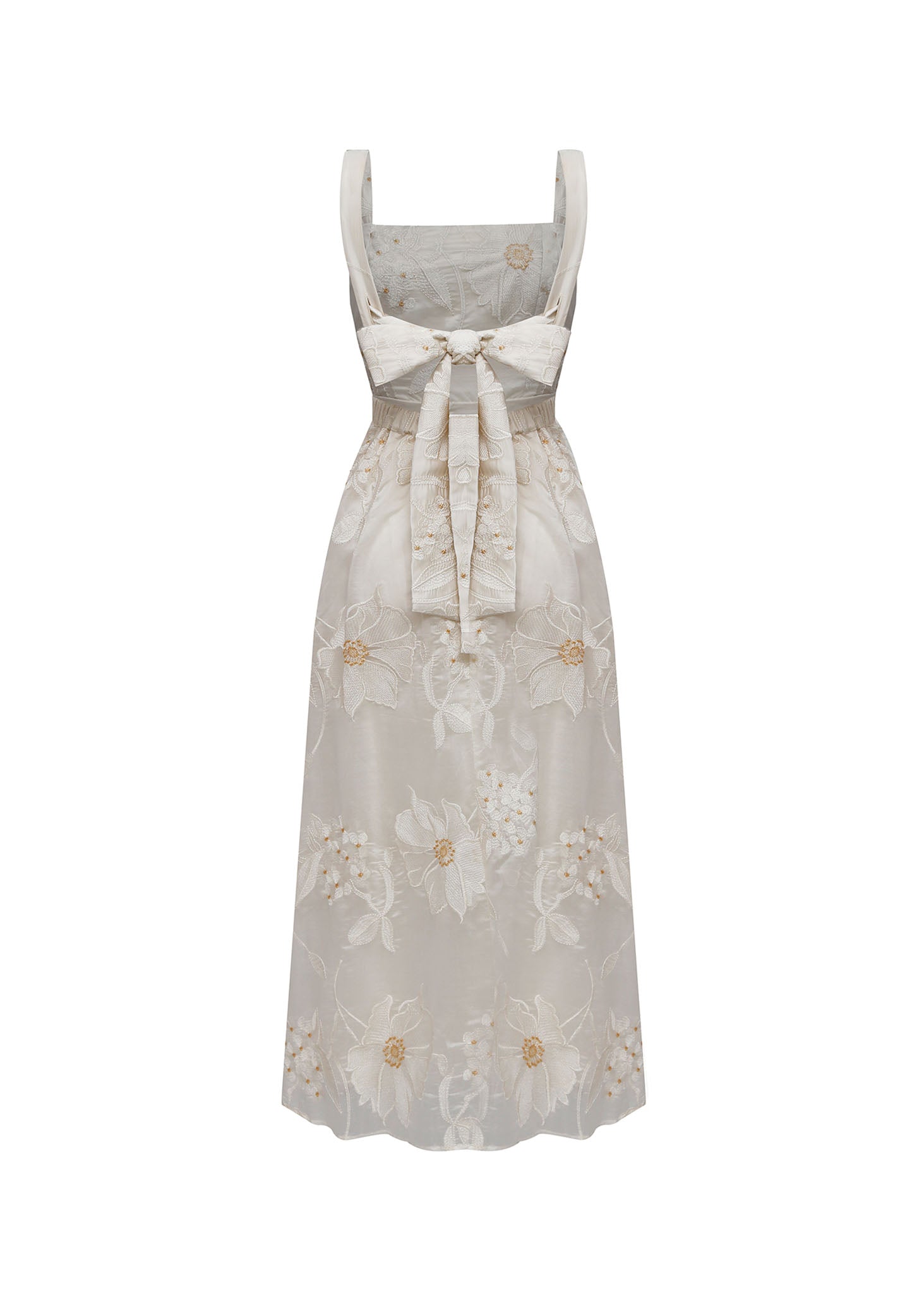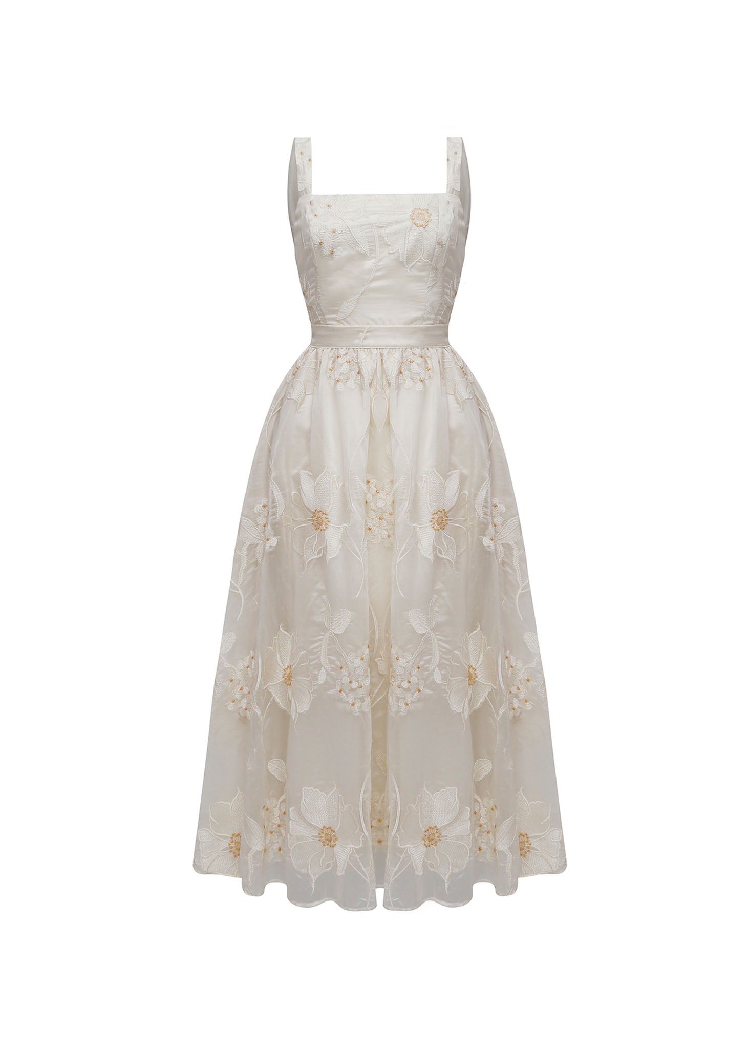 Este encantador vestido midi en blanco roto (off-white) irradia romance. Su escote cuadrado y tirantes anchos enmarcan el diseño, mientras que la falda voluminosa de corte A ofrece una silueta clásica.