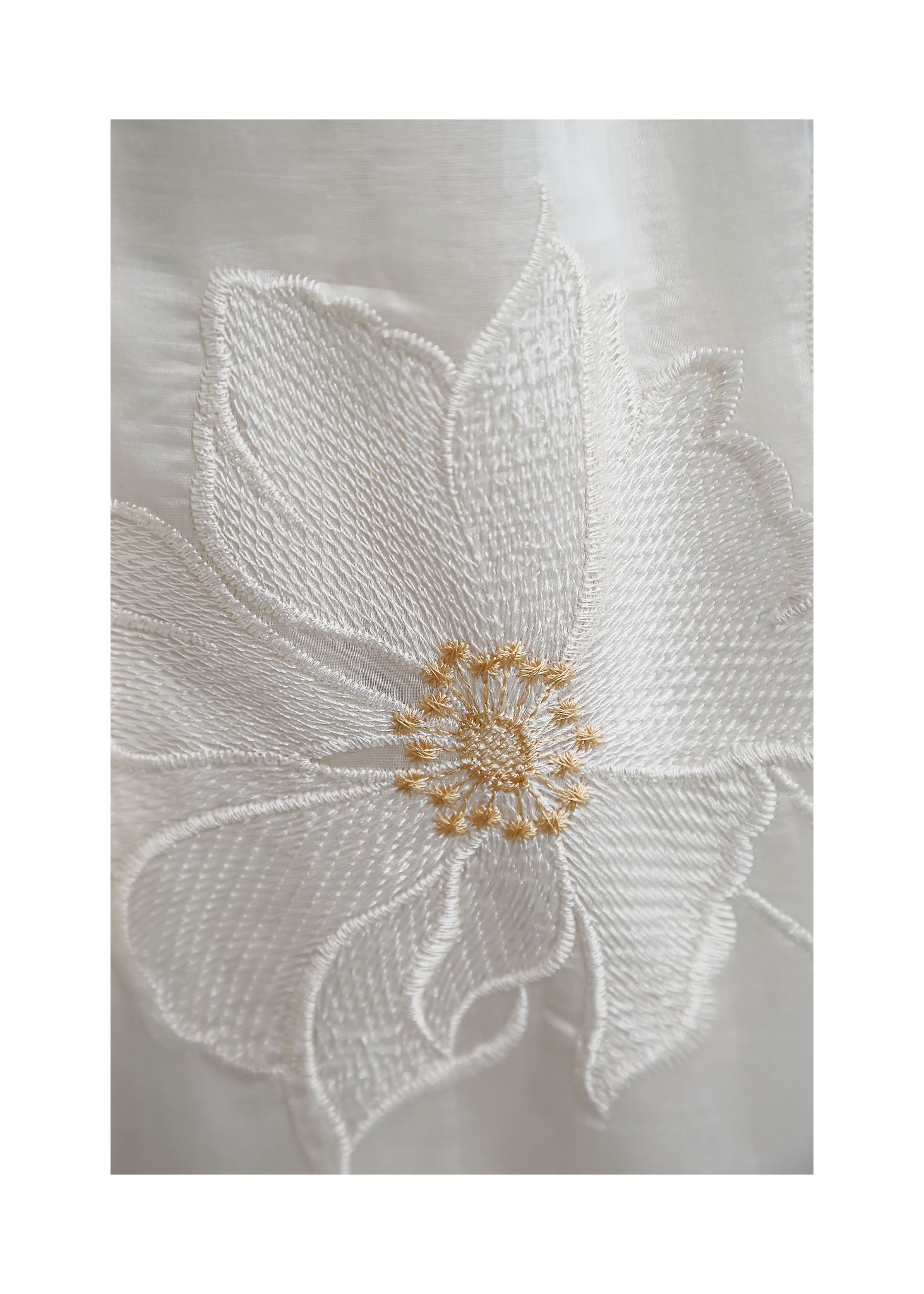 Lo más destacado es el bordado floral 3D por toda la prenda, adornado con pequeñas perlas o abalorios dorados, creando un efecto mágico.