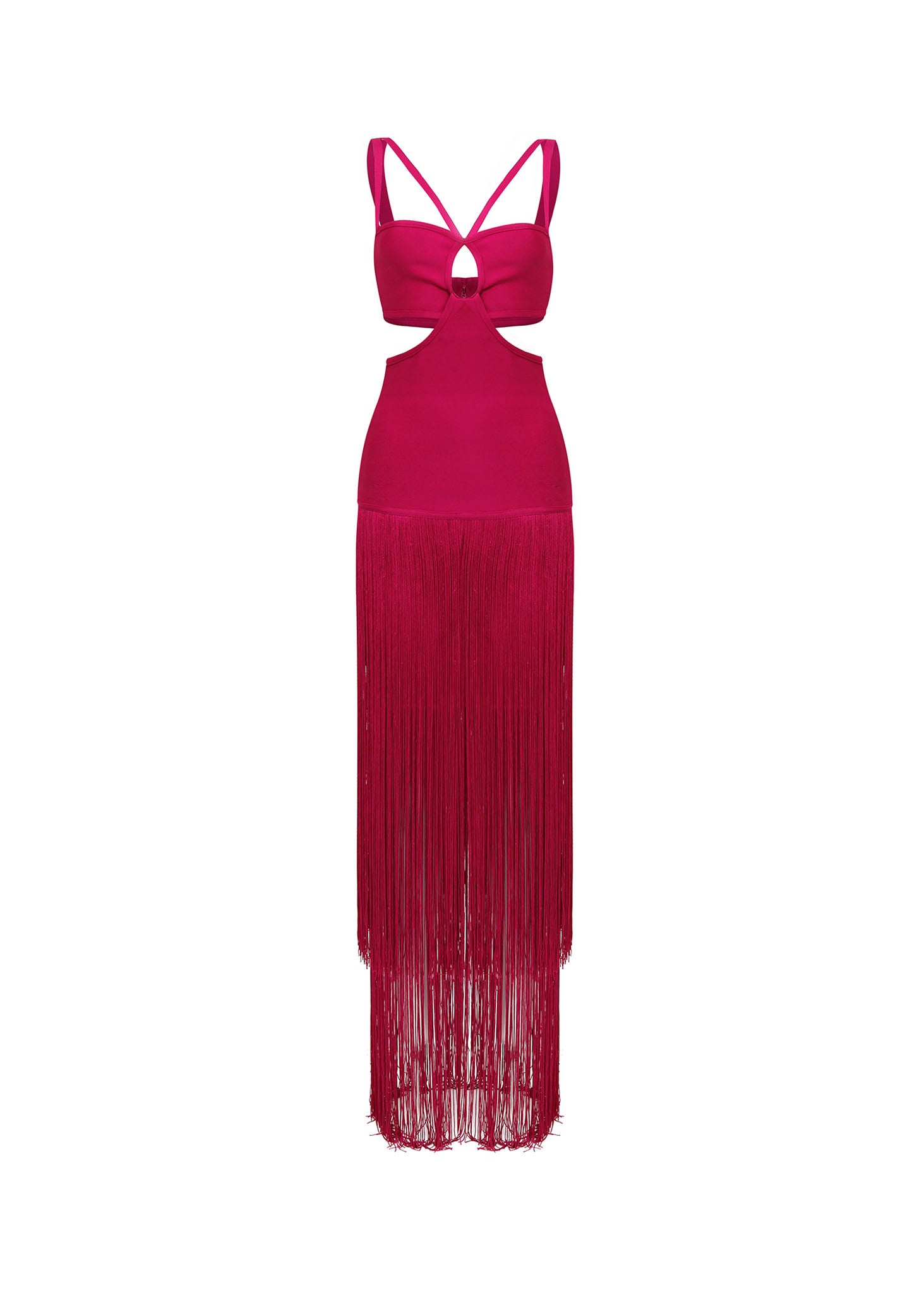 Presenta un atrevido escote sweetheart con tirantes cruzados y un llamativo detalle cut-out en el centro del busto y la cintura. La falda destaca por sus largos flecos que se extienden desde la cadera hasta el suelo, creando un movimiento espectacular al bailar.