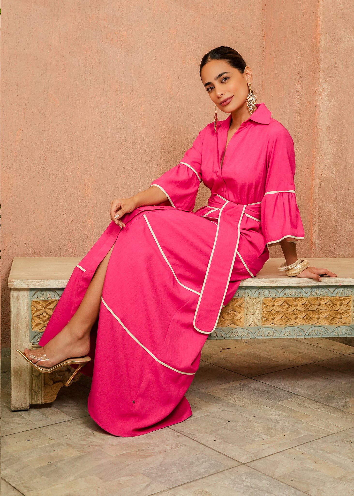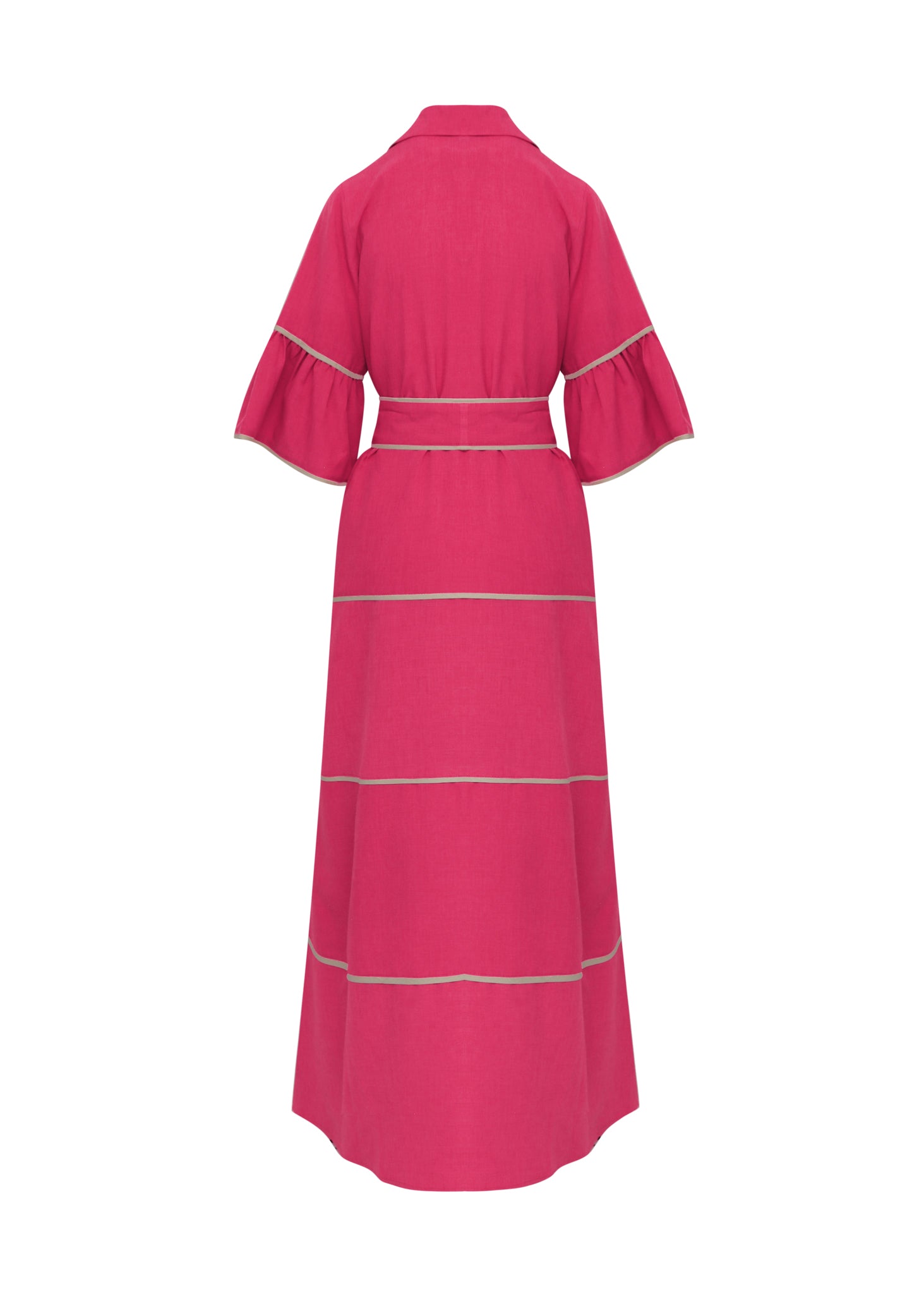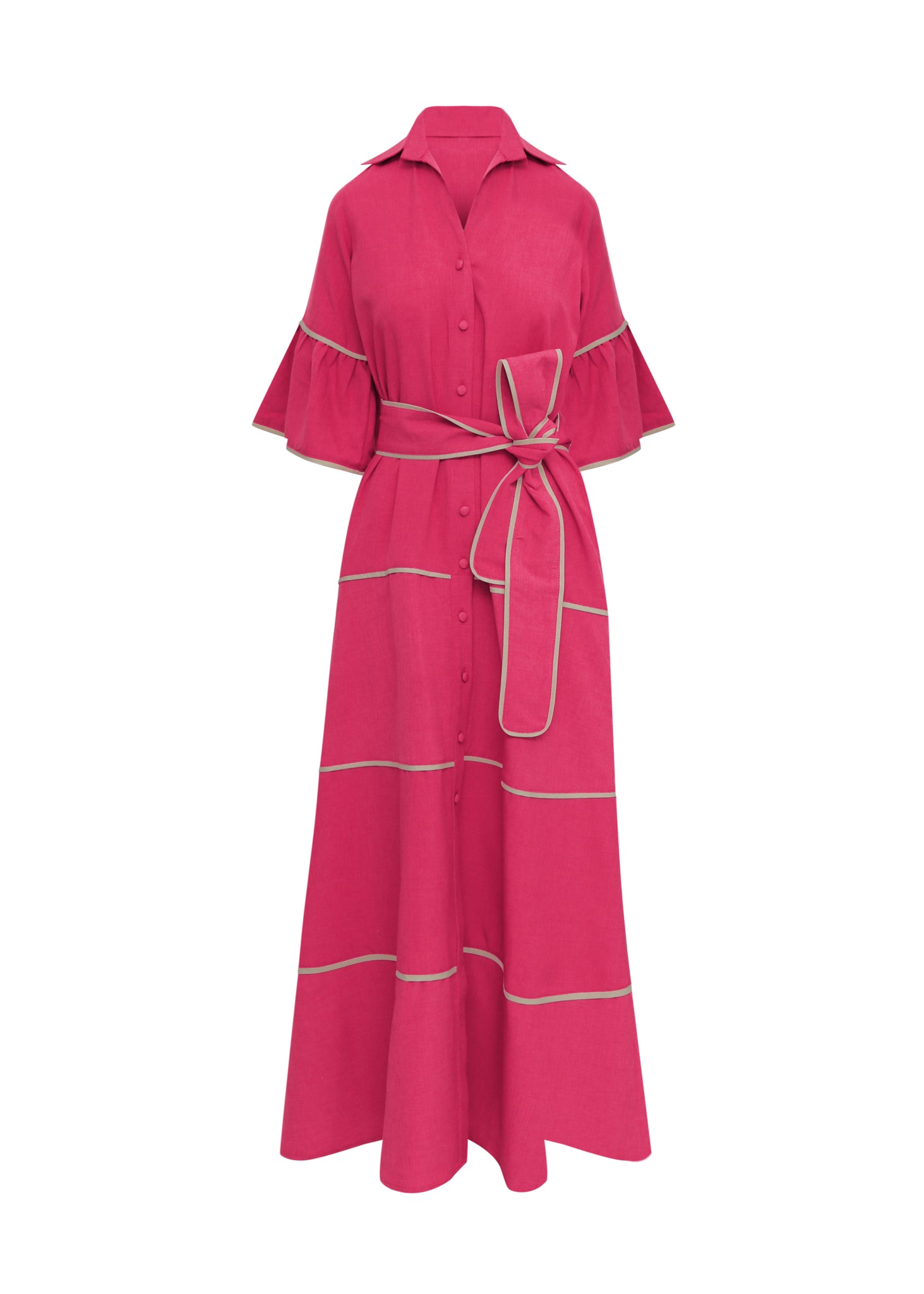 Este vestido largo de estilo camisero es una pieza maestra de la sastrería contemporánea en un profundo tono fucsia quemado o carmesí. El diseño destaca por su juego de líneas horizontales acentuadas con ribetes en contraste de color arena, que recorren tanto la falda como las mangas, creando una estructura visual organizada y moderna.