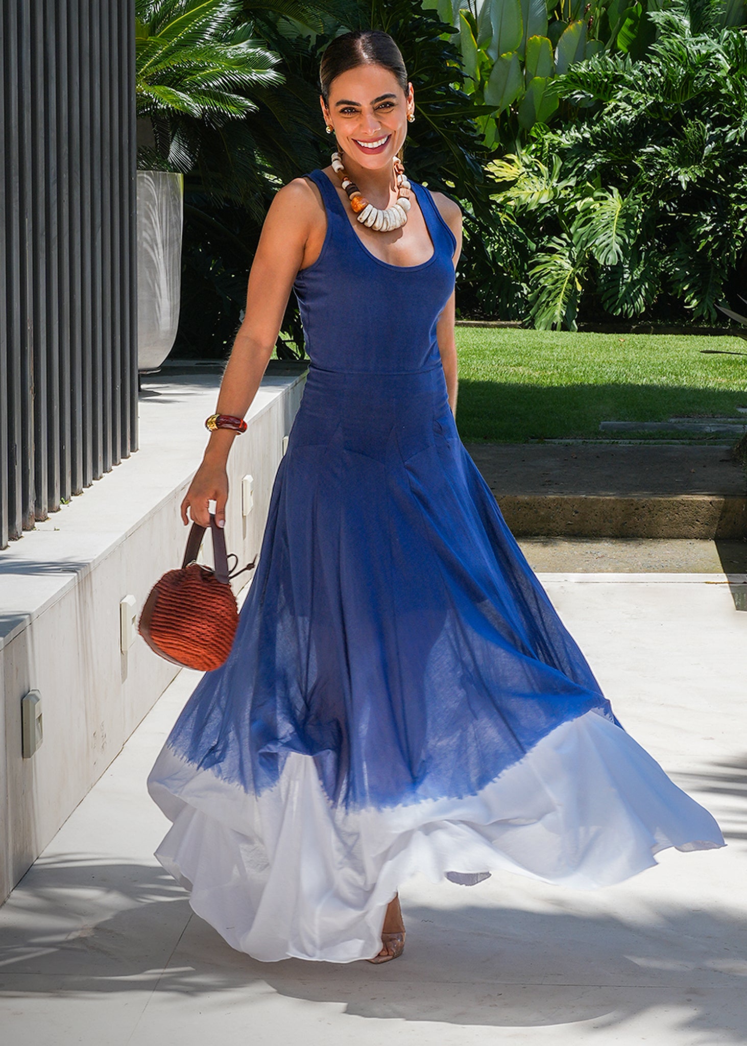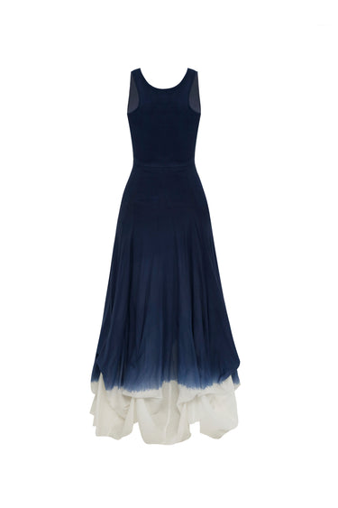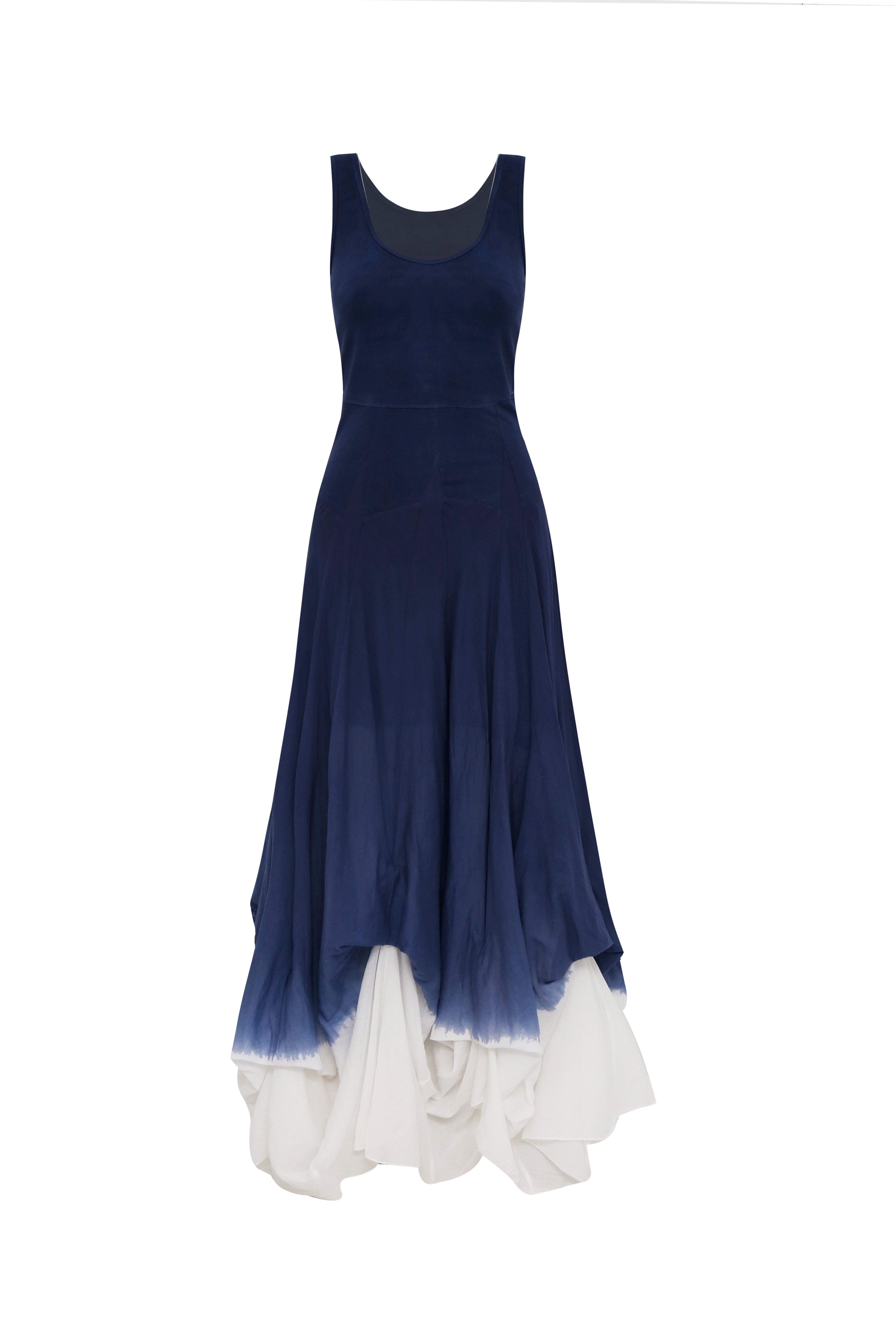 Una pieza que captura la esencia del movimiento y la sofisticación cromática a través de un diseño de vanguardia. El vestido Deep Ocean destaca por su impecable acabado en azul marino profundo, que contrasta magistralmente con un bajo asimétrico en blanco níveo, creando un efecto visual de capas en cascada.