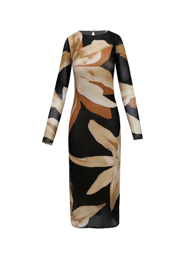 Deslumbra en tu próximo evento con este vestido midi de silueta ajustada. Confeccionado en un tejido de malla semi transparente que realza la figura, el diseño presenta un impactante estampado de flores abstractas en tonos negro, nude y marrón. Este contraste de colores y el diseño de manga larga lo convierten en una pieza sensual y moderna, perfecta para salidas nocturnas, cócteles o fiestas.
