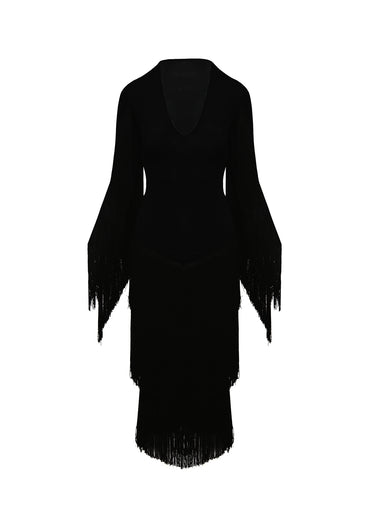 Este vestido de manga larga, ajustado al cuerpo, destaca por sus elegantes flecos que aportan movimiento y dinamismo. Su diseño ceñido realza la figura, mientras que los flecos añaden un toque contemporáneo y sofisticado, ideal para eventos donde se busca un equilibrio entre estilo y comodidad. Perfecto para quienes buscan una prenda que combine tendencia y una silueta favorecedora.