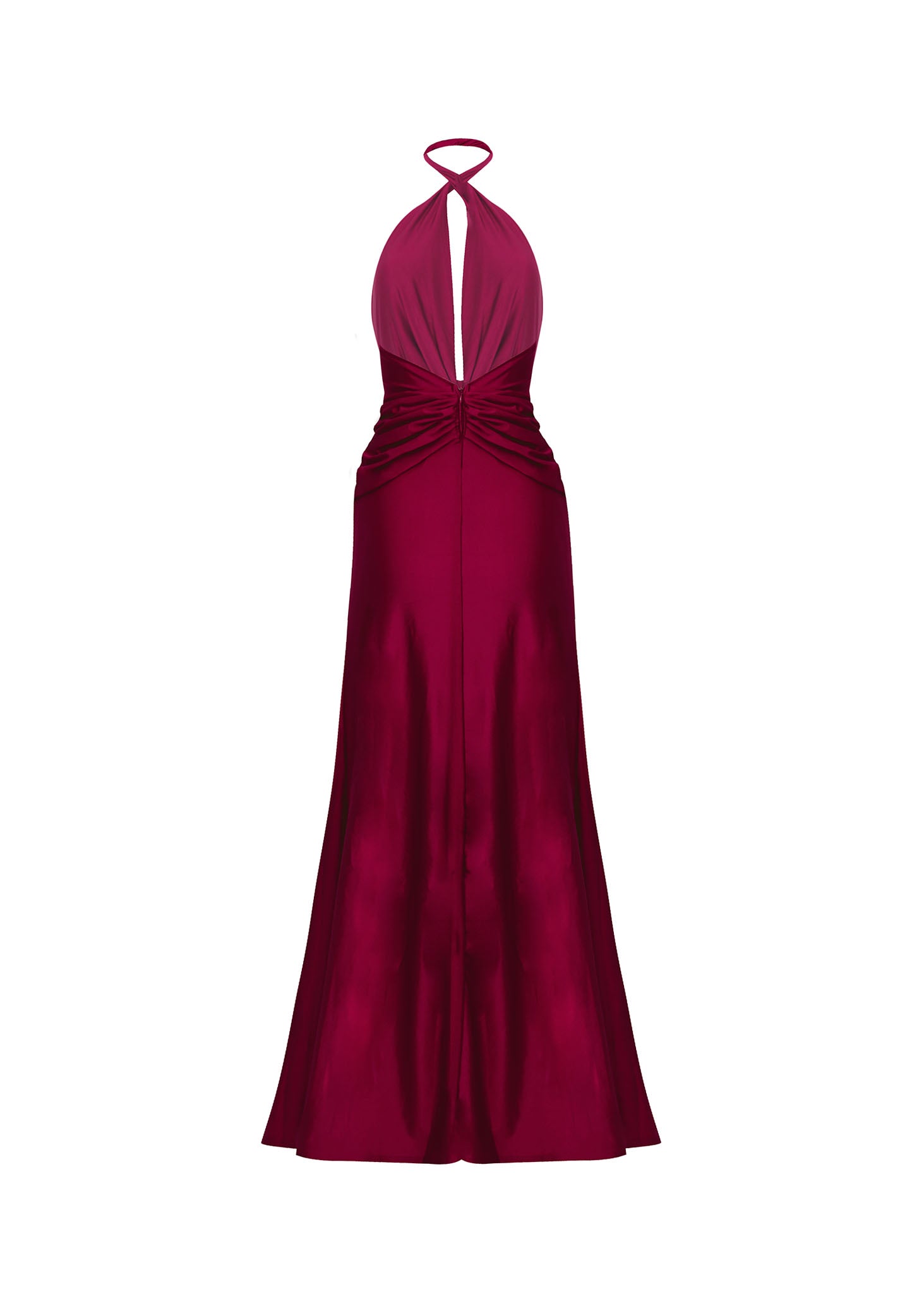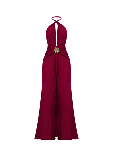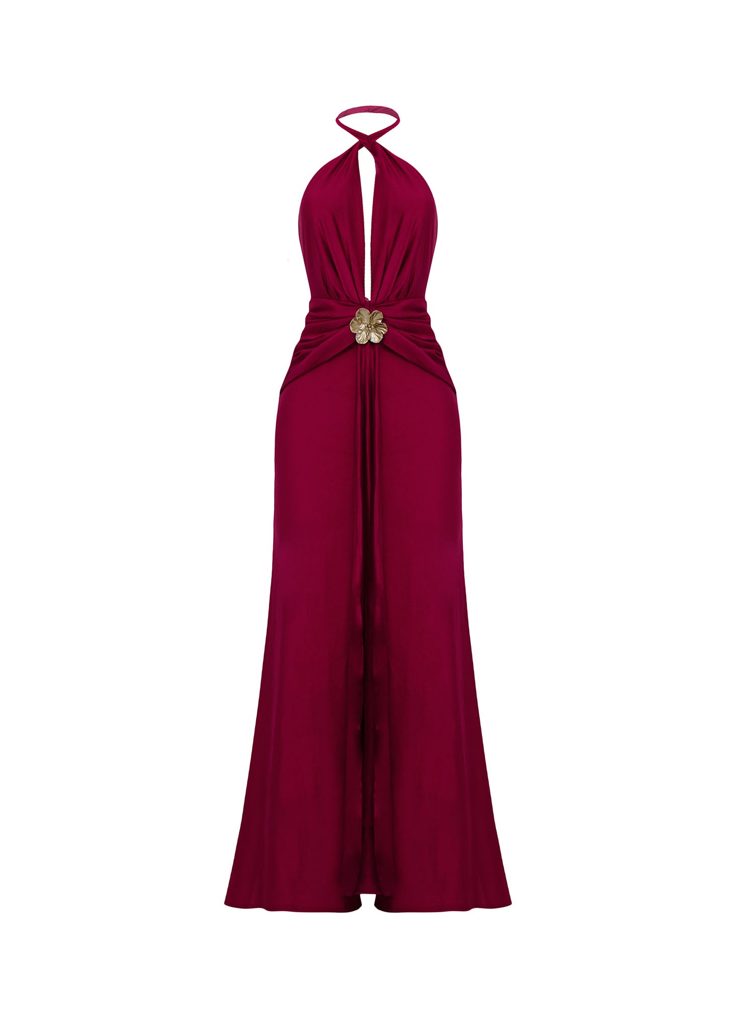 Este impactante vestido de gala en un profundo tono rojo rubí combina una silueta de inspiración clásica con detalles ornamentales de vanguardia. El diseño se articula a través de un sofisticado escote halter cruzado que revela una apertura frontal tipo keyhole, fluyendo hacia un cuerpo magistralmente drapeado que converge en la cintura para estilizar la figura. El punto focal de la pieza es un suntuoso herraje dorado en forma de flor con acabado artesanal, que actúa como eje de los pliegues y aporta un contraste de lujo orgánico al conjunto. Confeccionado en un textil de caída fluida y movimiento regio, la falda de longitud máxima se expande con elegancia, consolidando una estética de alta sofisticación ideal para eventos de etiqueta que demandan una presencia audaz y femenina.