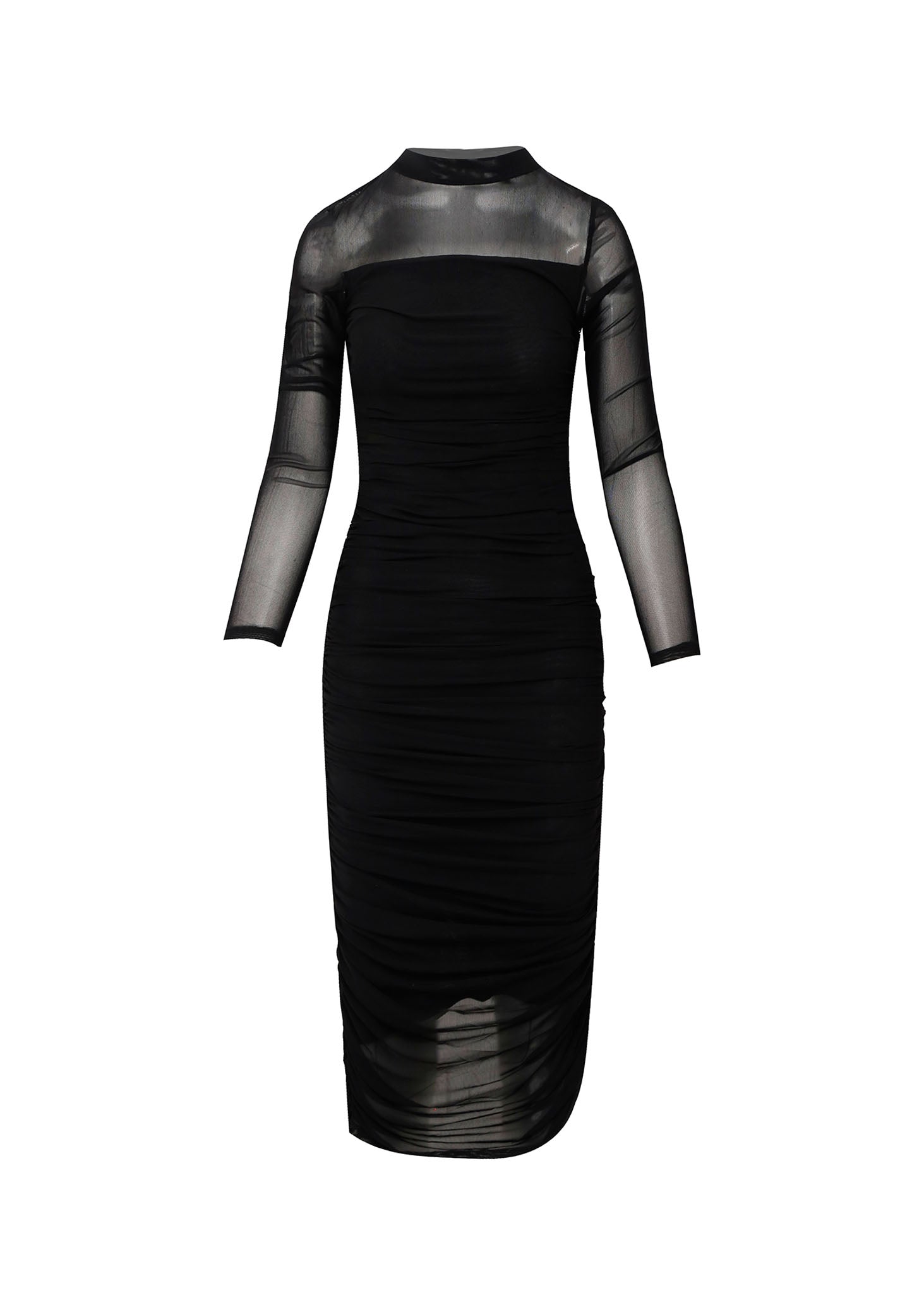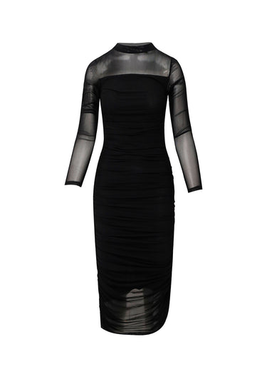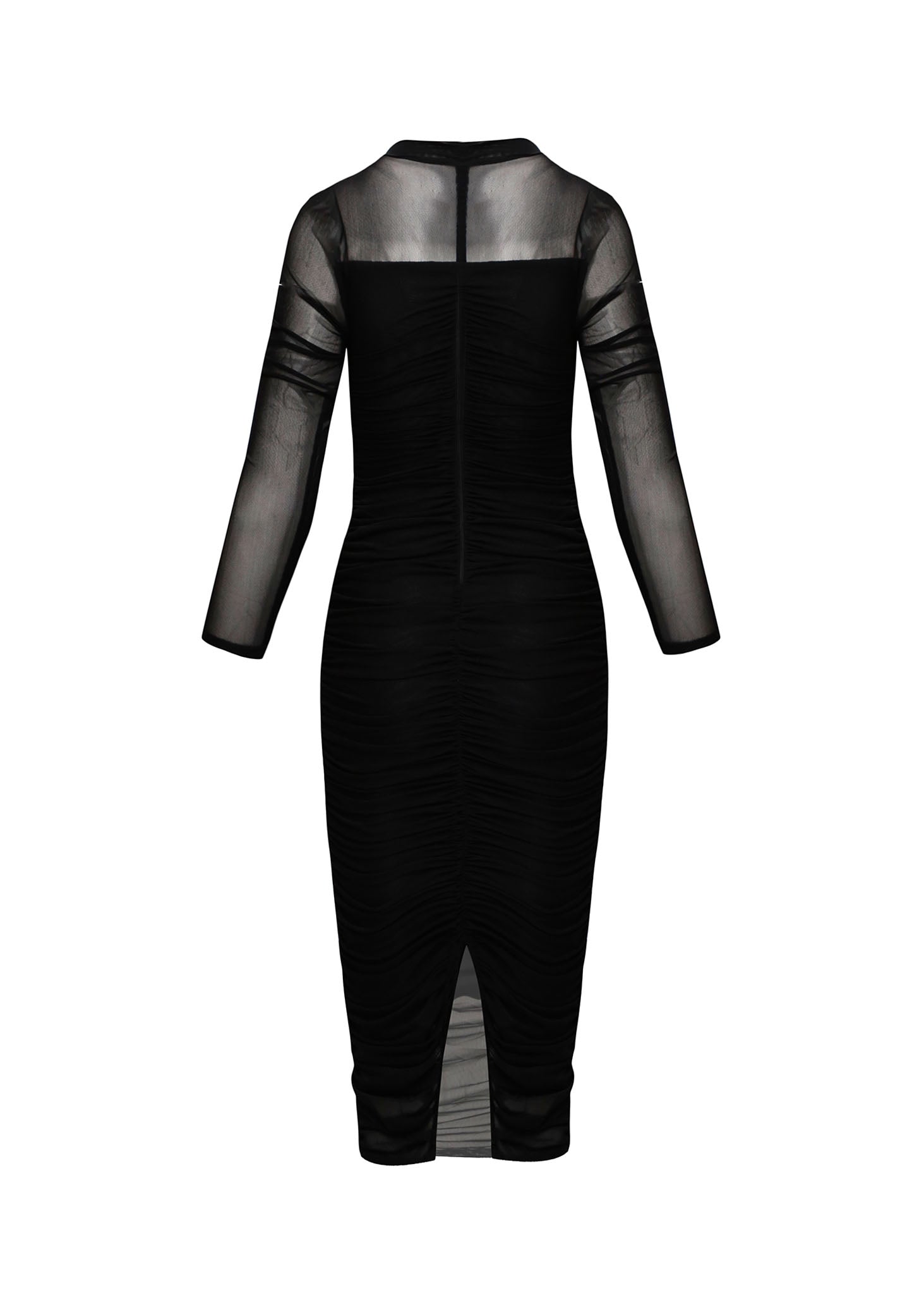 Este sofisticado vestido de gala en negro absoluto destaca por una construcción arquitectónica que utiliza la transparencia y el relieve como elementos centrales de diseño. La pieza presenta una base entallada de silueta midi, recubierta íntegramente por una delicada malla (mesh) que se extiende hasta formar mangas largas y un refinado cuello tipo Perkins. El cuerpo de la prenda exhibe un minucioso trabajo de drapeado horizontal y fruncidos laterales (ruched) que moldean la figura con precisión, creando una textura dinámica que juega con la luz y las sombras. El contraste entre el torso opaco y el canesú traslúcido aporta una sofisticación moderna y audaz, posicionando a este modelo como una opción de etiqueta imprescindible para quienes buscan una elegancia minimalista de alto impacto visual.