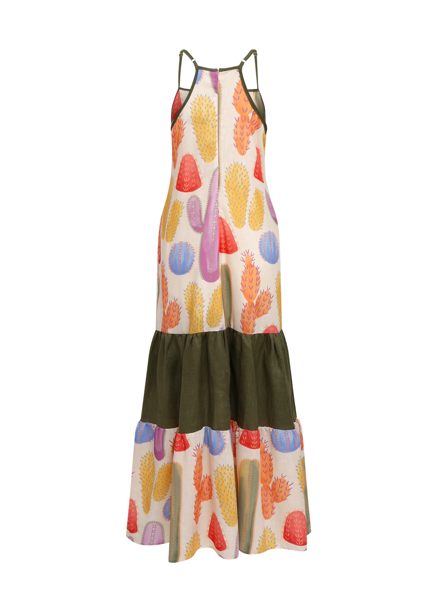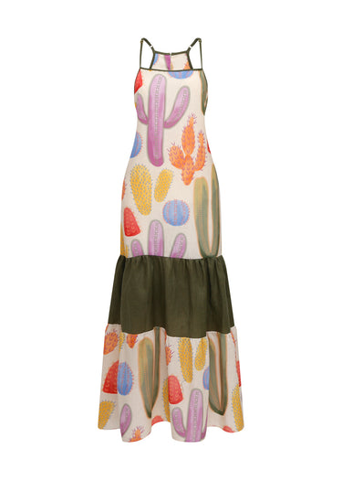 Este es un vestido maxi de estilo bohemio y veraniego. Presenta un vibrante estampado de cactus en colores como rosa, naranja, amarillo, azul y verde sobre un fondo claro. El diseño es de tirantes finos, con un escote que muestra los hombros y la espalda. La silueta es entallada hasta la cadera, donde tiene un corte horizontal. La falda del vestido está dividida en dos volantes: el superior es de color verde militar, creando un contraste sólido con el estampado, y el inferior vuelve a tener el mismo patrón de cactus.
