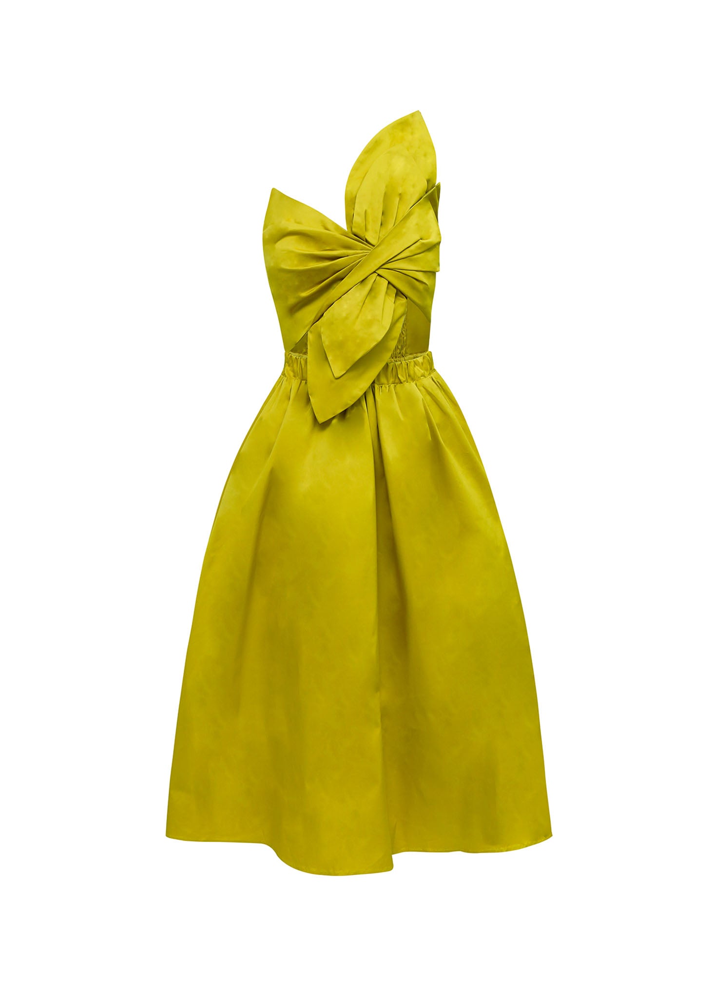 Este vestido midi es una pieza audaz y sofisticada, perfecta para cualquier evento donde quieras ser el centro de atención. El diseño se destaca por un gran moño que adorna el hombro izquierdo, creando una silueta asimétrica y un punto focal. La falda, con un corte acampanado y voluminoso, proporciona un movimiento espectacular y un aire de cuento de hadas.