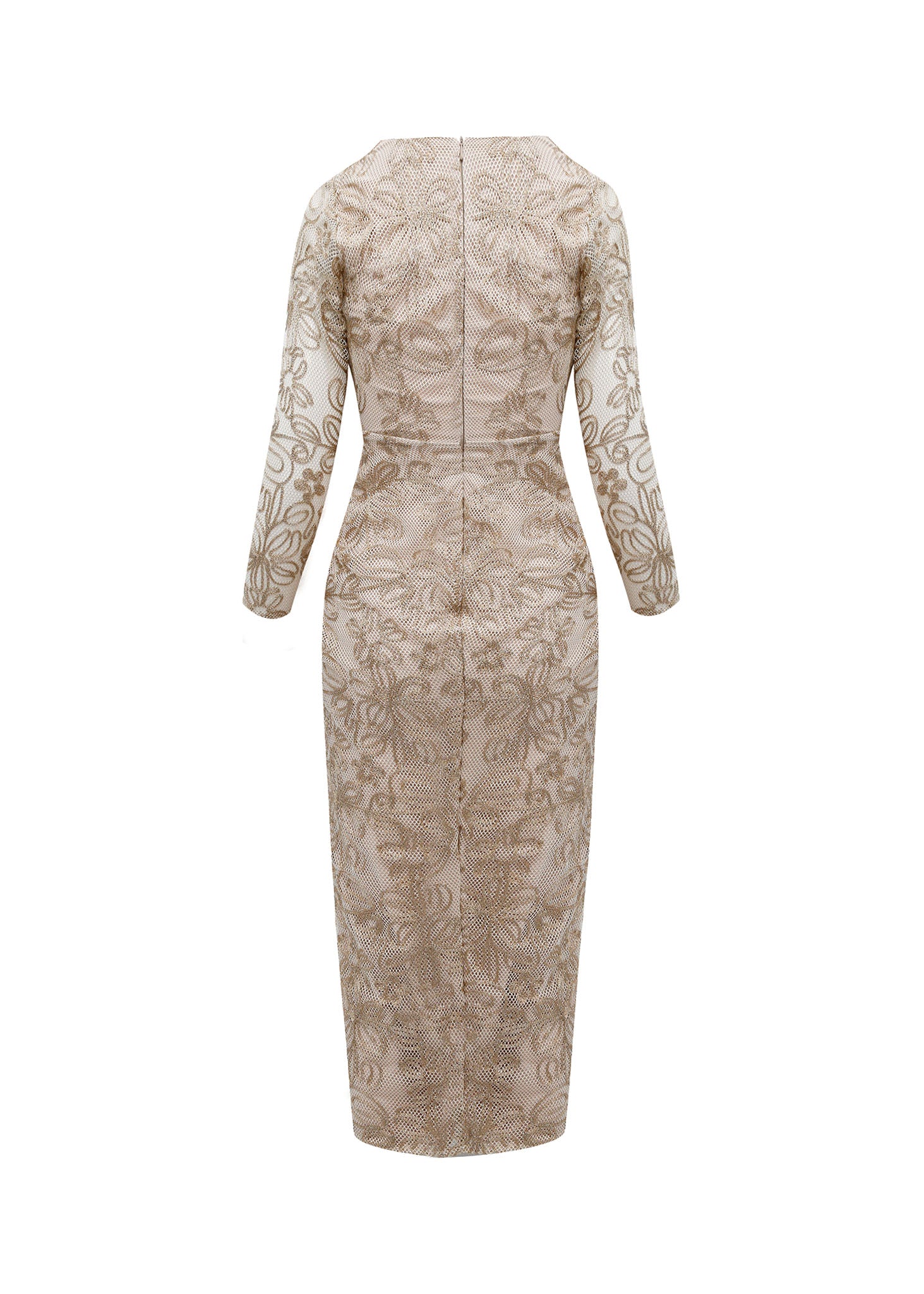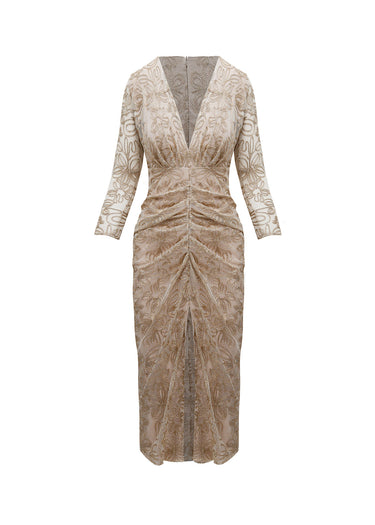 Este impresionante vestido midi es la personificación de la elegancia y el glamour sofisticado. Confeccionado en un tejido de base neutra, presenta un exquisito bordado de lentejuelas doradas o color champán que dibuja un intrincado patrón floral o geométrico por toda la pieza, creando un efecto de brillo sutil y lujoso.El diseño destaca por su favorecedor escote en V profundo y las mangas largas que ofrecen una cobertura chic y estilizada.