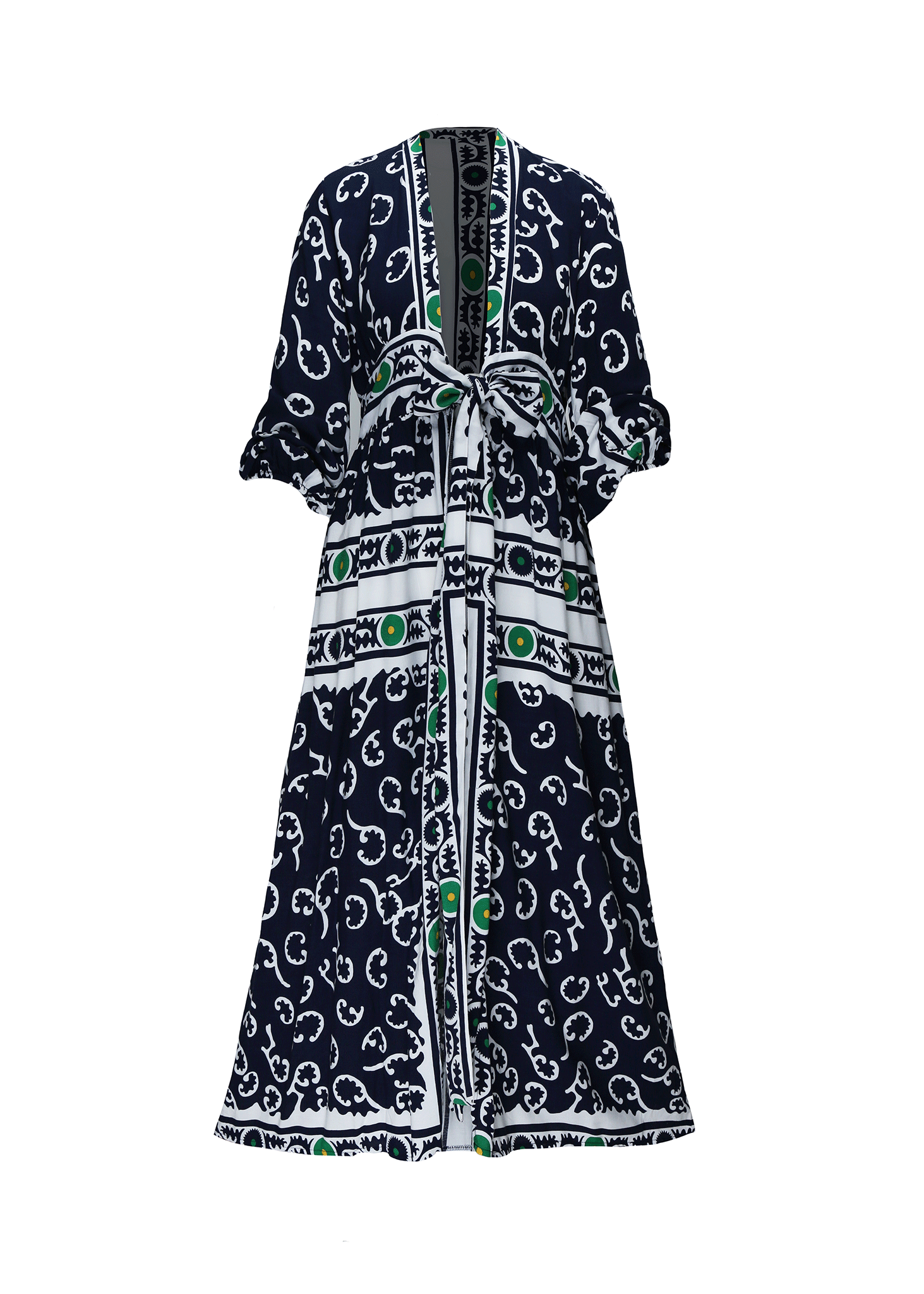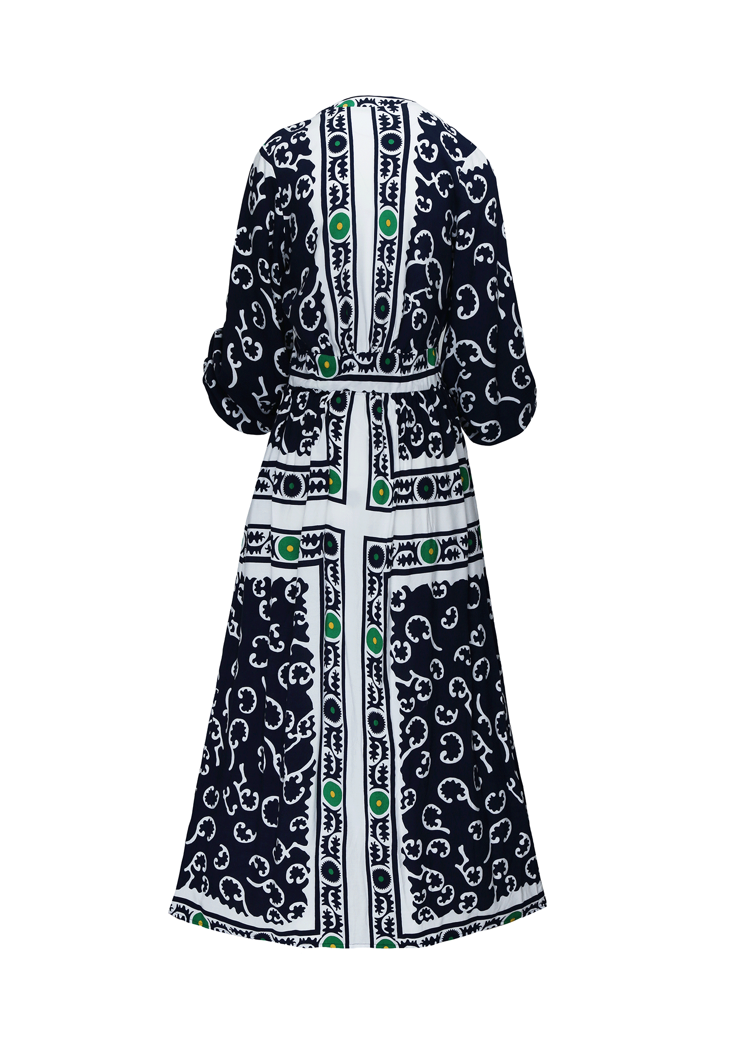 La prenda está confeccionada en un tejido ligero de color azul marino profundo, decorado con un estampado ornamental de inspiración étnica en blanco óptico y detalles en verde esmeralda y amarillo mostaza. El diseño presenta un escote en "V" profundo que se ajusta a la cintura mediante una lazada ancha tipo faja, la cual permite entallar la figura y crea un volumen acampanado en la falda. Las mangas son de largo tres cuartos y cuentan con un puño elástico fruncido que añade una dimensión táctil y estructural. Los paneles del estampado están dispuestos estratégicamente para enmarcar el torso y el bajo, logrando una pieza de lujo bohemio ideal para eventos de verano o estilismos de viaje refinados.