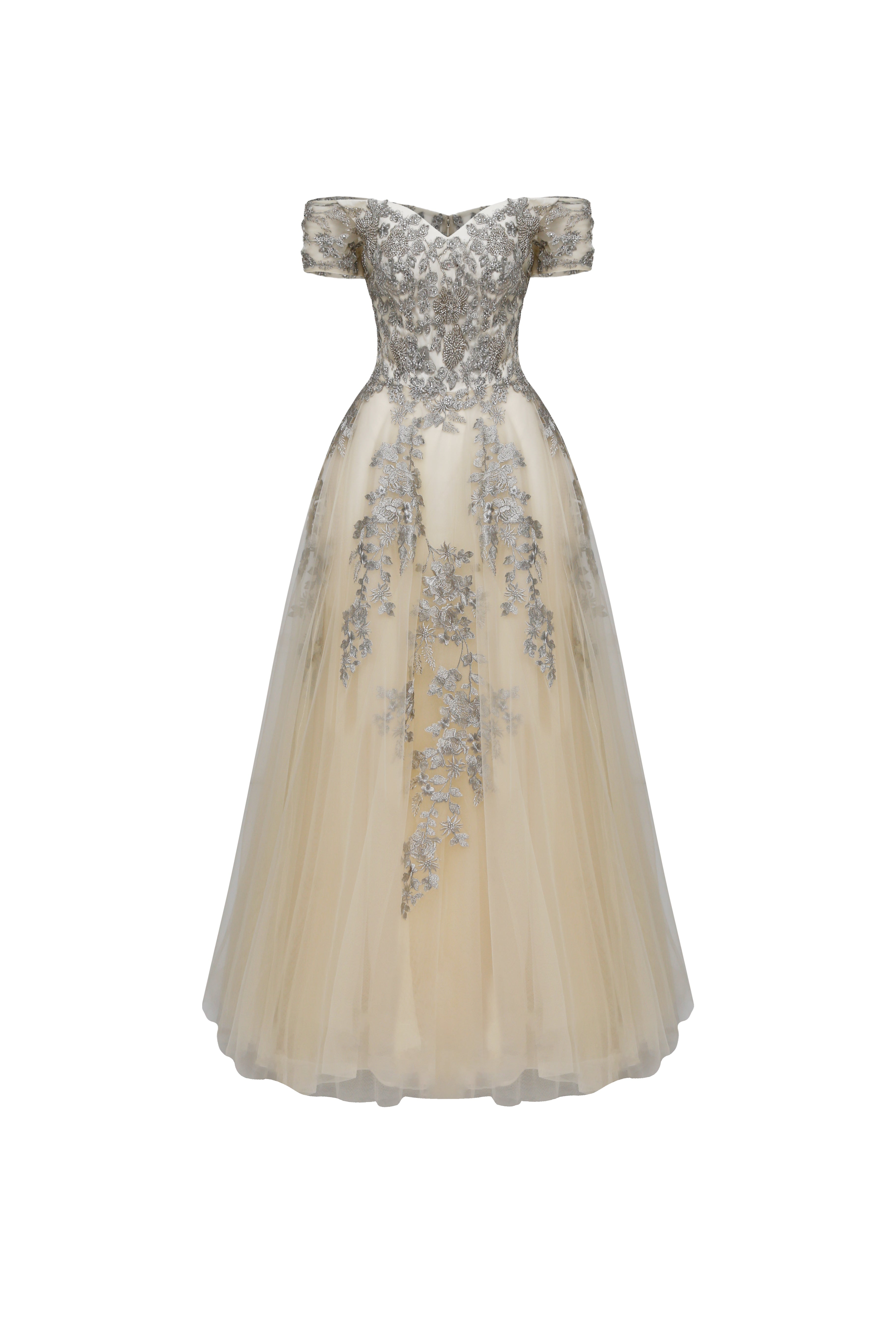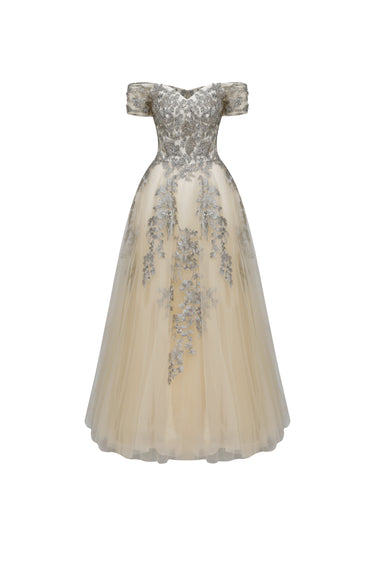 Vestido recamado en beige que combina elegancia y movimiento. Confeccionado con detalles bordados que realzan su diseño, cuenta con una falda en tul que añade volumen y gracia a cada paso. Perfecto para ocasiones especiales donde deseas destacar con un toque sofisticado y femenino. La combinación de texturas crea un efecto visual cautivador que te hará sentir segura y hermosa.