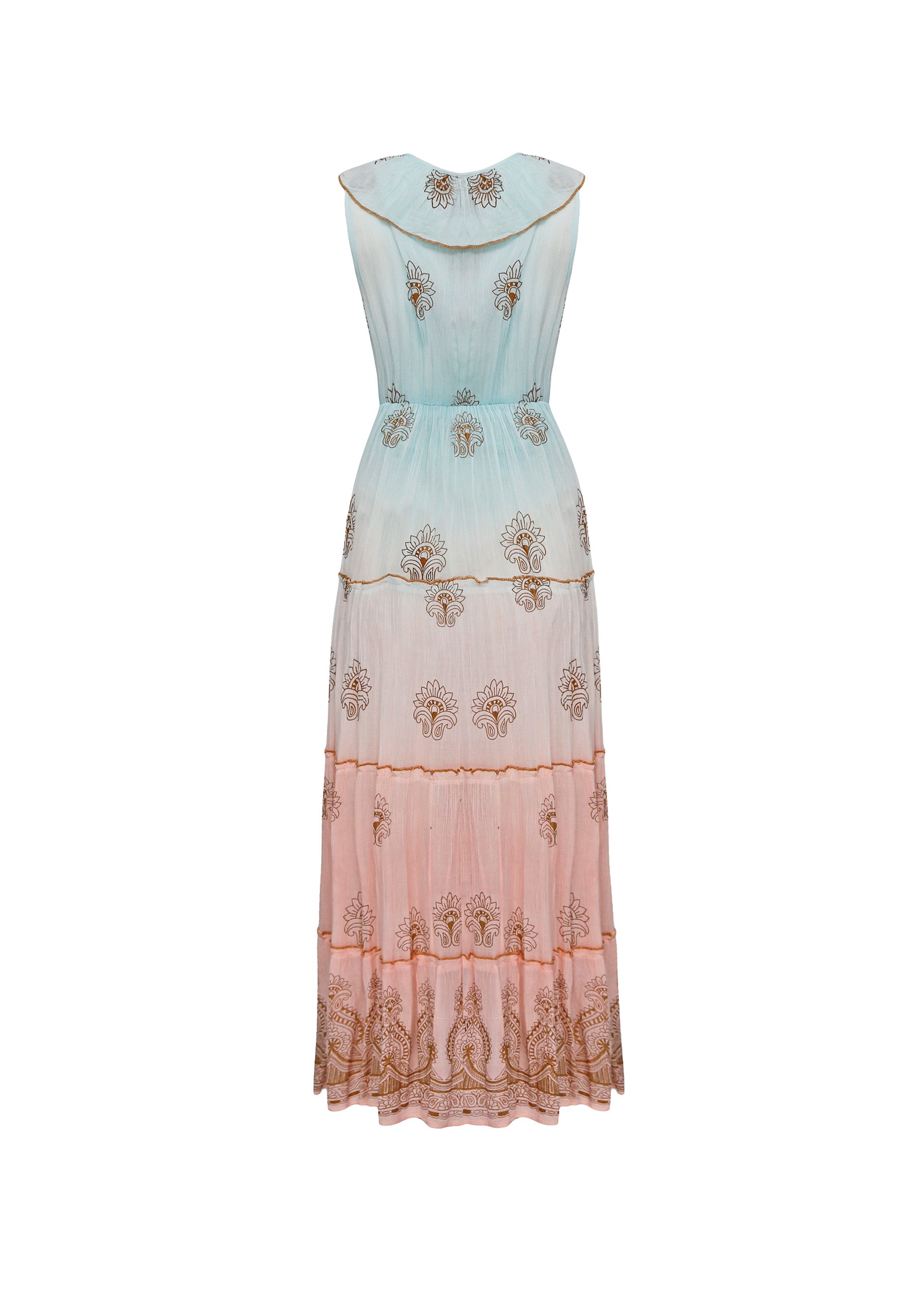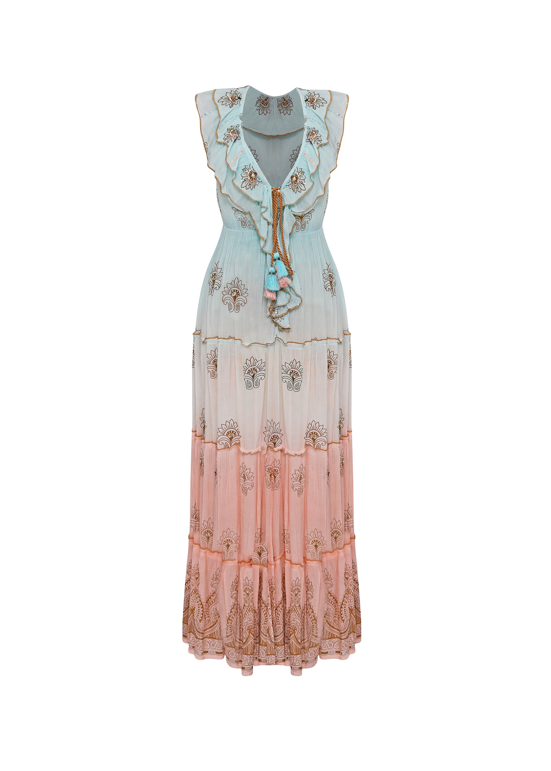 Este vestido largo de estética bohemia con efecto ombré es una pieza de diseño etéreo que destaca por su suave degradado cromático, evolucionando desde un azul pastel en el cuerpo superior hasta un rosa empolvado en el bajo. La prenda presenta un profundo escote en "V" enmarcado por volantes dobles con acabados festoneados en contraste, que aportan un volumen romántico y enmarcan la zona del pecho.