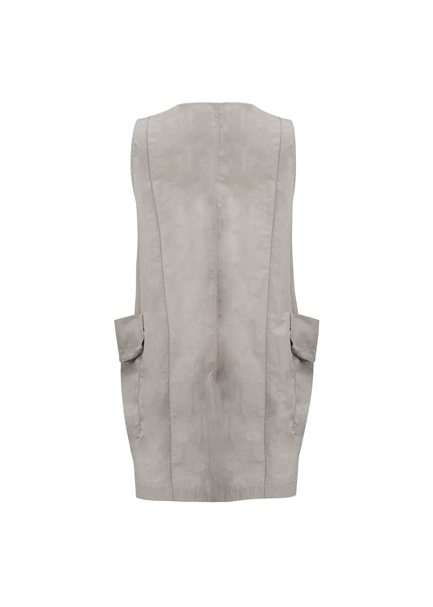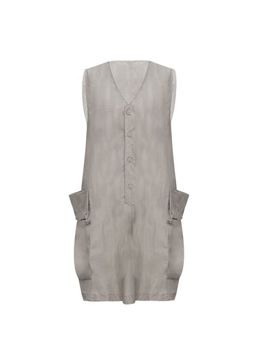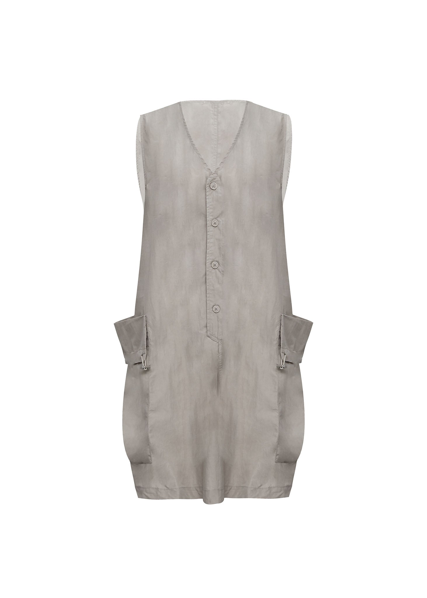 Este vestido túnica es la definición del lujo utilitario, diseñado para ofrecer una estética moderna y funcional sin renunciar a la ligereza. La prenda, confeccionada en un tejido de lino o mezcla técnica en color gris piedra, presenta una silueta recta y minimalista que favorece la libertad de movimiento.