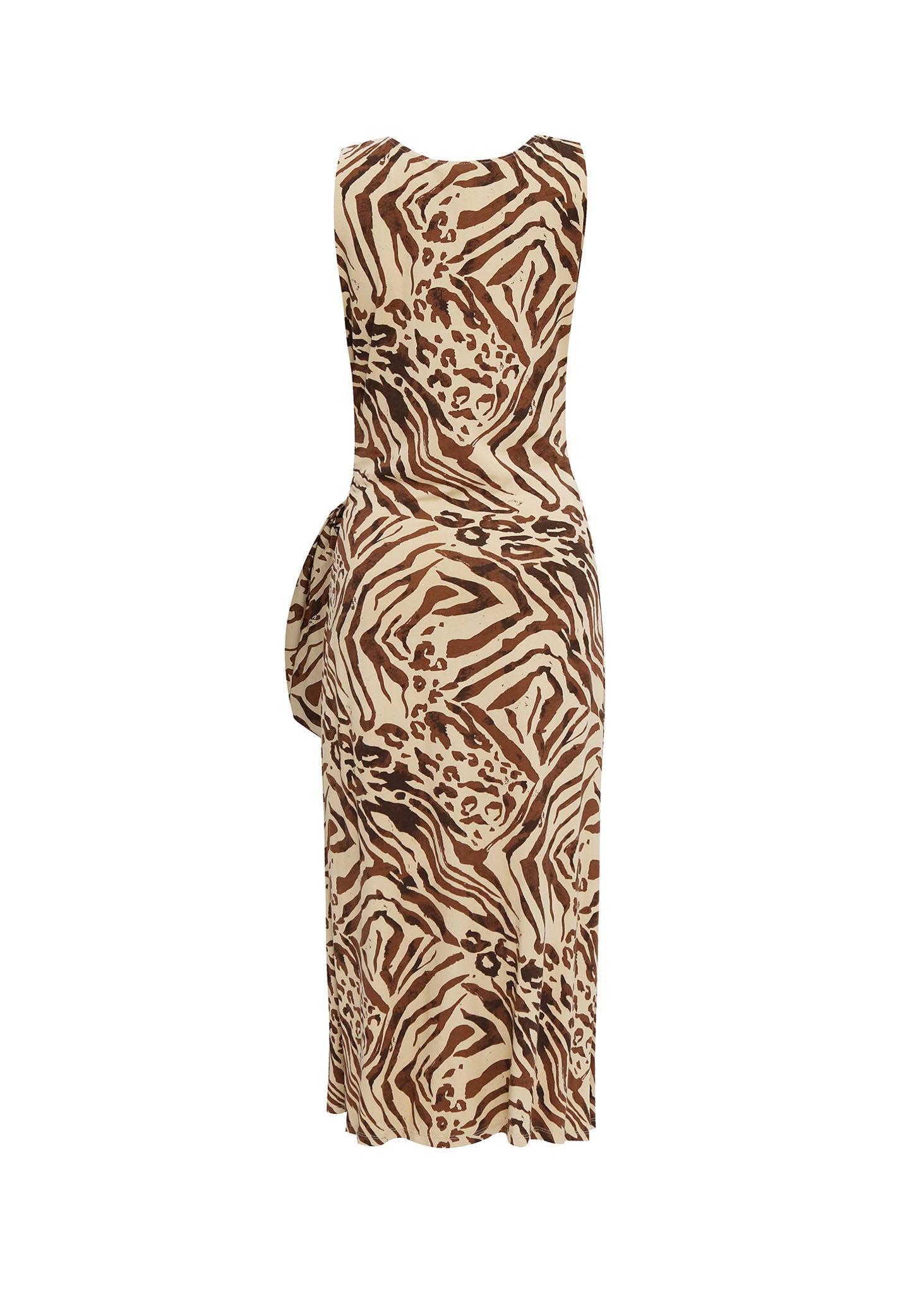 El diseño presenta un cuello redondo cerrado y una silueta sin mangas, que equilibra la audacia del estampado con una línea minimalista en la parte superior. El elemento protagonista es el detalle de nudo lateral en la cintura, que genera un drapeado asimétrico muy favorecedor, diseñado para esculpir la figura y crear pliegues naturales que aportan movimiento a la falda. Confeccionado en un tejido elástico de tacto suave que se adapta al cuerpo como una segunda piel, este vestido es la opción ideal para un "look" de cóctel exótico o un evento veraniego donde se busque una elegancia vibrante y salvaje.