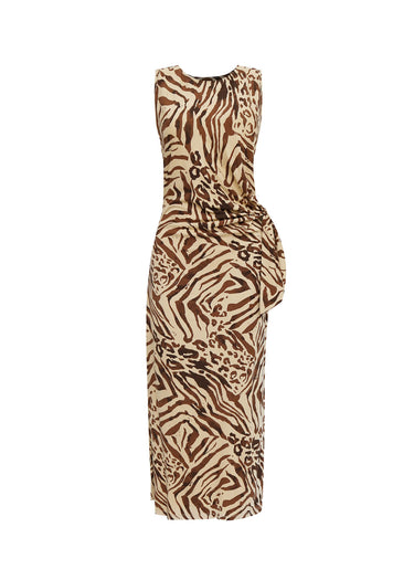 Este vestido midi de silueta ajustada en una cálida paleta de tonos arena y café es una pieza que redefine el animal print a través de una construcción sofisticada y orgánica. La prenda destaca por su diseño híbrido de estampados, fusionando patrones de cebra y manchas de leopardo de forma artística por toda la superficie.