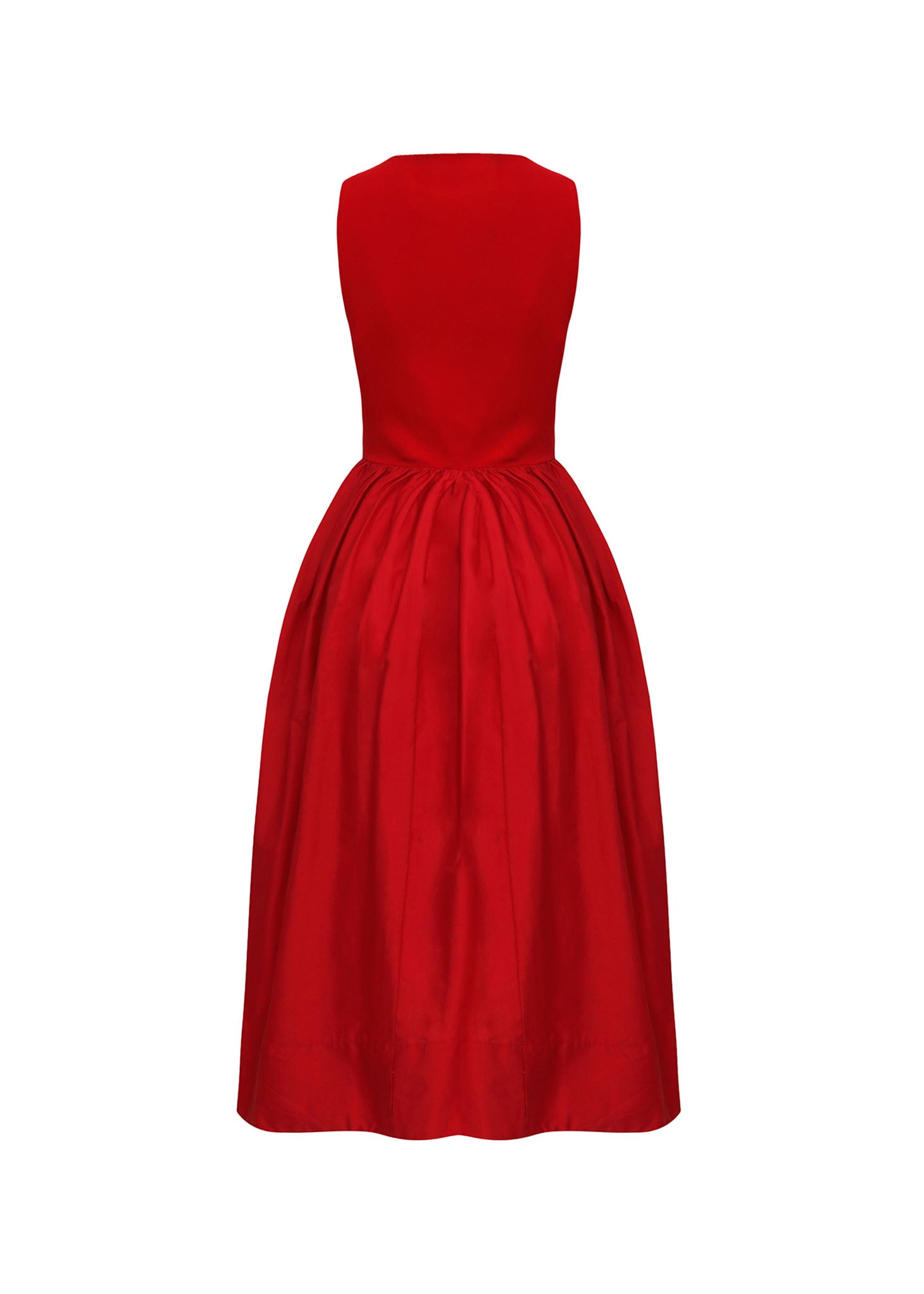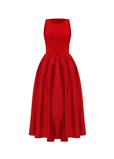 Este impactante vestido midi en un vibrante rojo carmín personifica la elegancia atemporal mediante un juego magistral de volúmenes y proporciones. La prenda presenta un talle entallado de diseño minimalista con cuello redondo y silueta sin mangas, que estiliza el torso de manera impecable. De la cintura nace una falda de corte acampanado y volumen dramático, enriquecida con múltiples pliegues y frunces que aportan un movimiento regio y sofisticado. Confeccionado en un tejido con cuerpo y un acabado satinado muy sutil, este vestido logra un equilibrio perfecto entre la sobriedad del diseño contemporáneo y la opulencia de la moda clásica. Es la pieza definitiva para eventos de gala o celebraciones de etiqueta donde se busca una presencia audaz y refinada.