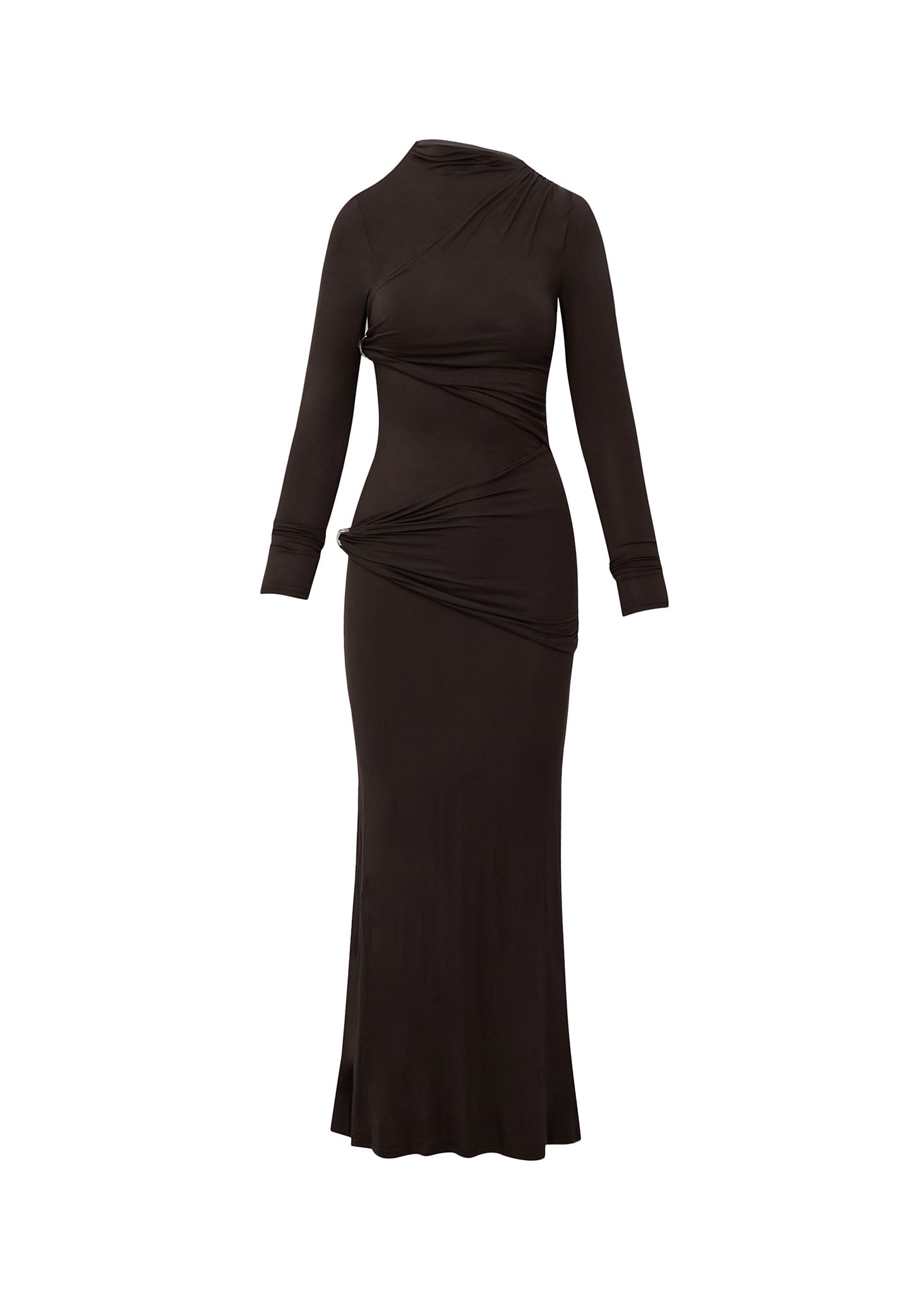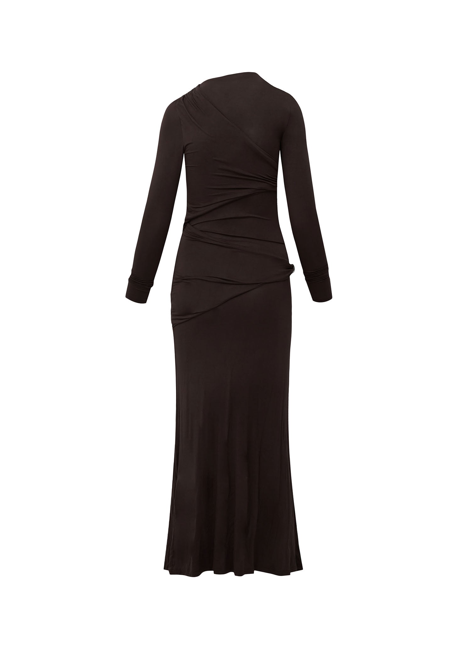 Este sofisticado vestido de gala en un profundo tono café chocolate personifica el minimalismo escultural mediante un diseño que celebra la forma y el drapeado técnico. La pieza presenta una silueta de corte sirena que se ciñe magistralmente al cuerpo, destacando por un cuello Perkins asimétrico desde el cual nacen pliegues transversales que recorren el torso. Estos drapeados convergen en discretos herrajes laterales, creando una estructura visual dinámica que estiliza la cintura y aporta un movimiento fluido a la tela. Confeccionado con mangas largas ajustadas y una falda que se expande suavemente hacia el bajo, este vestido fusiona la sobriedad del diseño contemporáneo con una elegancia arquitectónica, ideal para eventos de etiqueta que demandan una sofisticación pulida y vanguardista.