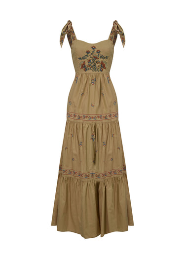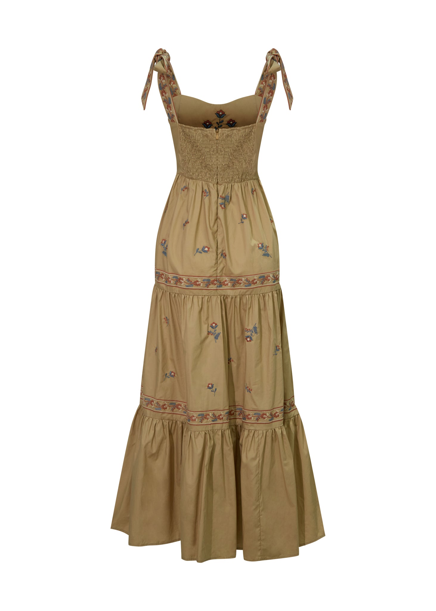 Su diseño presenta un cuerpo entallado con escote corazón y unos delicados tirantes anchos que culminan en románticas lazadas sobre los hombros, permitiendo un ajuste personalizado. La falda, de longitud midi, se despliega en paneles escalonados con un volumen ligero y fluido, acentuado por cenefas bordadas que recorren cada nivel. Confeccionado en una popelina de algodón premium, este vestido es la elección ideal para eventos al aire libre o destinos vacacionales de lujo.
