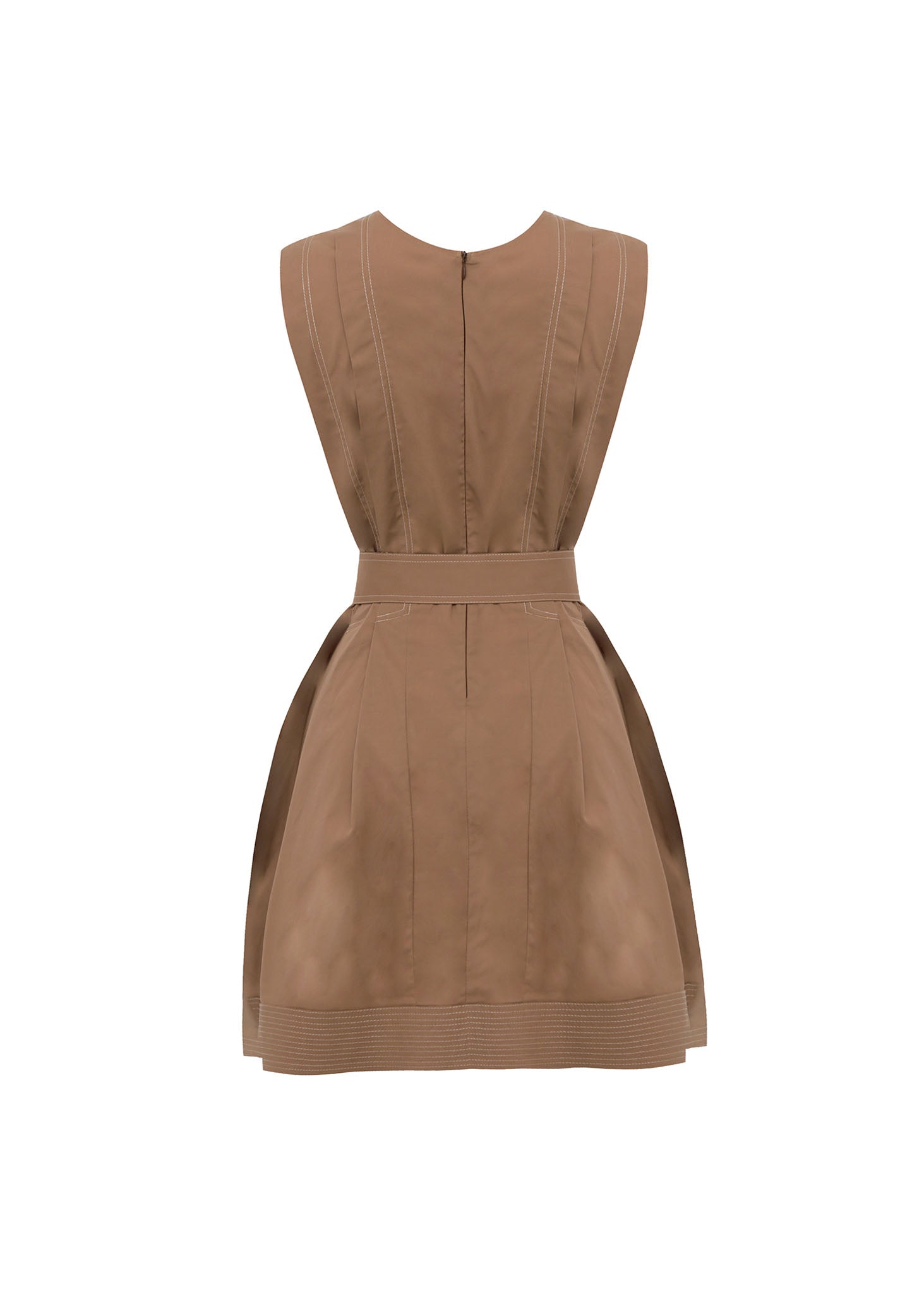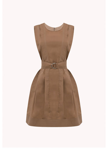Este vestido corto destaca por una arquitectura textil de inspiración utilitaria y una sofisticada construcción de paneles estructurados. La prenda presenta un cuello redondo y una silueta sin mangas definida por pespuntes lineales en contraste que recorren verticalmente el torso, enfatizando una estética pulida y técnica. El diseño incluye un cinturón ancho coordinado con hebilla de doble aro metálico, que ciñe la cintura para crear una falda de volumen controlado y pliegues discretos. Confeccionado en un tejido de alta densidad en tono tabaco, el bajo está rematado con múltiples filas de costuras ornamentales que aportan rigidez y un acabado de alta calidad. Es una pieza versátil que equilibra la funcionalidad moderna con la elegancia sartorial contemporánea.