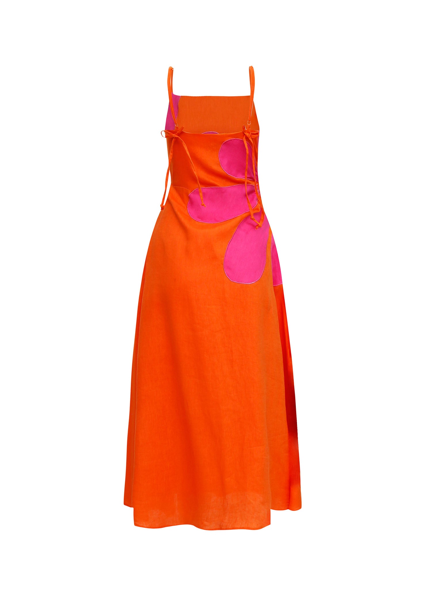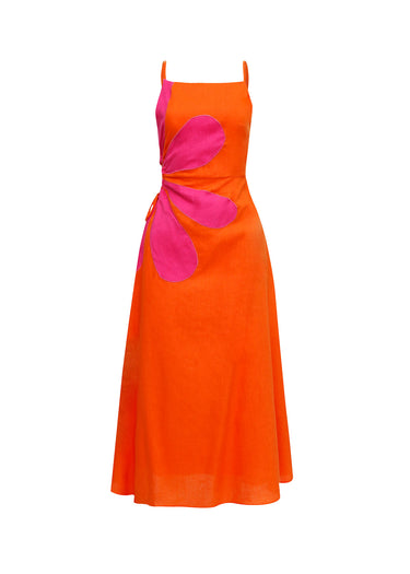 Este vestido midi de tirantes finos es una pieza que irradia audacia y modernidad a través de la técnica del color-block. Confeccionado en un intenso naranja magnético, el diseño rompe con la monocromía mediante una imponente flor geométrica en color fucsia vibrante que nace desde un lateral de la cintura.