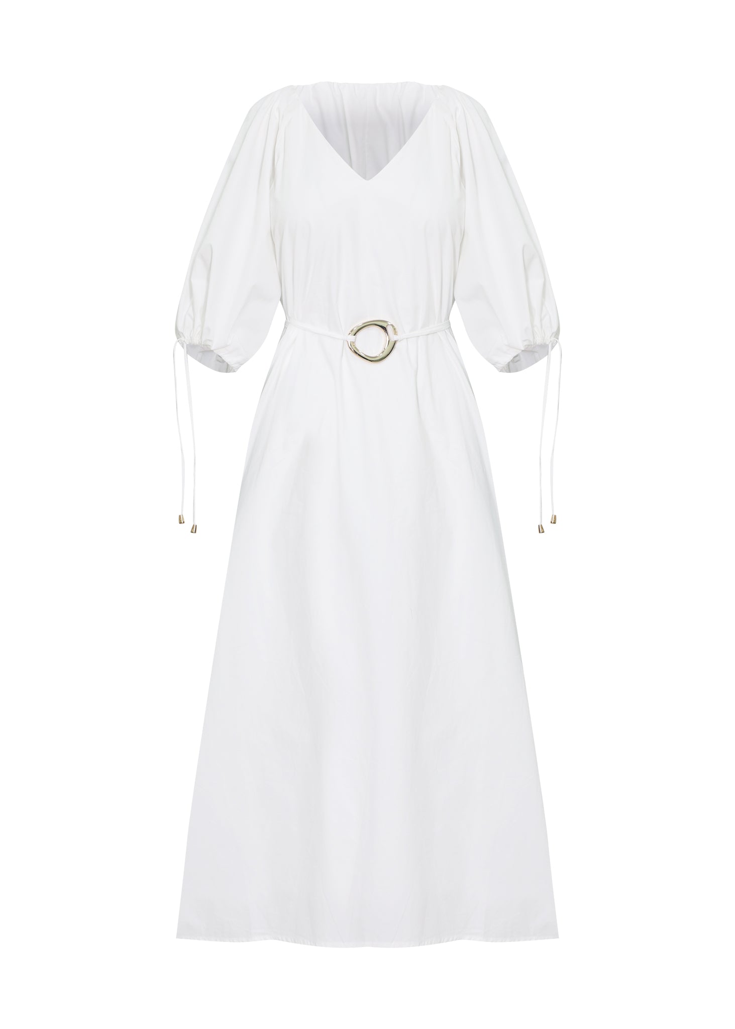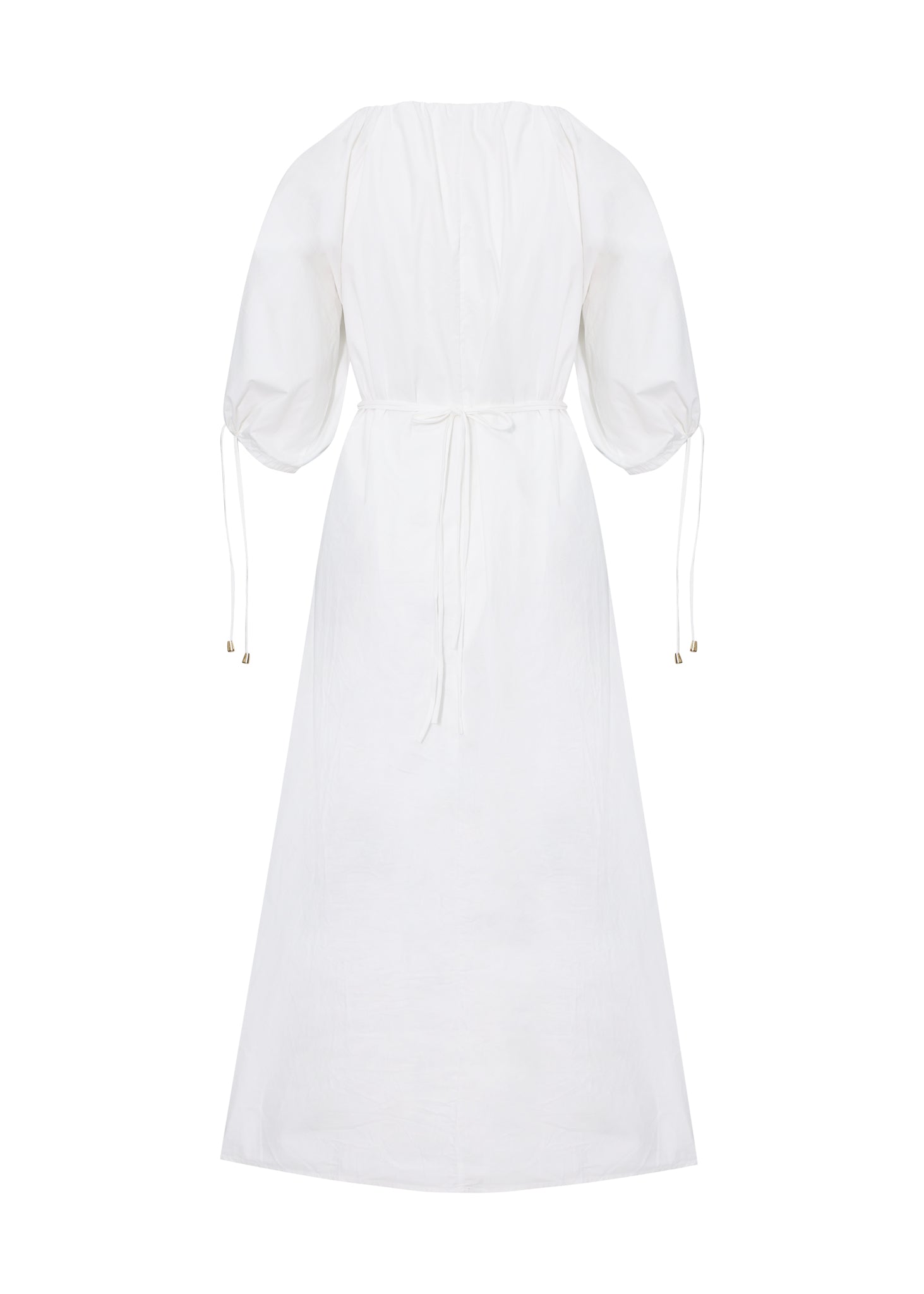Este maxivestido blanco de silueta etérea y romántica está confeccionado en un tejido nítido que aporta una estructura elegante. El diseño integra un cuerpo con escote profundo en "V" enmarcado por mangas abullonadas de estilo globo que generan un volumen dramático y sofisticado en los hombros. La cintura se define mediante un panel ancho de nido de abeja elástico que asegura un ajuste favorecedor, dando paso a una falda escalonada de gran amplitud decorada con jaretas horizontales técnicas que añaden una textura rítmica y artesanal. Como detalle final de diseño, la espalda incorpora un cordón grueso estructural terminado en un nudo artesanal que se desliza sobre la falda, convirtiendo a esta prenda en una pieza escultural ideal para eventos exclusivos.