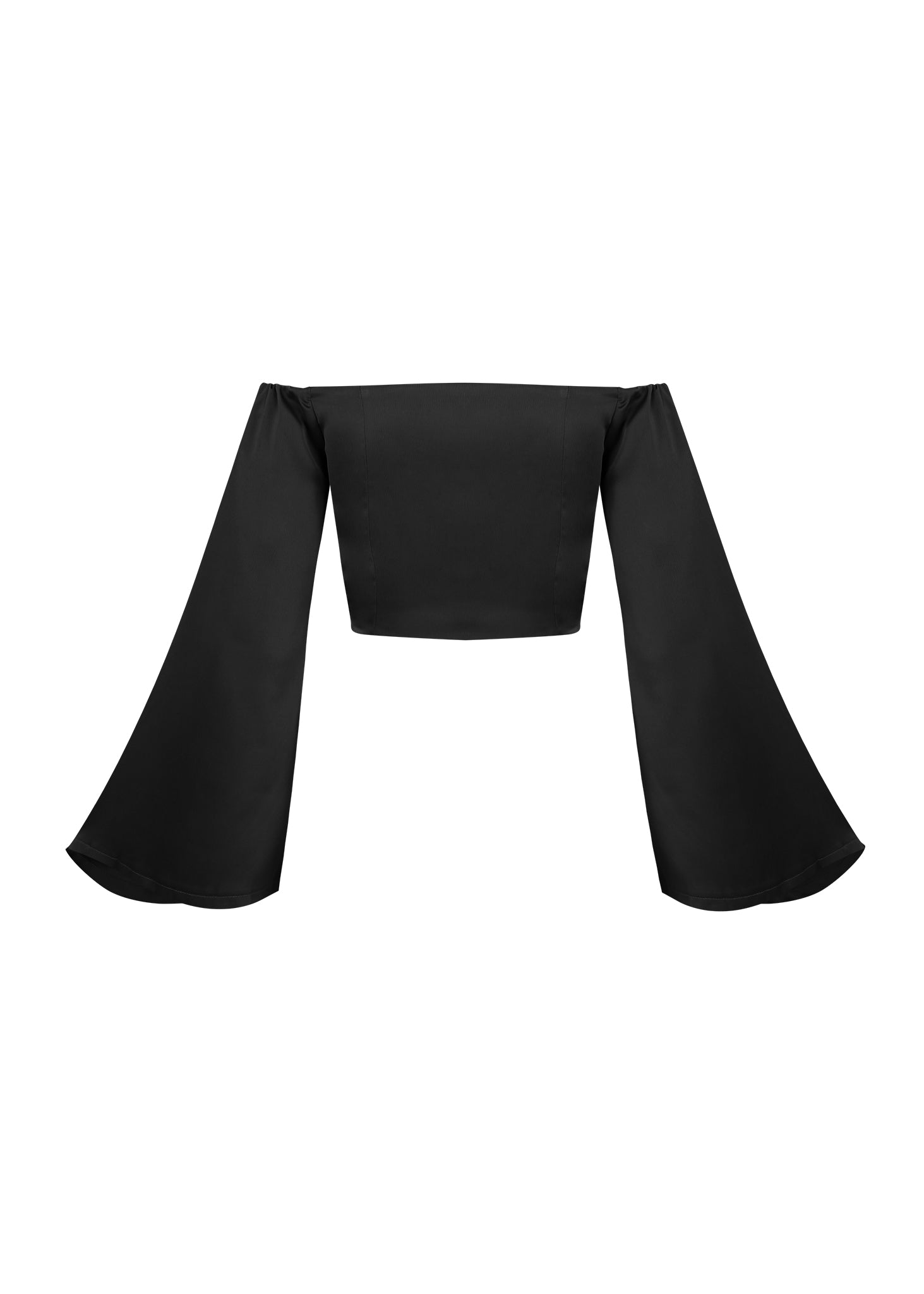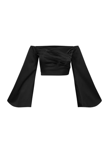 Este top crop negro de manga larga es la pieza perfecta para un look sensual y de noche. Confeccionado en un tejido liso y satinado, presenta un escote pronunciado en V con un detalle fruncido en el centro del busto. El fruncido se ajusta con finos lazos que se anudan en la nuca, creando un efecto halter y permitiendo un ajuste personalizado. Su corte crop y el ajuste entallado lo hacen ideal para combinar con pantalones o faldas de cintura alta