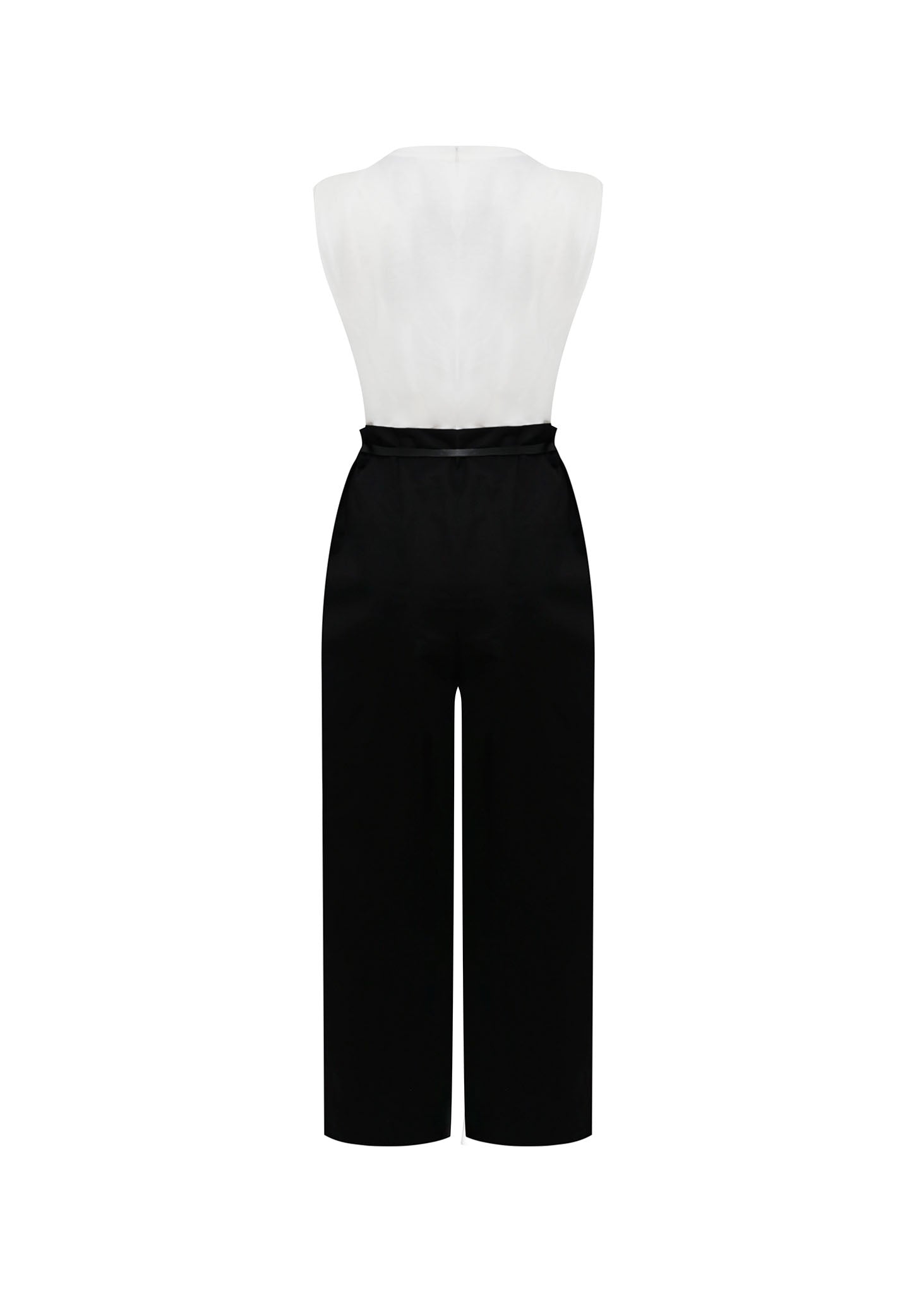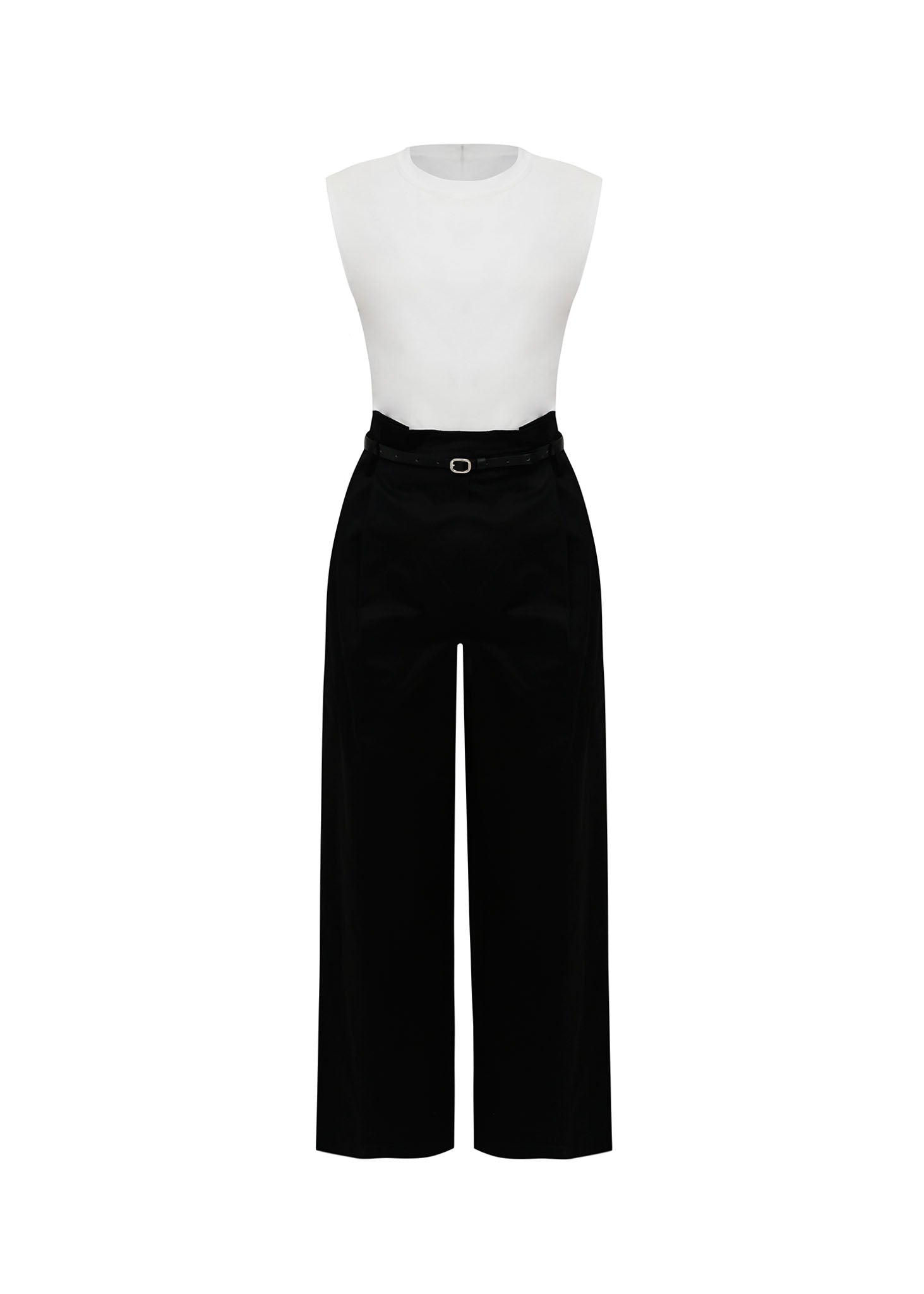 Líneas limpias para una elegancia sin esfuerzo. Este jumpsuit de diseño contemporáneo combina un top blanco impecable de cuello redondo y silueta sin mangas con un pantalón negro de sastre de tiro alto. Su estructura equilibrada y el detalle del cinturón delgado crean una figura estilizada y profesional, ideal para la mujer moderna.