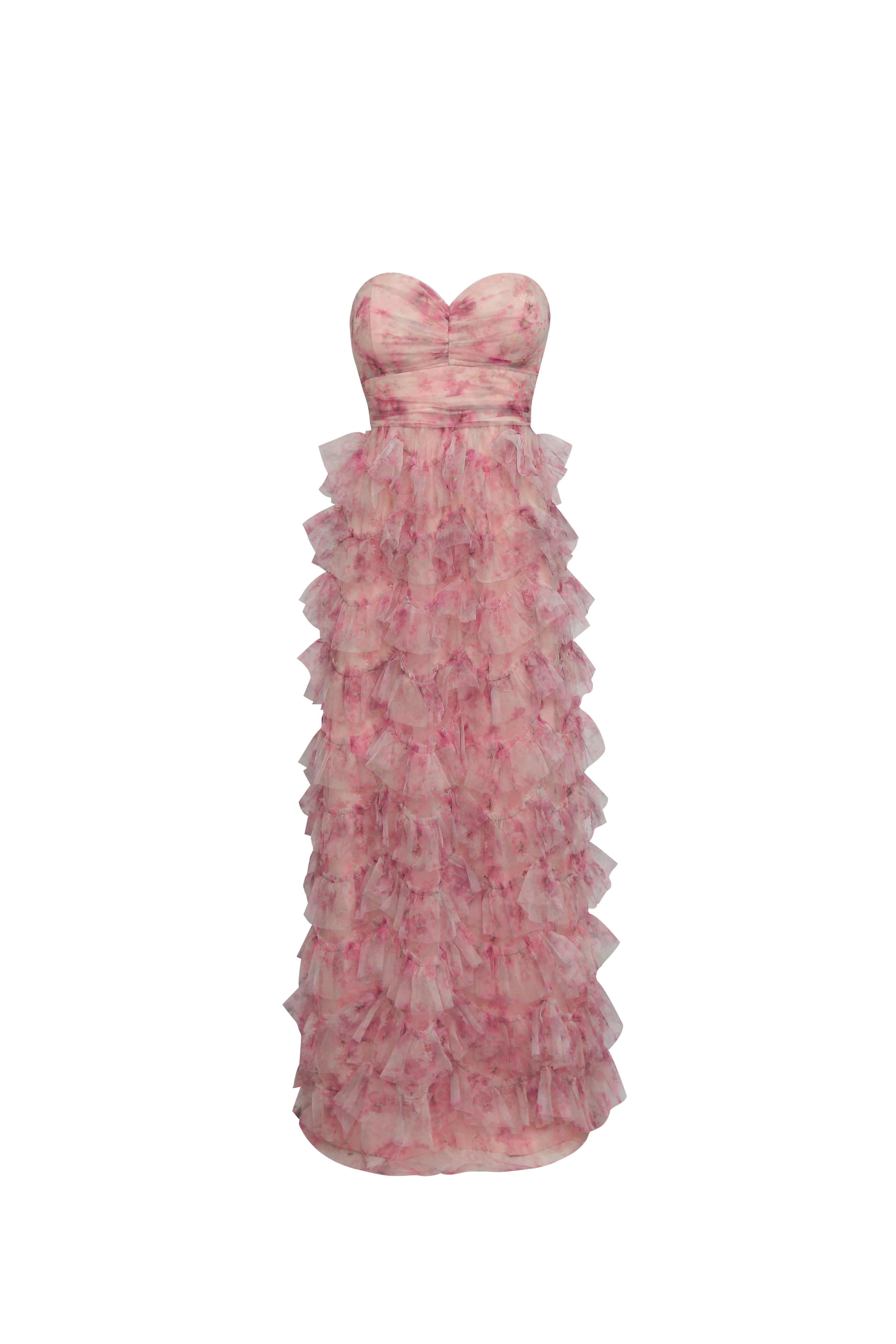 Este vestido de gala es una obra de arte etérea que combina una feminidad clásica con un diseño de texturas maximalistas. La pieza presenta un exquisito escote corazón con un cuerpo drapeado que ciñe la silueta de manera impecable, confeccionado en un tejido con un suave estampado floral en tonos rosados y malvas que evocan un jardín en plena floración. El verdadero protagonismo reside en su falda majestuosa, compuesta por infinitas capas de volantes de tul dispuestos horizontalmente, que crean un efecto de volumen degradado y un movimiento lleno de gracia.