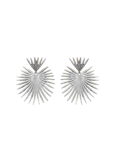 Estos aretes dorados son una pieza única que evoca la belleza y el exotismo de la naturaleza. Su diseño en dos partes presenta un pequeño semicírculo con textura de rayos que se conecta a una pieza principal en forma de abanico, simulando una hoja de palmera o una explosión solar.