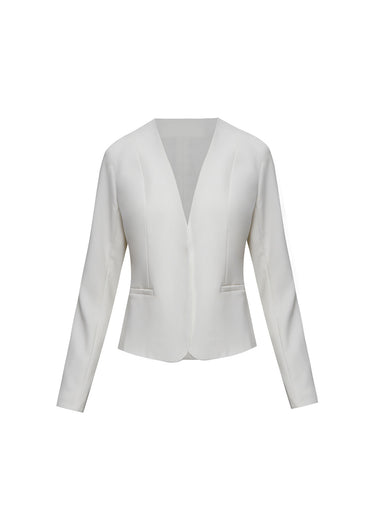 Define la elegancia profesional con esta Chaqueta de Corte Corto (Cropped) y Diseño Impecable en un sofisticado color blanco. Su característica principal es el escote en V sin solapas ni cuello, que ofrece una apariencia moderna y limpia, perfecta para mostrar accesorios o blusas elegantes debajo. Confeccionada con pinzas que garantizan un ajuste entallado y favorecedor, esta chaqueta estructurada es ideal para combinar con pantalones sastre de tiro alto, faldas lápiz o para usar sobre vestidos de cóctel, aportando un toque pulido y contemporáneo a cualquier conjunto formal.