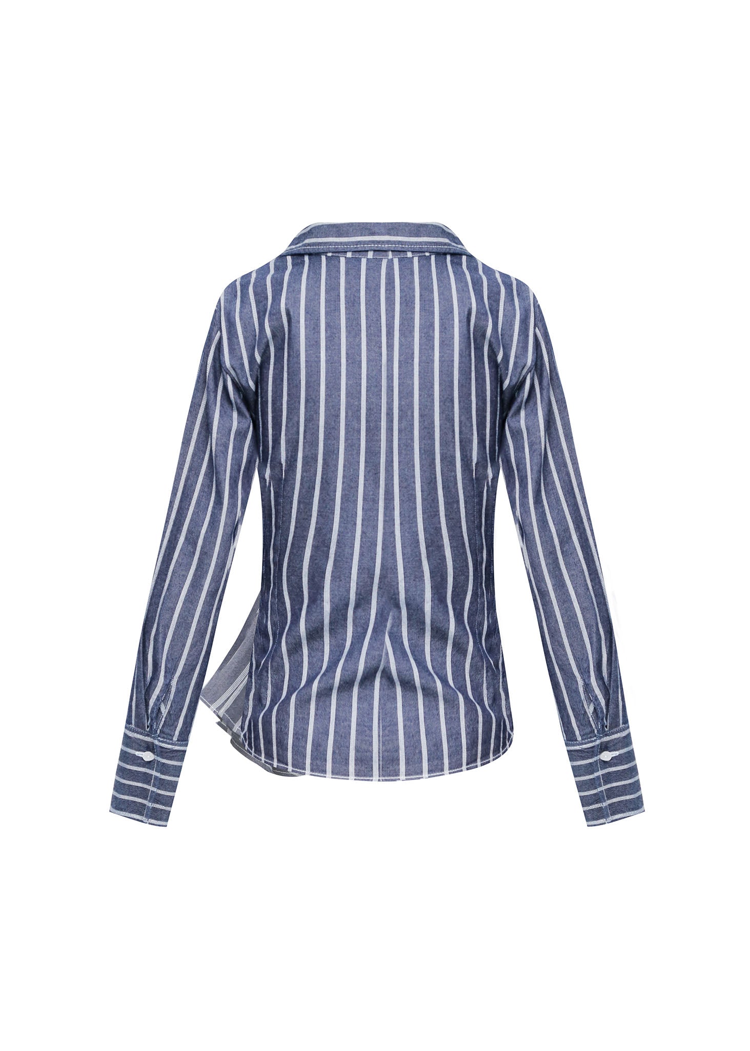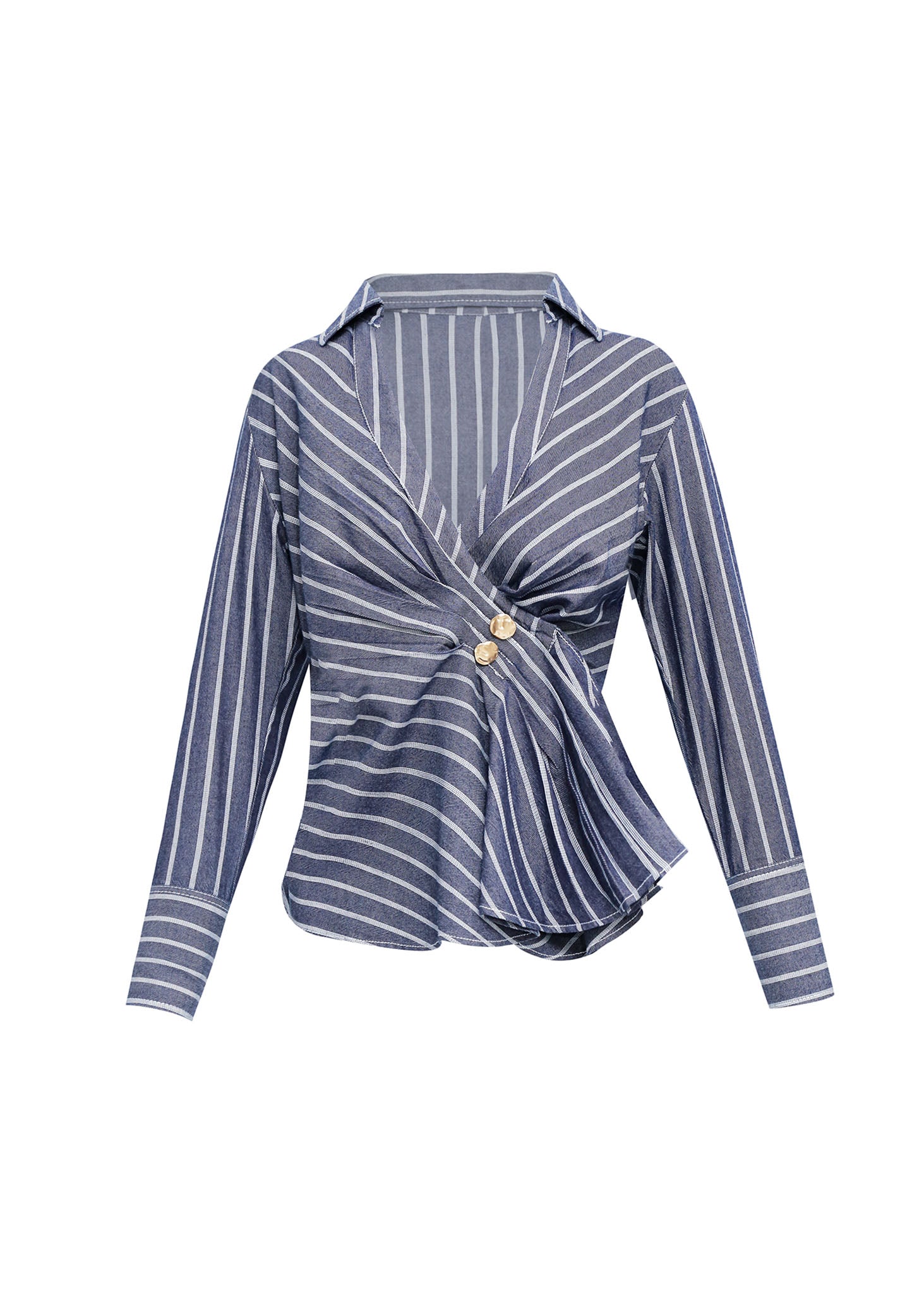 La Blusa Nudo es una pieza de sastrería moderna que transforma la clásica camisa de rayas en un diseño de declaración. Confeccionada en un tejido a rayas azul marino y blanco, presenta un escote en V y un cuello camisero tradicional. Su rasgo más distintivo es el espectacular drapeado frontal asimétrico que se anuda o pliega en la cintura, creando un punto focal dramático y una silueta perfectamente ceñida