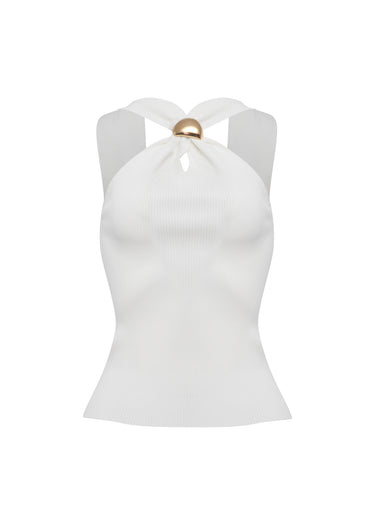 Este top en color blanco óptico es la definición de la elegancia contemporánea. Destaca por su escote cruzado al cuello que se une mediante un exclusivo herraje dorado esférico, creando un punto focal sofisticado que ilumina el rostro.